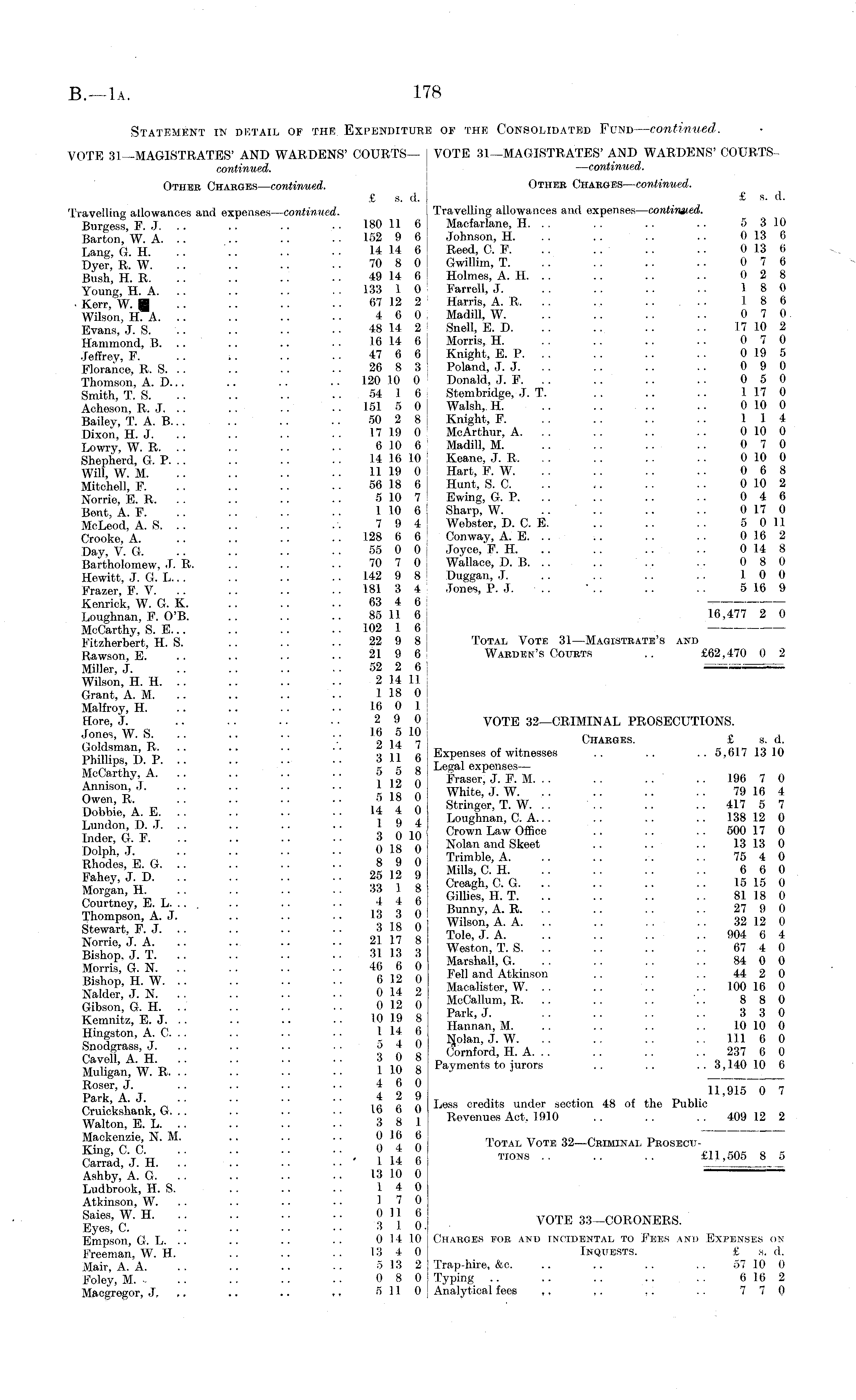 Statement in detail op the Expenditure of the Consolidated Fund — continued. VOTE 31—MAGISTRATES' AND WARDENS' COURTS— VOTE 31—MAGISTRATES' AND WARDENS' COURTScontinued. —continued. Other Charges— continued. Other Charges— continued. £ s. d. , £ s. d. Travelling allowances and expenses— continued. Travelling allowances and expenses— continued. Burgess, F. J. .. .. .. ■■ 180 11 6 Macfarlane, H. .. .. .. .. 5 310 Barton W A .. 152 9 6 ! Johnson, H. .. .. .. .. 013 6 Lang G. H ' 14 14 6 Reed, C. F. . . .. .. .. 013 0 Dyer' R W .. 70 8 0 Gwillim, T. .. . . .. .. 0 7 6 Bush H R .. .. • • 49 14 6 Holmes, A. H. .. .. .. .. 0 2 8 Youna HA 133 1 0 Farrell, J. .. .. .. .. 18 0 •Kerr'w ffl .. 67 12 2 Harris, A. R. .. .. .. ... 18 6 Wilson HA .. .. .. ■■ 460 Madill, W. .. .. .. .. 0 7 0 Evans, J. S. .. .. .. • • 48 14 2 : Snell, E. D. .. .. . . .. 17 10 2 Hammond. B. .. .. .. .. 16 H 6 Morris, H. .. .. .. .. 0 7 0 Jeffrey F. .. .. .. • ■ 47 6 6 Knight, E. P. .. .. .. .. 019 5 Florance, R. S. .. .. .. ■ • 26 8 3 Poland, J. J. .. .. .. .. 0 9 0 Thomson A. D. .. .. .. 120 10 0 Donald, J. F. .. .. .. .. 0 5 0 Smith T S . .. 54 1 6 Stembridge, J. T. . . .. .. 117 0 Acheson, R. J 151 5 0 Walsh,. H 010 0 Bailey, T. A. 8... .. .. .. 50 2 8 Knight, F. . . .. .. .. 114 Dixon H J .. •• 17 19 0 McArthur, A. .. .. .. .. 010 0 Lowry, W. R. . . .. .. • ■ 610 6 Madill, M. .. . . .. .. 0 7 0 Shepherd GP. .. .. • • 14 16 10 Keane, J. R. .. . . .. .. 010 0 Will W M • 11 19 . 0 Hart, F. W. . . . . .. .. 0 6 8 Mitchell F . .. 56 18 6 Hunt, S. C. .. .. .. .. 010 2 Norrie, E. R .. .. 510 7 Ewing, G. P. .. 0 4 6 Bent A. F .. .. 110 6 Sharp, W. .. .. .. .. 017 0 McLeod AS .. .. .. 7 9 4 Webster, D. C. E. .. .. .. 5 0 11 Crooke A .. .. 128 6 6 Conway, A. E. .. .. . . . . 0 16 2 Day, V. G. .. .. .. •• 55 0 0 Joyce, F. H. .. .. .. .. 014 8 Bartholomew, J. R. .. .. .. 70 7 0 Wallace, D. B. .. .. .. . . 0 8 0 Hewitt, J. G. L .. .. 142 9 8 Duggan, J 10 0 Frazer FV. .. .. .. 181 3 4 Jones, P. J. .. " .. .. .. 516 9 Kenrick, W. G. K. .. .. .. 63 4 6 Loughnan, F. OB 85 11 6 j 16,477 2 0 McCarthy, S. E... .. .. .. 102 1 6 i t'itzherbert, U.S. .. .. .. 22 9 8 Total Vote 31 —Magistrate's and Rawson, E. .. .. .. •• 21 9 6 Warden's Courts .. £62,470 0 2 Miller, J. .. .. .. .. 52 2 6 =-— Wilson, H. H. .. .. .. .. 214 11 Grant, A. M. .. .. .. .. 118 0 Malfroy, H. .. .. .. .. 16 0 1 Hore, J. .. .. .. ■ • 2 9 0| VOTE 32—CRIMINAL PROSECUTIONS. J , on -' W - S R ,; l \*™' Charges. £ s. d. 81 ™ ,„ I i Expenses of witnesses 5,617 13 10 >" I Legal expensesMcCarthy- A ! Fraserf J. F. M ' .. 196 7 0 nnlso "' J i o X ! White, J. W 79 16 4 O\ en ; R- 14 4 0 i Stringer, T. W. . . 417 5 7 pobbie,A.E. 14 4 0 L | c A 138 12 0 Lundon D..T 19 4 Cro | n Law office 500 17 0 s?Tt' T ft is ft Nolan and Skeet 13 13 0 J - _ I I 0 Trimble, A 75 4 0 £v W 12 Q Mills, C.H 6 6 0 25 12 9 15 15 Q Morgan, H 33 1 8 | 81 18 0 Courtney, EL . 4 4 6 A _ R 27 9 0 Thompson, A. J ' 3 J Wilson, A. A 32 12 0 Stewart FJ 3 8 0 ; A 904 6 4 Nome, J A. 217 8 67 4 0 J-T. 11 U I Marshall, G 84 0 0 M T IS 112 ft Fell and Atkinson 44 2 0 6 2 0 M lit w 100 16 0 Nalder.J.K. ~ 0 4 2 ' . Gibson, G. H. .. .. . . .. 0 Yl 0 ' Kemmtz, E J 10 19 8 M 10 10 0 Kingston, AC 114 6 jj olan j. w 11l 6 0 P ifT'w I 0 8 Cornford, H. A 237 6 0 SnwE.:: :: :: :: iw I p^menU * ojurors w»w_* Roser, J. . . . . .. ..460 .. q . n a,v . ', ~/,■' " Iβ X n Less credits under section 48 of the Public w U u t?t S8 ? Revenues Act, 1910 409 12 2 Walton, E. L. .. .. .. • ■ 3 8 1 Mackenzie, N. M 0 16 6 32-Criminal Prosecti-" ' Carrad, J. H. . . .. .. . • 1 14 b _!_ Ashby, A. G. . . .. .. .. 13 10 0 Ludbrook, H. S. .. .. • • 14 0 Atkinson, W. .. .. .. . • 17 0 aies '^- H V\ V\ VOTE 33-CORONERS. ' Eyes, C. .. . • • ■ • ■ .! I. o.[ Empson, G. L. .. .. •• •• 0 14 10 Charges foe and incidental to Fees and Expenses on Freeman, W. H. .. ■• ■• 13 4 0 Inquests. £ s. d. Vlair A A .. 5 13 2 \ Trap-hire, &c. .. .. .. .. 57 10 0 Foley, M. .. 0 8 0! Typing 6 16 2 Macgregor, J. .. .. .. 5 110] Analytical fees ~ ~ ~ .. 770