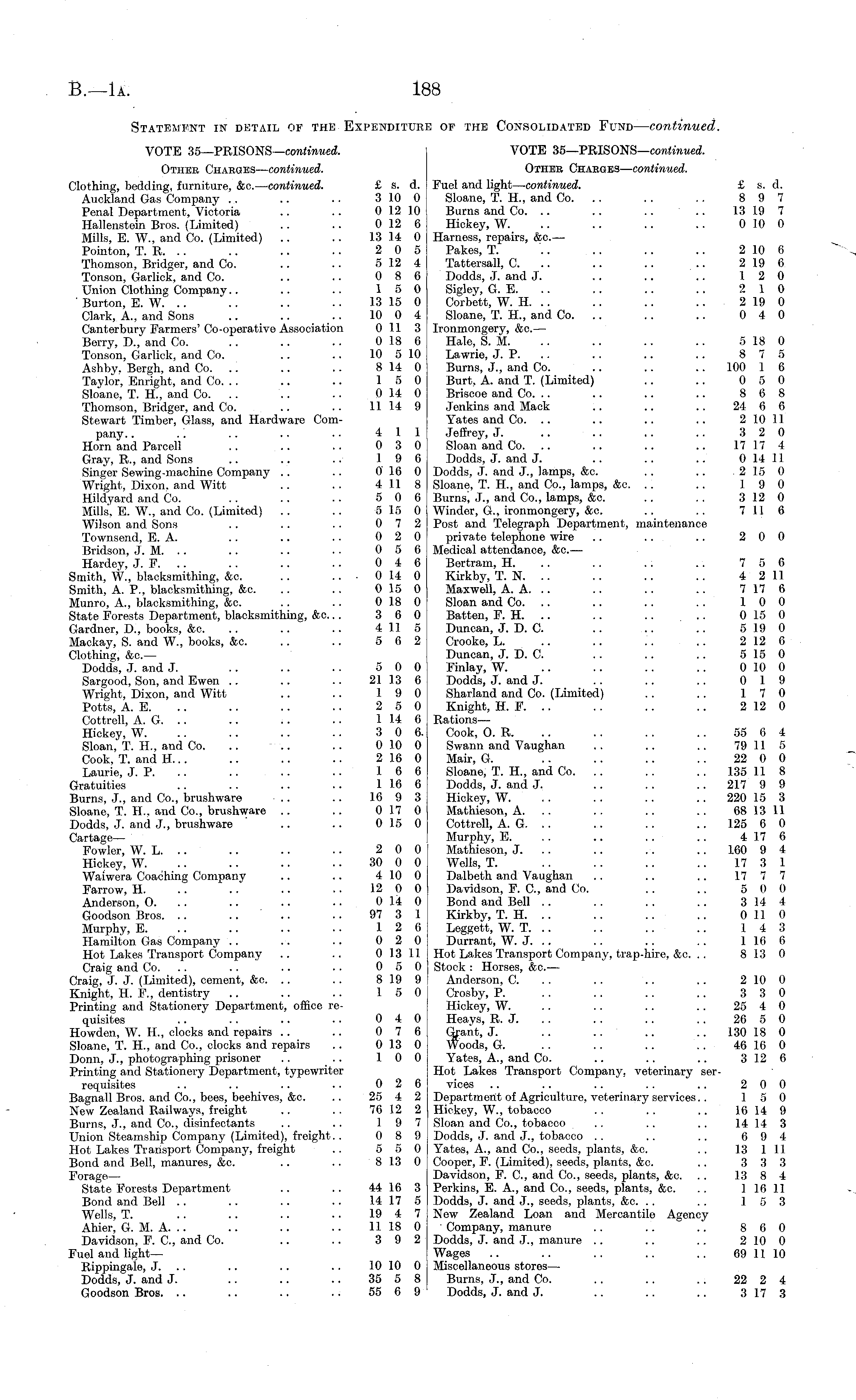 Statement in detail of the Expenditure of the Consolidated Fund — continued. VOTE 35—PRISONS— continued. VOTE 35—PRISONS— continued. Other Charges— continued. Other Charges— continued. Clothing, bedding, furniture, &c. — continued. £ s. d. Fuel and light— continued. £ s. d. Auckland Gas Company .. .. .. 310 0 Sloane, T. H., and Co. .. .. .. 8 9 7 Penal Department, Victoria .. .. 012 10 Burns and Co. .. .. .. .. 13 19 7 Hallenstein Bros. (Limited) .. .. 012 6 Hickey, W. .. .. .. .. 010 0 Mills, E. W., and Co. (Limited) .. .. 13 14 0 Harness, repairs, &c— Pointon, T. R. .. .. .. .. 2 0 5 Pakes, T. .. .. .. .. 210 6 Thomson, Bridger, and Co. .. .. 512 4 Tattersall, C. .. .. .. .. 219 6 Tonson, Garlick, and Co. .. .. 0 8 6 Dodds, J. and J. .. .. ' .. 12 0 Union Clothing Company.. .. .. 15 0 Sigley, G. E. .. .. .. .. 2 10 ' Burton, E. W. .. .. .. .. 13 15 0 Corbett, W. H. .. .. .. .. 2 19 0 Clark, A., and Sons .. .. . . 10 0 4 Sloane, T. H., and Co. .. .. .. 0 4 0 Canterbury Farmers' Co-operative Association 0 11 3 Ironmongery, &c. — Berry, D., and Co. .. .. .. 018 6 Hale, S. M. .. .. .. .. 518 0 Tonson, Garlick, and Co. .. .. 10 510 Lawrie, J. P. .. .. .. 8 7 5 Ashby. Bergh, and Co. .. .. .. 814 0 Burns, J., and Co. .. .. 100 1 6 Taylor, Enright, and Co. .. .. .. 15 0 Burt. A. and T. (Limited) .. .. 0 5 0 Sloane, T. H., and Co. .. .. .. 0 14 0 Briscoe and Co. .. .. .. .. 8 (i 8 Thomson, Bridger, and Co. .. .. 11 14 9 Jenkins and Mack .. .. .. 24 6 6 Stewart Timber, Glass, and Hardware Com- Yates and Co. .. .. .. .. 2 10 11 pany.. .. .. .. . ■ 4 11 Jeffrey, J. .. .. .. .. 3 2 0 Horn and Parcell .. .. .. 0 3 0 Sloan and Co. .. .. .. .. 17 17 4 Gray, R., and Sons .. .. .. 19 6 Dodds, J. and J. .. .. .. 014 11 Singer Sewing-machine Company .. .. 016 0 Dodds, J. and J., lamps, &c. .. .. 215 0 Wright, Dixon, and Witt .. .. 4 11 8 Sloane, T. H., and Co., lamps, &c. .. .. 19 0 Hildyard and Co. .. .. .. 5 0 6 Burns, J., and Co., lamps, &c. .. .. 3 12 0 Mills, E. W., and Co. (Limited) .. .. 515 0 Winder, G., ironmongery, &c. .. .. 711 6 Wilson and Sons .. .. . . 0 7 2 Post and Telegraph Department, maintenance Townsend, E. A. .. .. . • 0 2 0 private telephone wire .. .. .. 2 0 0 Bridson, J. M. .. .. .. • ■ 0 5 6 Medical attendance, &c.— Hardey, J. F. .. .. .. .. 0 4 6 Bertram, H. .. . . .. .. 7 5 6 Smith, W., blacksmithing, &c. .. ... 014 0 Kirkby, T. N. .. .. .. .. 4 211 Smith, A. P., blacksmithing, &c. .. .. 015 0 Maxwell, A. A. .. .. .. .. 7 17 6 Munro, A., blacksmithing, &o. .. .. 018 0 Sloan and Co. .. .. .. . . 10 0 State Forests Department, blacksmithing, &c... 3 6 0 Batten, F. H. .. .. .. .. 015 0 Gardner, D., books, &c. .. .. .. 4 115 Duncan, J. D. C. .. .. .. 519 0 Mackay, S. and W., books, &c. .. .. 5 6 2 Crooke, L. .. .. .. .. 212 6 Clothing, &c— Duncan, J. D. C. .. .. .. 515 0 Dodds, J. and J. .. .. .. 5 0 0 Finlay, W. .. .. .. .. 010 0 Sargood, Son, and Ewen .. .. .. 21 13 6 Dodds, J. and J. .. .. .. 0 19 Wright, Dixon, and Witt .. .. 19 0 Sharland and Co. (Limited) .. .. 17 0 Potts, A. E. .. .. .. .. 2 5 0 Knight, H. F. .. .. .. .. 2 12 0 Cottrell, A. G. .. .. .. .. 114 6 Rations— Hickey, W. .. .. .. . • 3 0 6. Cook, O. R. .. .. .. .. 55 6 4 Sloan, T. H., and Co. .. .. .. 0 10 0 Swarm and Vaughan .. .. .. 79 11 5 Cook, T. and H... .. .. .. 216 0 Mair, G. .. .. .. .. 22 0 0 Laurie, J. P. .. .. .. •• 16 6 Sloane, T. H., and Co. .. .. .. 135 11 8 Gratuities .. .. .. .. 116 6 Dodds, J. and J. .. .. 217 9 9 Burns, J., and Co., brushware .. .. 16 9 3 Hickey, W. .. .. .. 220 15 3 Sloane, T. H.. and Co., brushware .. .. 017 0 Mathieson, A. .. .. .. .. 68 13 11 Dodds, J. and J., brushware ' .. .. 015 0 Cottrell, A. G. .. .. .. 125 6 0 Cartage— Murphy, E. .. .. . . .. 417 6 Fowler, W. L. .. .. .. .. 2 0 0 Mathieson, J. .. .. .. 160 9 4 Hickey, W. .. .. .. ■ • 30 0 0 Wells, T. .. .. .. .. 17 3 1 Waiwera Coaching Company .. .. 410 0 Dalbeth and Vaughan .. .. .. 17 7 7 Farrow, H. .. .. .. .. 12 0 0 Davidson, F. C, and Co. .. .. 5 0 0 Anderson, 0. .. .. .. 0 14 0 Bond and Bell .. .. .. .. 3 14 4 Goodson Bros. .. .. .. .. 97 3 1 Kirkby, T. H. .. .. .. .. 011 0 Murphy, E. .. .. .. .. 12 6 Leggett, W. T. .. .. .. .. 14 1) Hamilton Gas Company .. .. .. 0 2 0 Durrant, W. J. .. .. .. .. 116 6 Hot Lakes Transport Company .. .. 013 11 Hot Lakes Transport Company, trap-hire, &c. .. 813 0 Craig and Co. .. .. .. .. 0 5 0 Stock : Horses, &c.— Craig, J. J. (Limited), cement, &c. .. .. 819 9 Anderson, C. .. .. .. .. 210 0 Knight, H. F., dentistry .. .. .. 15 0 Crosby, P. .. .. .. .. 3 3 0 Printing and Stationery Department, office re- Hickey, W. .. .. . . .. 25 4 0 qulsites .. .. .. .. 0 4 0 Heays, R. J. .. .. .. .. 26 5 0 Howden, W. H., clocks and repairs .. .. 0 7 6 Grant, J. .. .. .. 130 18 0 Sloane, T. H., and Co., clocks and repairs .. 013 0 Woods, G. .. .. .. .. 46 16 0 Dorm, J., photographing prisoner .. .. 10 0 Yates, A., and Co. .. .. .. 312 6 Printing and Stationery Department, typewriter Hot Lakes Transport Company, veterinary serrequisites .. . . . . .. 0 2 6 vices .. .. .. .. .. 200 Bagnall Bros, and Co., bees, beehives, &c. .. 25 4 2 Department of Agriculture, veterinary services.. 15 0 New Zealand Railways, freight .. .. 76 12 2 Hickey, W., tobacco .. .. .. 16 14 9 Burns, J., and Co., disinfectants .. .. 19 7 Sloan and Co., tobacco .. .. .. 14 14 3 Union Steamship Company (Limited), freight.. 0 8 9 Dodds, J. and J., tobacco .. .. .. 6 9 4 Hot Lakes Transport Company, freight .. 5 5 0 Yatos, A., and Co., seeds, plants, &c. .. 13 111 Bond and Bell, manures, &c. .. .. 813 0 Cooper, F. (Limited), seeds, plants, &c. .. 3 3 3 Forage— Davidson, F. C, and Co., seeds, plants, &c. 13 8 4 State Forests Department .. .. 44 16 3 Perkins, E. A., and Co., seeds, plants, &c. .. 116 11 Bond and Bell .. .. .. .. 14 17 5 Dodds, J. and J., seeds, plants, &c. .. . . 15 3 Wells, T. .. .. .. . . 19 4 7 New Zealand Loan and Mercantile Agency Ahier, G. M. A. .. .. .. .. 