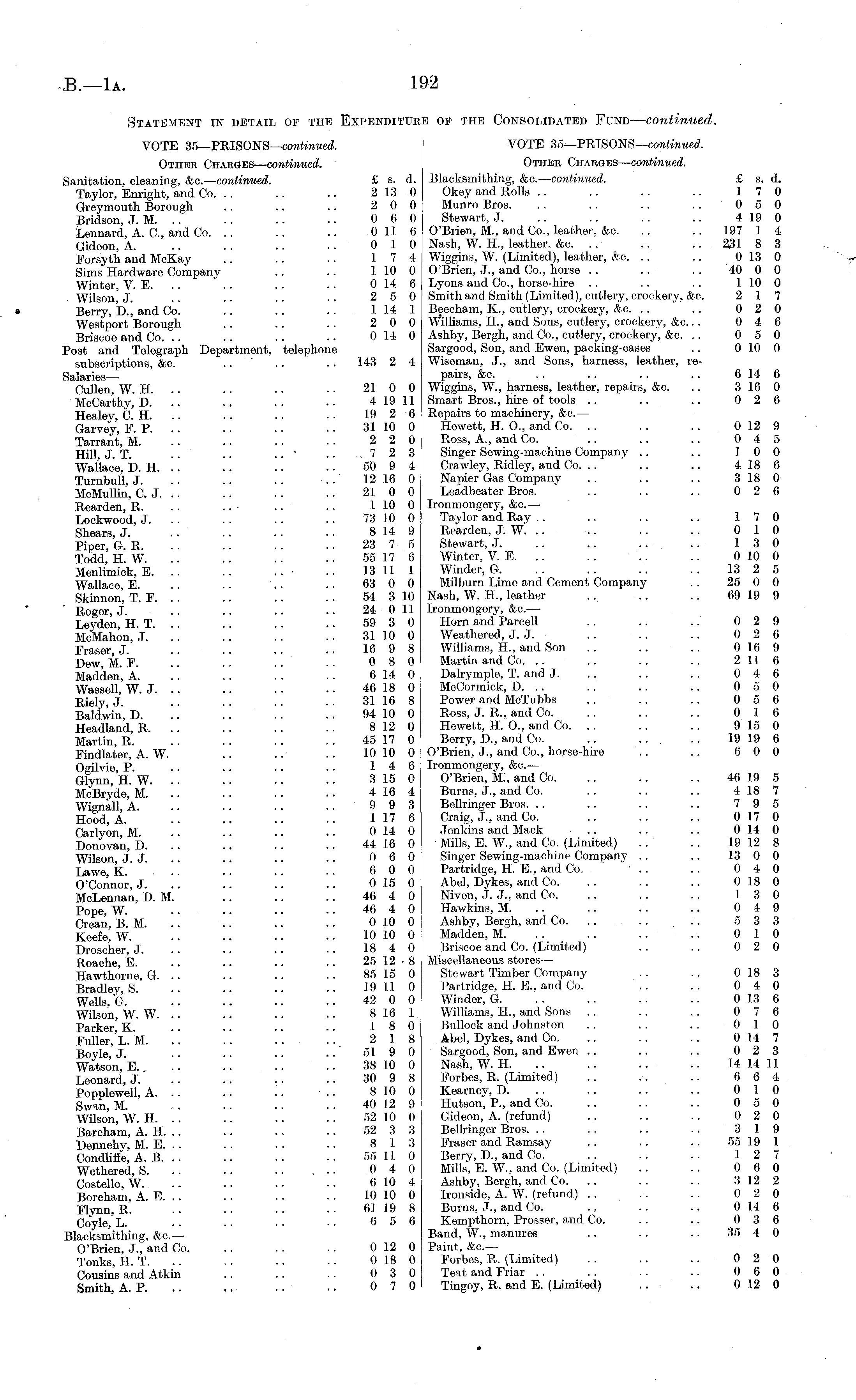 Statement in detail of the Expenditure op the Consolidated Fund— continued. VOTE 35—PRISONS— continued. VOTE 35—PRISONS— continued. Othek Charges— continued. Other. Charges— continued. Sanitation, cleaning, &c— continued. & s. d. Blacksrnithing, &c. —continued. £ s. d. Taylor, Enright, and Co. .. .. .. 213 0 Okey and Rolls .. .. .. .. 17 0 Greymouth Borough .. .. .. 2 0 0 Munro Bros. .. .. . . .. 0 5 0 Bridson, J. M. .. .. .. .. 0 6 0 Stewart, J. .. .. .. .. 419 0 Lennard A C and Co .. . .. 011 6 O'Brien, M., and Co., leather, &c. .. .. 197 1 4 Gideon, A. .. . . . . .. 0 10 Nash, W. H., leather, &c. .. .. .. 231 8 3 Forsyth and McKay .. .. .. 17 4 Wiggins, W. (Limited), leather, ftc .. .. 013 0 Sims Hardware Company .. .. 110 0 O'Brien, J., and Co., horse .. .. .. 40 0 0 Winter V. E. .. .. .. • • 014 6 Lyons and Co., horse-hire .. .. .. 110 0 . Wilson,' J. . . .. .. .. 25 0 Smith and Smith (Limited), cutlery, crockery, &c. 217 Berry, D., and Co. .. .. .. 114 1 Beecham, X., cutlery, crockery, &c. .. .. 0 2 0 Westport Borough .. .. .. 2 0 0 Williams, H., and Sons, cutlery, crockery, &c... 0 4 6 Briscoe and Co. .. .. .. .. 0 14 0 Ashby, Bergh, and Co., cutlery, crockery, &c. .. 0 5 0 Post and Telegraph Department, telephone Sargood, Son, and Ewen, packing-cases .. 0 10 0 subscriptions, &c. . . .. .. 143 2 4 Wiseman, J., and Sons, harness, leather, reSalaries— pairs, &c. .. . . .. .. 614 6 Cullen, W. H. .. .. .. .. 21 0 0 Wiggins, W., harness, leather, repairs, &c. .. 316 0 McCarthy, D. .. .. .. 419 11 Smart Bros., hire of tools .. .. .. 0 2 6 Healey C H . . .. .. 19 2 6 Repairs to machinery, &c.— Garvey, F. P. . . .. .. 31 10 0 Hewett, H. 0., and Co. .. .. .. 012 9 Tarrant, M. . . .. .. .. 2 2 0 Ross, A., and Co. .. .. .. 0 4 5 Hill J. T. .. .. ' • • 7 2 3 Singer Sewing-machine Company .. .. 10 0 Wallace, D. H. .. .. .. .. 50 9 4 Cra.wley, Ridley, and Co. .. .. .. 418 6 Turnbull, J. .. .. .. .. 12 16 0 Napier Gas Company .. .. .. 318 0 McMullin, C. J. .. .. .. .. 21 0 0 Leadbeater Bros. .. .. .. 0 2 6 Rearden, R. .. . .■■ .. .. 110 0 Ironmongery, &c— Lockwood, J. .. .. .. 73 10 0 Taylor and Ray .. .. .. .. 17 0 Shears, J. .. .. .. .. 814 9 Rearden, J. W. .. .. .. . . 0 10 Piper, G. R. . . .. .. .. 23 7 5 Stewart, J. .. .. .. .. 13 0 Todd HW. .. .. •• 55 17 6 Winter, V. E. .. .. .. .. 010 0 Menlimick, E. .. .. .. ■ .. 13 11 1 Winder, G. .. .. .. .. 13 2 5 Wallace E 63 0 0 Milburn Lime and Cement Company .. 25 0 0 Skinnon', T. P. '.'. '.'. '.'■ ■■ 54 310 Nash, W. H., leather .. .. .. 69 19 9 Roger, J. .. .. .. .. 24 011 Ironmongery, &c.— Leyden, H. T. .. .. .. .. 59 3 0 Horn and Parcell .. .. .. 0 2 9 McMahon, J. .. .. .. 31 10 0 Weathered, J. J. .. .. .. 0 2 6 Eraser, J. . . .. .. .. 16 9 8 Williams, H., and Son .. .. .. 016 9 Dew, M. F. .. .. .. .. 0 8 0 Martin and Co. .. .. .. .. 211 6 Madden, A. .. .. .. .. 614 0 Dalrymple, T. and J. .. .. .. 0 4 6 Wassell, W. J. .. .. .. .. 46 18 0 McCormick, D. .. .. .. .. 0 5 0 Riely, J. .. .. .. . • 31 16 8 Power and McTubbs .. .. .. 0 5 6 Baldwin, D. .. .. .. .. 94 10 0 Ross, J. R., and Co. .. .. .. 0 16 Headland, R. .. .. .. .. 812 0 Howett, H. 0., and Co. .. .. .. 915 0 Martin, R. .. .. .. .. 45 17 0 Berry, D., and Co. .. ... .. 19 19 6 Findlater, A. W. .. .. .. 10 10 0 O'Brien, J., and Co., horse-hire .. .. 6 0 0 Ogilvie, P. .. . . . . . • 14 6 Ironmongery, &c— Glynn, H. W. .. .. .. .. 315 0 O'Brien, Mi, and Co. .. .. .. 46 19 5 Mcßryde, M. .. .. .. .. 416 4 Burns, J., and Co. .. .. .. 418 7 Wignall A .. .. .. .. 993 Beilringer Bros. .. .. .. .. 7 9 5 Hood, A. .. .. .. .. 117 6 Craig, J., and Co. .. .. .. 017 0 Carlyon M .. .. .. .. 014 0 Jenkins and Mack .. .. .. 014 0 Donovan, D. .. .. .. .. 44 16 0 Mills, E. W., and Co. (Limited) .. .. 19 12 8 Wilson J. J. .. .. .. i. 0 6 0 Singer Sewing-machine Company .. .. 13 0 0 Lawe, K. , .. .. .. .. 6 0 0 Partridge, H. E., and Co. .. .. 0 4 0 O'Connor, J. .. .. .. 015 0 Abel, Dykes, and Co. .. .. .. 018 0 McLennan, D. M. .. .. .. 46 4 0 Niven, J. J., and Co. .. .. .. 13 0 Pope, W. .. .. .. .. 46 4 0 Hawkins, M. .. .. .. .. 0 4 9 Crean b' M. .. .. .. .. 010 0 Ashby, Bergh, and Co. .. .. .. 5 3 3 Keefe, W. .. .. .. ■ • 10 10 0 Madden, M. . . . . .. .. 0 10 Droscher, J. .. .. .. .. 18 4 0 Briscoo and Co. (Limited) .. .. 0 2 0 Roaohe, E. .. .. .. .. 25 12 • 8 Miscellaneous storesHawthorne, G. .. .. .. .. 85 15 0 Stewart Timber Company .. .. 018 3 Bradley S . .. .. .. 19 11 0 Partridge, H. E., and Co. .. .. 0 4 0 Wells, G. .. .. .. .. 42 0 0 Winder, G. .. .. .. .. 013 6 Wilson, W. W. .. .. .. .. 816 1 Williams, H., and Sons .. .. .. 0 7 6 Parker,' K. .. .. .. .. 18 0 Bullock and Johnston .. .. .. 0 10 Fuller,'L. M. .. .. .. 2 18 Abel, Dykes, and Co. .. .. .. 014 7 Boyle J . 51 9 0 Sargood, Son, and Ewen .. .. .. 0 2 3 Watson.'E 38 10 0 Nash, W. H 14 14 11 Leonard, J. .. .. .. .. 30 9 8 Forbes, R. (Limited) .. .. .. 6 6 4 Popplewell, A. .. .. .. .. 810 0 Kearney, D. .. .. .. .. 0 10 Swtn, M. .. .. -. •• 40 12 9 Hutson, P., and Co. .. .. .. 0 5 0 Wilson W. H. .. .. .. .. 52 10 0 Gideon, A. (refund) .. .. .. 0 2 0 Barcham, A. H. .. .. .. .. 52 3 3 Bellringer Bros. .. ... . .. 3 19 Dennehy M. E. .. .. . . .. 8 13 Fraser and Ramsay .. .. .. 55 19 1 Condlifi'e, A. B. .. .. .. .. 55 11 0 Berry, D., and Co. .. .. .. 12 7 Wethered, S. .. .. 0 4 0 Mills, E. W., and Co. (Limited) .. . . 0 6 0 Costello, W.. .. .. .. .. 610 4 Ashby, Bergh, and Co. .. .. .. 312 2 Boreham AE. .. .. .. .. 10 10 0 Ironside, A. W. (refund) .. .. .. 0 2 0 Flynn, R. .. .. 61 19 8 Burns, J., and Co. ~ .. .. 014 6 Coyle, L. . • •. • • ■•6 5 6 Kempthorn, Pressor, and Co. .. .. 03 6 Blacksmithing, &c— Band, W., manures .. .. .. 35 4 0 O'Brien, J., and Co. .. .. .. 012 0 Paint, &c— Tonks, H. T. .. . . .. .. 018 0 Forbes, R. (Limited) .. .. .. 0 2 0 Cousin's and Atkin .. .. .. 0 3 0 Teat and Friar .. . . .. .. 0 6 0 Smith, A. P. .. .. .. .. 0 7 0 Tingey, R. and E. (Limi