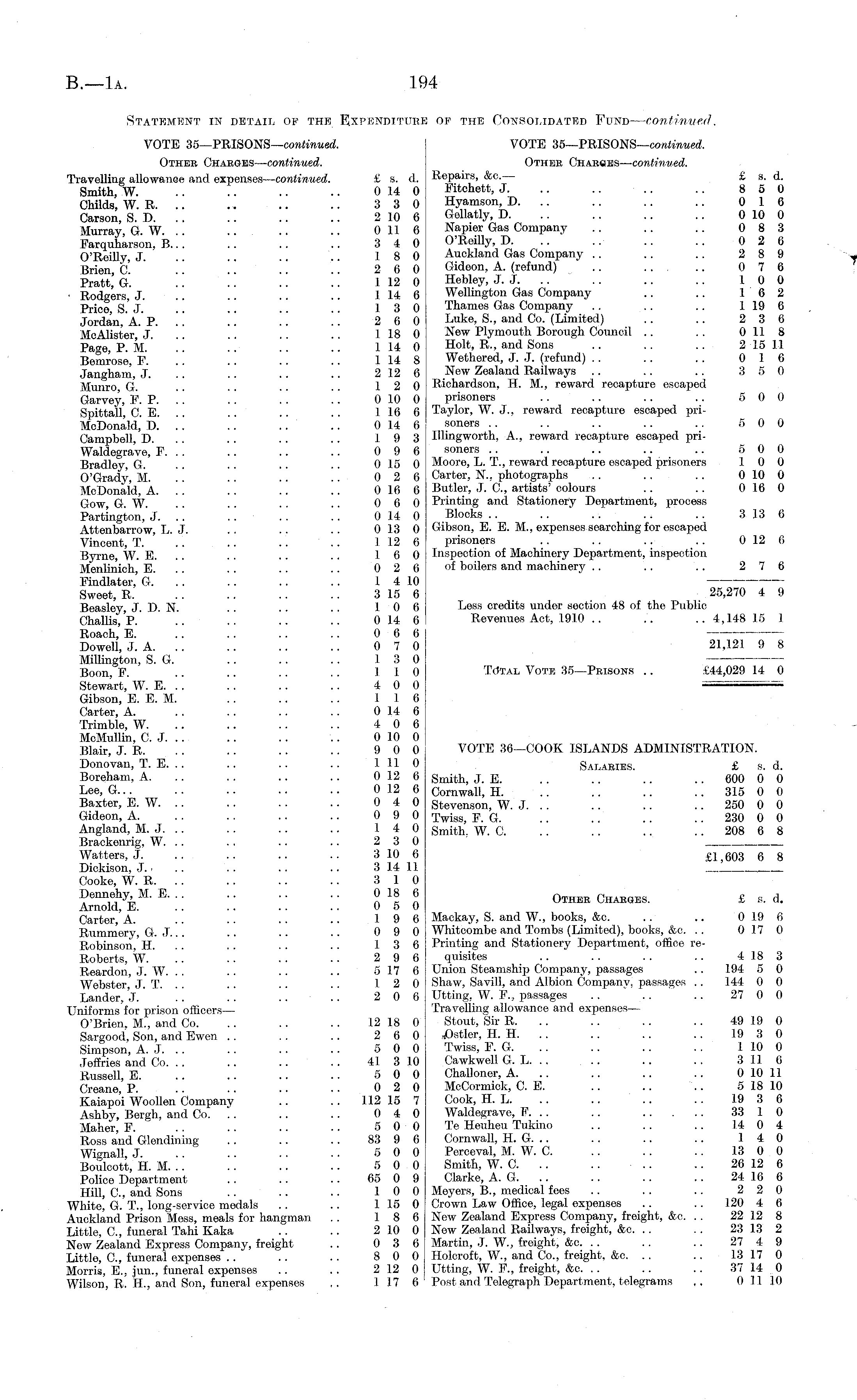Statement in detail of the Expenditure of the Consolidated Fund — continued. VOTE 35—PRISONS— continued. VOTE 35—PRISONS— continued. Other Charges— continued. Other Charoes — continued. Travelling allowance and expenses— continued. £ s. d. Repairs, &c.— £ s. d. Smith, W. .. .. .. .. 014 0 Fitchett, J. .. .. .. .. 8 5 0 Childs, W. R. .. .. .. .. 3 3 0 Hyamson, D. .. .. .. 0 16 Carson, S. D. . . .. .. .. 210 6 Gellatly, D. .. .. .. .. 010 0 Murray, G. W. .. .. .. .. 011 6 Napier Gas Company .. .. .. 0 8 3 Farquharson, 8... .. .. .. 3 4 0 O'Reilly,!). .. .. .. .. 0 2 6 O'Reilly, J. .. .. .. .. 18 0 Auckland Gas Company .. .. .. 28 9 Brien, c. .. ..260 Gideon, A. (refund) .. 076 Pratt,' G. '.'. '.'. '.'. .'. 112 0 Hebley, J. J. . . .. .. 10 0 . Rodgers, J. .. . . .. .. 114 6 Wellington Gas Company .. .. 16 2 Price, S. J. .. .. .. .. 13 0 Thames Gas Company .. .. .. 119 6 Jordan, A. P. .. . . .. 2 6 0 Luke, S., and Co. (Limited) .. .. 2 3 6 McAlister, J. .. .. . . .. 118 0 New Plymouth Borough Council . . .. 011 8 Page, P. M. .. .. .. .. 114 0 Holt, R., and Sons .. .. .. 215 11 Bemrose, F. '.'. .'. .. .. 114 8 Wethered, J. J. (refund) .. .. .. 016 Jangham, J. .. .. .. .. 212 6 New Zealand Railways .. .. .. 3 5 0 Munro G 12 0 Richardson, H. M., reward recapture escaped Garvey, F. P. '.'. .'. . . .. 010 0 prisoners . . .. .. .. 50 0 Spittall, C. E. .. .. .. . . 1 16 6 Taylor, W. J., reward recapture escaped priMcDonaid,' D. '.'. '.'. '..'.' '.'. 014 6 soners .. .. .. .. .. 50 0 Campbell, D. . . ..193 Illingworth, A., reward recapture escaped priWaldegra've, F. . . .. .. .. 0 9 6 soners .. .. .. .. .. 500 Bradley, G. .. .. .. 015 0 Moore, L. T., reward recapture escaped prisoners 1 0 0 O'Grady, M. .. .. .. .. 0 2 6 Carter, N., photographs .. .. .. 010 0 McDonald A. .. .. .. 016 6 Butler, J. C, artists' colours .. . . 016 0 Gow G. W. . . .. 0 6 0 Printing and Stationery Department, process Partington,' J. .. .. .. .. 014 0 Blocks.. .. .. .. .. 313 6 Attenbarrow L. J. .. .. 0 13 0 Gibson, E. E. M., expenses searching for escaped Vincent, T. .. .. .. 112 6 prisoners . . .. .. _.. 012 0 Byrne, W. E. .. . . .. .. 16 0 Inspection of Machinery Department, inspection Menlinich E. . . .. 0 2 6 °f boilers and machinery .. .. .. 2 7 6 Findlater,' G. .. .. .. . . 14 10 Sweet, R. . . .. .. .. 3 15 6 . 25,270 4 9 Beasley, J. D. N. . . .. .. 10 6 Less credits under section 48 of the Public Challis,'p. .. .. .. .. 0 14 6 Revenues Act, 1910 .. .. .. 4,148 15 1 Roach, E. .. .. .. .. 0 6 6 Dowell, J. A. .. .. .. .. 0 7 0 21,121 9 8 Millington, S. G. .. .. .. 1 3 0 Boon, F. .. .. .. .. 110 Tcltal Vote 35—Prisons .. £44,029 14 0 Stewart, W. E. . . .. .. .. 4 0 0 Gibson, E. E. M. .. .. .. 116 Carter, A. . . .. .. .. 0 14 6 Trimble, W. .. .. .. .. 4 0 6 McMullin, C. J. .. .. .. .. 0 10 0 Blair, J. R. . . ..900 VOTE 36—COOK ISLANDS ADMINISTRATION. Donovan, T. E. .. .. .. . . 111 0 Salaries. £ s. d. Boreham, A. . . .. . . 012 6 Smith, J. E. . . .. .. .. 600 0 0 Lee, G... .. .. .. .. 012 6 Cornwall, H. .. .. .. ..31500 Baxter, E. W. .. .. . . .. 0 4 0 Stevenson, W. J. . . .. .. 250 0 0 Gideon, A. . . .. .. .. 0 9 0 Twiss, F. G. .. .. . . 230 0 0 Angland, M. J. .. .. .. .. 14 0 Smith. W. C. .. .. .. .. 208 6 8 Brackenrig, W. . . . . .. .. 2 3 0 Watters, J. .. .. .. 3 10 6 £1,603 6 8 Dickison, J. . .. . . .. .. 3 14 11 Cooke, W. R. . . .. .. .. 3 10 Dennehy M. E 0 18 6 Other Charges. £ s. d. Arnold, E. .. .. .. . . 0 5 0 Carter, A. .. .. .. .. 19 6 Mackay, S. and W., books, &c. .. .. 019 6 Rummery, G. .1... .. .. .. 0 9 0 Whitcombe and Tombs (Limited), books, &c. .. 0 17 0 Robinson, H. .. . . . . . . 13 6 Printing and Stationery Department, office reRoberts, W. .. .. . • . . 2 9 6 quisites .. . . . . .. 418 3 Reardon J. W. .. .. .. 517 6 Union Steamship Company, passages .. 1.94 5 0 Webster,' J. T. .. .. 12 0 Shaw, Savill, and Albion Company, passages .. 144 0 0 Lander, J. .. . . .. .. 2 0 6 Utting, W. F., passages . . .. .. 27 0 0 Uniforms for prison officers— Travelling allowance and expensesO'Brien, M., and Co. .. .. .. 12 18 0 Stout, Sir R. .. .. .. .. 49 19 0 Sargood, Son, and Ewen .. . . .. 2 6 0 ..Ostler, H. H. . . .. .. .. 19 3 0 Simpson, A. J. . . .. .. . . 50 0 Twiss, F. G. .. .. .. . . 110 0 Jeffries and Co. .. .. .. . . 41 3 10 Cawkwell G. L. . . .. .. . . 3 116 Russell, E. .. .. .. .. 5 0 0 Ohalloner, A. .. .. .. 010 11 Creane, P. .. .. .. • ■ 0 2 0 McCormick, C. E. .. .. .. 518 10 Kaiapo'i Woollen Company .. .. 112 15 7 Cook, H. L. .. .. .. .. 19 3 6 Ashby, Bergh, and Co. .. .. .. 04 0 Waldegrave, F. .. .. 33 1 0 Maher, F. . . .. .. .. 5 0 0 Te Heuheu Tukino .. . . .. 14 0 4 Ross and Glendining .. .. .. 83 9 6 Cornwall, H. G. .. .. .. .. 14 0 Wienall J .500 Perceval, M. W. C. .. . . .. 13 0 0 Boulcott, H. M 5 0 0 Smith, W. C .. .. 26 12 6 Police Department .. .. .. 65 0 9 Clarke, A. G. .. .. .. .. 24 16 6 Hill, C, and Sons .. .. .. 10 0 Meyers, 8., medical fees .. . . .. 2 2 0 White, G. T., long-service medals .. .. 1 15 0 Crown Law Office, legal expenses .. .. 120 4 6 Auckland Prison Mess, meals for hangman .. 18 6 New Zealand Express Company, freight, &c. . . 22 12 8 Little, C, funeral Tahi Kaka . . .. 210 0 New Zealand Railways, freight, &c. .. .. 23 13 2 New Zealand Express Company, freight .. 0 3 6 Martin, J. W., freight, &c. . . . . .. 27 4 9 Little, C, funeral expenses .. .. .. 8 0 0 Holcroft, W., and Co., freight, &c. .. .. 13 17 0 Morris, E.. jun., funeral expenses .. . . 212 0 ] Utting, W. F., freight, &c. .. .. .. 37 14 0 Wilson, R! H., and Son, funeral expenses ~ 117 6 ' Post and Telegraph Department, telegrams ~ 011 10