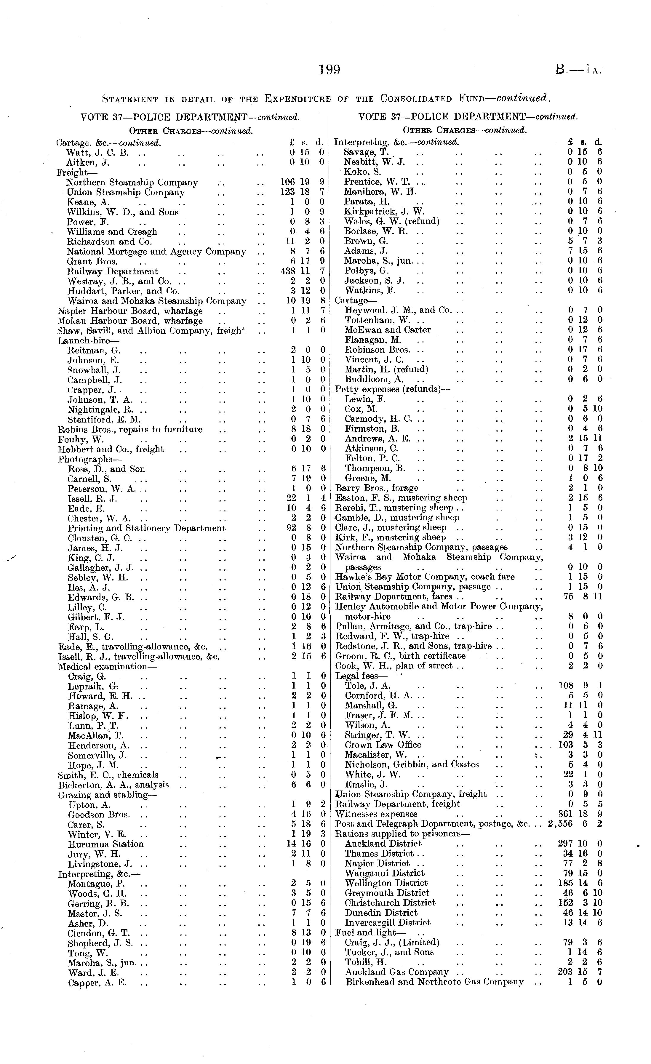 Statement in detail of the Expenditube of the Consolidated Fund— continued. VOTE 37—POLICE DEPARTMENT— continued. VOTE 37—POLICE DEPARTMENT— continued. Other Charges— continued. Other Charges— continued. Cartage, &c.— continued. £ s. d. Interpreting, &c. — continued. £ s. d. Watt, J. C. B. .. .. .. .. 015 0 Savage, T. . . .. .. .. 015 6 Aitken, J. .. .. . . . . 0 10 0 Nesbitt, W. J. . . . . .. .. 010 6 Freight— Koko, S. .. .. .. .. 0 5 0 Northern Steamship Company .. .. 106 19 9 Prentice, W. T. ... .. .. .. 0 5 0 Union Steamship Company " . . .. 123 18 7 Manihera, W. H. .. .. .. 0 7 6 Keane, A. .. .'. . . .. 10 0 Parata, H. . . .. .. .. 010 6 Wilkins, W. D., and Sons .. .. 10 9 Kirkpatriok, J. W. .. .. .. 010 6 Power, F. .. .. .. .. 0 8 3 Wales, G. W. (refund) .. .. .. 0 7 6 Williams and Creagh .. .. .. 0 4 6 Borlase, W. R. .. .. .. .. 010 0 Richardson and Co. .. .. . . 112 0 Brown, G. .. .. .. .. 5 7 3 National Mortgage and Agency Company .. 8 7 6 Adams, J. .. .. .. .. 715 6 Grant Bros. .. .. .. .. 617 9 Maroha, 8., jun. .. .. .. .. 010 6 Railway Department .. .. .. 438 11 7 Polbys, G. .. .. .. .. 010 6 Westray, J. 8., and Co. .. .. .. 2 2 0 Jackson, S. J. .. .. .. .. 010 6 Huddart, Parker, and Co. .. .. 312 0 Watkins, F. .. .. .. .. 010 6 Wairoa and Mohaka Steamship Company .. 10 19 8 Cartage— Napier Harbour Board, wharfage .. .. 111 7 Heywood. J. M., and Co. .. .. .. 0 7 0 Mokau Harbour Board, wharfage . . . . 0 2 6 Tottenham, W. .. .. .. .. 012 0 Shaw, Savill, and Albion Company, freight .. 110 McEwan and Carter .. .. .. 012 6 Launch-hire— Flanaga,n, M. .. ~ .. .. 0 7 6 Reitman, G. .. .. .. .. 2 0 0 Robinson Bros. .. .. .. .. 0 17 6 Johnson, E. .. .. .. .. 1 10 0 Vincent, J. C. .. .. .. .. 0 7 6 Snowball, J. . . .. .. .. 15 0 Martin, H. (refund) .. .. .. 0 2 0 Campbell, J. . . . . .. .. 10 0 I Buddicorn, A. .. .. .. .. 06 0 Crapper, J. . . . . .. .. 10 0 Petty expenses (refunds) — Johnson, T. A. .. .. .. .. 110 0 Lewin, F. .. .. .. . . 0 2 6 Nightingale, R. .. .. .. .. 2 0 0 | Cox, M. .. .. .. .. 0 510 Stentiford, E. M. .. .. . . 0 7 6 | Carmody, H. C. .. .. .. .. 0 6 0 Robins Bros., repairs to furniture .. .. 818 0 ! Firmston, B. .. .. .. .. 0 4 6 Fouhy, W. .. .. .. .. 0 2 0 Andrews, A. E. .. .. .. .. 215 11 Hebbert and Co., freight .. .. .. 0 10 0 Atkinson, C. . . .. .. .. 0 7 6 Photographs— Felton, P. C. .. ... .. .. 017 2 Ross, D., and Son .. .. .. 617 6 Thompson, B. .. .. .. .. 0 810 Carnell, S. ... .. .. .. 719 0 Greene, M. .. . . .. .. 106 Peterson, W. A. .. .. .. . . 10 0 Barry Bros., forage .. .. .. 2 10 Issell, R. J. .. .. .. .. 22 1 4 Easton, F. S., mustering sheep .. .. 215 6 Hade, E. .. .. .. .. 10 4 6 Rerehi, T., mustering sheep .. .. .. 15 0 Chester, W. A. .. .. .. .. 2 2 0 Gamble, D., mustering sheep .. .. 15 0 Printing and Stationery Department .. 92 8 0 Clare, J., mustering sheep .. .. .. 015 0 Clousten, G. C. .. .. .. .. 0 8 0 Kirk, F., mustering sheep .. .. .. 3 12 0 James, H. J. .. .. .. .. 015 0 Northern Steamship Company, passages .. 4 10 King, C. J. .. .. .. .. 0 3 0 Wairoa and Mohaka Steamship Company, Gallagher, J. J. .. .. .. .. 0 2 0 passages .. .. .. .. 0 10 0 Sebley, W. H. .. .. .. .. 0 5 0 Hawke's Bay Motor Company, coach fare .. 115 0 lies, A. J. .. .. .. .. 012 6 Union Steamship Company, passage . . .. 115 0 Edwards, G. B. .. .. .. .. 0 18 0 Railway Department, fares .. .. .. 75 8 11 Lilley, C. .. .. .. .. 012 0 Henley Automobile and Motor Power Company, Gilbert, F. J. .. .. .. .. 010 0 motor-hire .. .. .. .. 8 0 0 Earp, L. .. .. .. .. 2 8 6 Pullan, Armitage, and Co., trap-hire .. .. 0 6 0 Hall, S. G. .. .. .. .. 12 3 Redward, F. W., trap-hire .. .. .. 0 5 0 Eade, E., travelling-allowance, &c. .. .. 1 16 0 Redstone, J. R., and Sons, trap-hire .. .. 0 7 6 Tasell, R. J., travelling -allowance, &c. .. 2 15 6 Groom, R. C, birth certificate .. .. 0 5 0 Medical examination — Cook, W. H., plan of street .. .. .. 2 2 0 Craig, G. .. .. .. .. 110 Legal fees— " Lepraik. G-. .. .. .. .. 110 Tole, J. A. .. .. .. .. 108 9 1 Howard, E. H. .. .. .. .. 2 2 0 Cornford, H. A. .. .. .. .. 5 5 0 Ramage, A. .. .. .. .. 110 Marshall, G. .. .. .. .. 11110 Hislop, W. Y. .. .. .. . . 110 Fraser, J. F. M. .. .. .. .. 110 Lunn. P. T. .. .. .. .. 2 2 0 Wilson, A. .. .. .. .. 4 4 0 MaeAUan, T. .. .. . . .. 010 6 Stringer, T. W. .. . . .. .. 29 411 Henderson, A. .. .. .. .. 2 2 0 Crown Law Office .. .. .. 103 5 3 Somerville,' J. .. .. .. .. 110 Macalister, W. . . .. .. :. 3 3 0 Hope, J. M. .. .. . . . . 110 Nicholson, Gribbin, and Coates .. .. 5 4 0 Smith, E. C, chemicals .. .. .. 0 5 0 White, J. W. .. .. .. .. 22 1 0 Biokerton, A. A., analysis .. .. . . 6 6 0 Emslie, J. .. .. .. .. 3 3 0 Grazing and stabling— Union Steamship Company, freight .. .. 0 9 0 Upton, A. .. .. .. .. 19 2 Railway Department, freight .. .. 0 5 5 Goodson Bros. .. .. .. .. 416 0 Witnesses expenses . . .. . . 861 18 9 Carer, S. .. .. .. .. 5 18 6 Post and Telegraph Department, postage, &c. .. 2,556 6 2 Winter, V. E. .. .. .. .. 1 19 3 Rations supplied to prisoners— Hurumua Station .. .. .. 14 16 0 Auckland District .. .. 297 10 0 Jury, W. H. .. .. .. .. 2 110 Thames District .. .. .. .. 34 16 0 Livingstone, J. .. .. .. .. 18 0 Napier District .. .. .. .. 77 2 8 Interpreting, &c.— Wanganui District .. .. .. 79 15 0 Montague, P. .. .. .. 2 5 0 Wellington District .. .. .. 185 14 6 Woods, G. H. .. .. .. .. 3 5 0 Greymouth District .. .. .. 46 610 Gerring, R. B. .. .. .. .. 015 6 Christchurch District .. .. .. 152 310 Master, J. S. .. .. .. .. 7 7 6 Dunedin District .. .. .. 46 14 10 Asher, D. .. .. .. .. 110 Invercargill District . . .. .. 13 14 6 Clendon, G. T. .. .. .. .. 813 0 Fuel and light— .. Shepherd, J. S. .. .. .. .. 019 6 Craig, J. J., (Limited) .. .. .. 79 3 6 Tong, W. -. .. .. •• 010 6 Tucker, J., and Sons .. .. .. 114 6 Maroha, S., jun. .. .. .. .. 2 2 0 Tohill, H. .. .. .. .. 2 2 6 Ward, J. E. .. .. .. .. 2 2 0 Auckland Gas Company .. .. .. 203 15 7 Capp