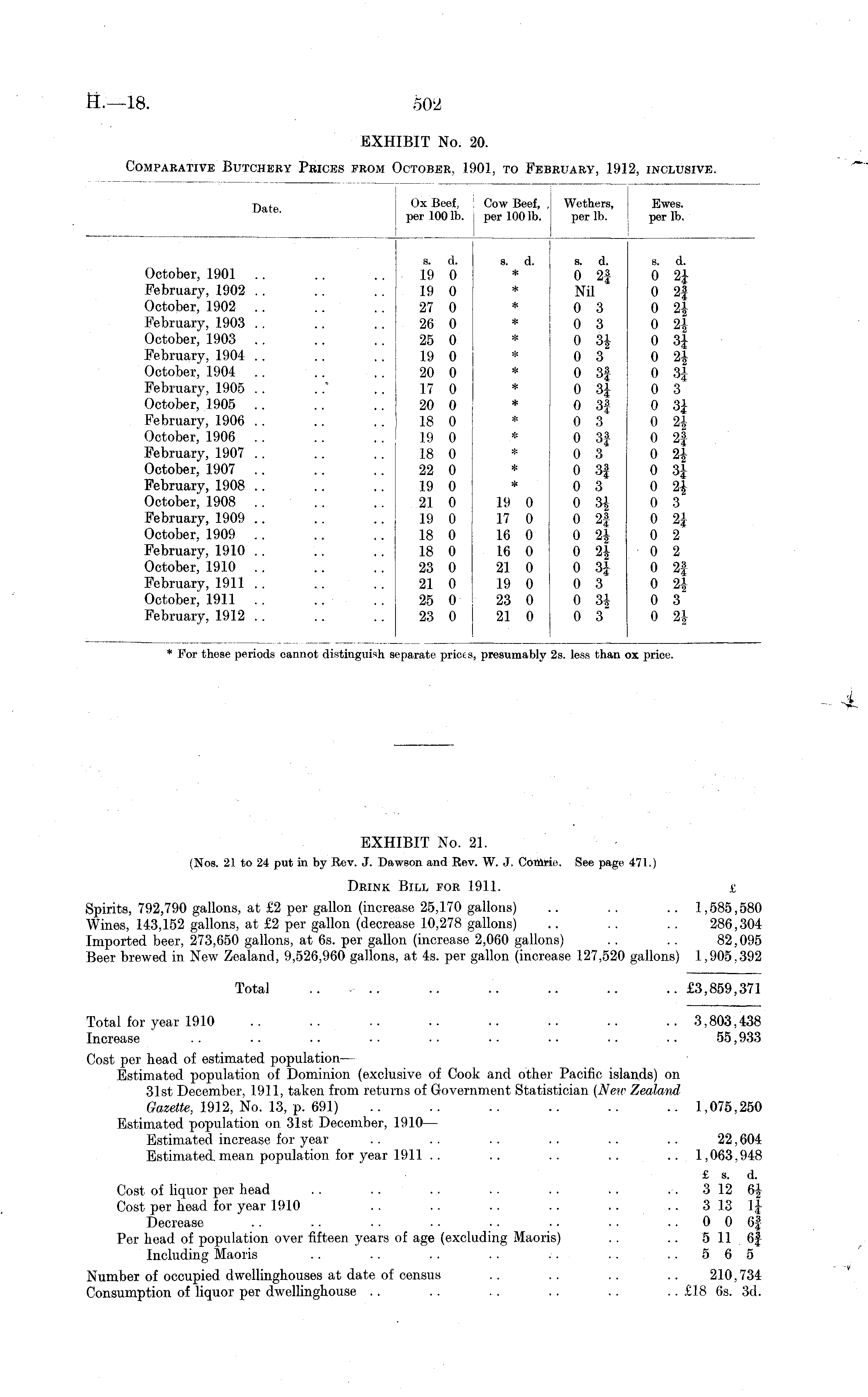 EXHIBIT No. 20. Comparative Butchery Prices from October, 1901, to February, 1912, inclusive.
