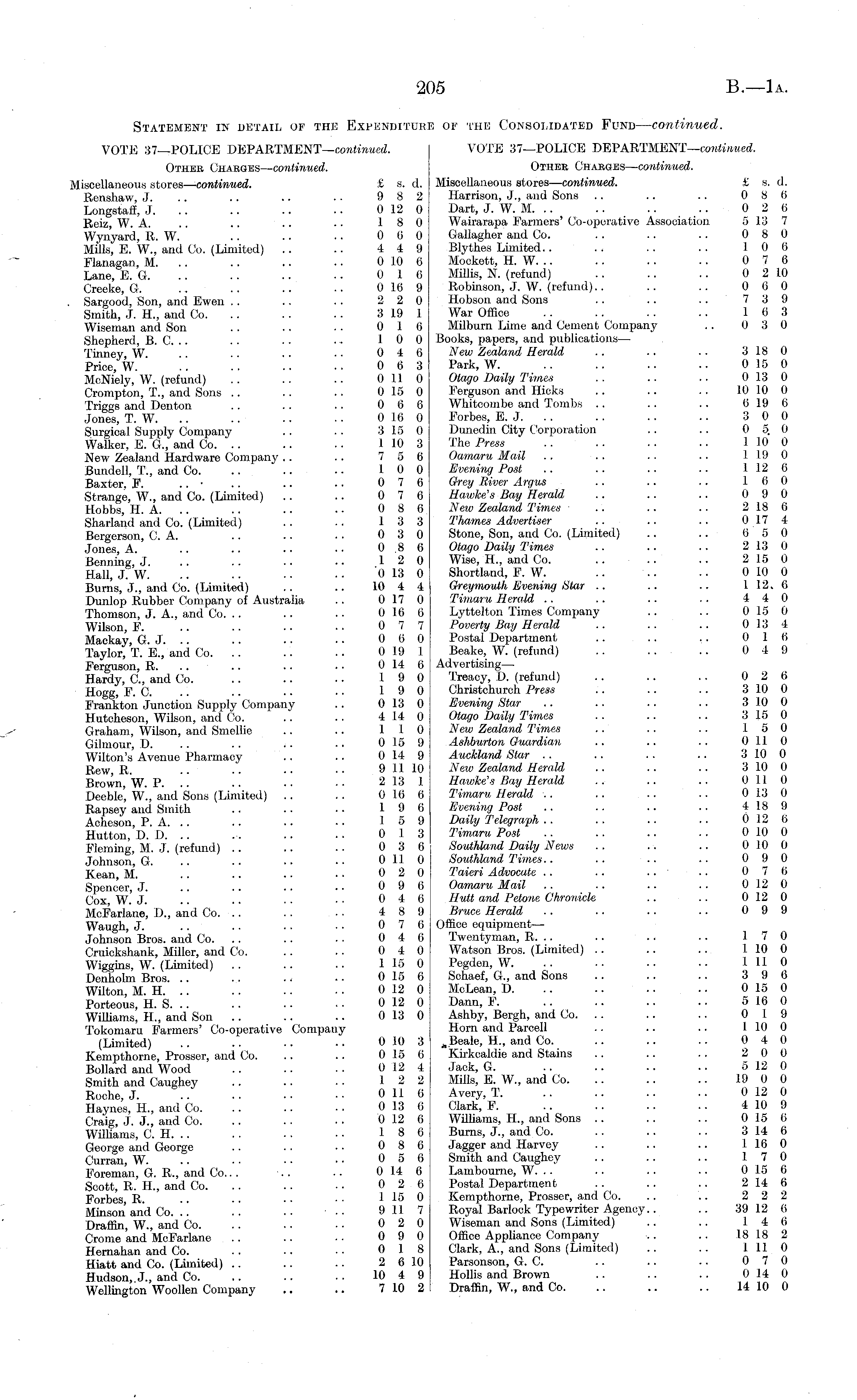 Statement in detail of the Expenditure of the Consolidated Fund — continued. VOTE 37—POLICE DEPARTMENT— continued. VOTE 37—POLICE DEPARTMENT— continued. Othee Charoes— continued. Other Chabghs— continued. Miscellaneous stores — continued. £ s. d. Miscellaneous stores — continued. 1C 8. d. Renshaw J .. .. .. 9 8 2 Harrison, J., and Sons .. .. .. 0 8 6 Longstaff, J. . . .. .. 012 0 Dart, J. W. M. .. .. .. .. 0 2 0 Reiz W. A. .. .. • ■ • ■ 18 0 Wairarapa Farmers' Co-operative Association 5 13 7 Wynyard, R. W. .. . • ■ • 0 0 0 Gallagher and Co. . . .. .. 0 8 0 Mills, E. W., and Co. (Limited) .. .. 4 4 9 Blythes Limited.. . . . . . . 10 6 Flanagan, M. .. .. .. .. 010 6 Mockett, H. W. . . .. . . .. 0 7 6 Lane, E. G. .. . . .. .. 0 16 Mollis, N. (refund) .. .. .. 0 210 Creeke, G. .. .. .. .. 010 9 Robinson, J. W. (refund).. .. .. 0 6 0 . Sargoo'd, Son, and Ewen .. .. .. 22 0 Hobson and Sons .. .. . . 73 9 Smith, J. H., and Co. .. .. 319 1 War Office .. .. .. .. 16 3 Wiseman and Son .. . . .. 0 10 Milburn Lime and Cement Company .. 0 3 0 Shepherd, B. C. .. .. . . • • 10 0 Books, papers, and publications— Tinney W .. ..046 New Zealand Herald .. .. .. 318 0 Price, W. .. .. .. .. 0 6 3 Park, W. .. .. .. .. 015 0 McNiely, W. (refund) .. .. .. 011 0 Otago Daily Times .. .. .. 013 0 Crompton, T., and Sons .. .. .. 015 0 Ferguson and Hicks .. .. . . 10 10 0 Triggs and Denton .. .. .. 0 6 6 Whitcombe and Tombs .. .. .. 019 6 Jones, T. W. .. .. .. •. 016 0 Forbes, E. J. .. .. .. .. 3 0 0 Surgical Supply Company .. .. 315 0 Dunedin City Corporation .. .. 0 5. 0 Walker, E. G., and Co. . . .. .. 110 3 The Press .. .. .. .. 110 0 New Zealand Hardware Company .. .. 7 5 6 Oamaru Mail .. . . . . .. 119 0 Bundell, T., and Co. .. .. . . 10 0 Post .. .. .. .. 112 6 Baxter, F. .. • . . .. • ■ 0 7 6 Grey River Argus .. .. .. 16 0 Strange, W., and Co. (Limited) .. .. 0 7 6 Hawke's Bay Herald .. .. .. 0 9 0 Hobbs, H. A. .. .. .. .. 0 8 6 New Zealand Times .. .. .. 218 6 Sharland and Co. (Limited) . . .. 13 3 Thames Advertiser .. .. .. 017 4 Bergerson, C. A. .. .. . . 0 3 0 Stone, Son, and Co. (Limited) .. .. 0 5 0 Jones, A. .. .. .. .. 0 8 6 Otago Daily Times .. .. .. 213 0 Benning J .. .. .. ■ • 1. 2 0 Wise, H., and Co. .. .. .. 215 0 Hall, J. W. .. .. • ■ • ■ 013 0 Shortland, F. W. .. .. .. 010 0 Burns, J., and Co. (Limited) .. .. 10 4 4 Greymouth Evening Star .. .. .. 1 12. 6 Dunlop Rubber Company of Australia .. 017 0 Timaru Herald .. .. .. .. 4 4 0 Thomson, J. A., and Co. .. .. .. 016 6 Lyttelton Times Company .. . . 015 0 Wilson, F. .. . . .. . • 0 7 7 Poverty Bay Herald .. .. .. 013 4 Mackay G. J. .. .. . • • • 0 6 0 Postal Department .. .. .. 0 J 0 Taylor, T. E., and Co. .. .. .. 019 1 Beake, W. (refund) .. . . .. 0 4 9 Ferguson, R. .. .. .. .. 0 14 0 AdvertisingHardy, C, and Co. .. .. .. 19 0 Treaoy, D. (refund) .. .. .. 0 2 6 Hogg, F. 0. .. .. .. • • 19 0 Christchurch Press .. .. .. 310 0 Frankton Junction Supply Company . . 013 0 Evening Star .. .. .. .. 310 0 Hutcheson, Wilson, and Co. .. .. 414 0 Otago Daily Times .. .. .. 315 0 Graham, Wilson, and Smellie .. . . 110 New Zealand Times .. .. .. 15 0 Gilmour, D. .. .. .. ■. 015 9 Ashburton Guardian .. .. .. 011 0 Wilton's Avenue Pharmacy .. .. 014 9 Auckland Star .. .. .. .. 310 0 Row, R. .. • • • ■ ■ • 911 10 New Zealand Herald .. .. .. 310 0 Brown, W. P. .. •. ■ ■ ■ • 213 1 Hawke's Bay Herald .. .. .. 0 110 Deeble', W., and Sons (Limited) .. .. 016 6 Timaru Herald :. .. .. .. 013 0 Rapsey and Smith .. .. .. 19 6 Evening Post .. .. .. .. 418 9 Acheson, P. A. .. .. .. .. 15 9 Daily Telegraph .. .. .. .. 012 6 Hutton, D. D. .. .-. .. •• 0 13 Timaru Post .. .. .. .. 010 0 Fleming, M. J. (refund) .. .. .. 0 3 6 Southland Daily News . . .. .. 010 0 Johnson, G. .. .. .. •• 0110 Southland Times.. .. .. . . 0 9 0 Kean, M. . . .. • • ■ • 0 2 0 Taieri Advocate .. .. .. .. 0 7 6 Spencer, J. .. .. .. • • 0 9 6 Oamaru Mail .. ■. ■. ■ ■ 012 0 Cox, W. J. .. .. ■•■• 0 4 6 Hutt and Petone Chronicle .. .. 012 0 McFarlane, D., and Co. . . . . .. 4 8 9 Bruce Herald .. .. .. .. 0 9 9 Waugh, J. .. .. • • • • 0 7 6 Office equipment— Johnson Bros, and Co. .. .. .. 0 4 6 Twentyman, R. .. .. .. .. 7 0 Cruickshank, Miller, and Co. . . .. 0 4 0 Watson Bros. (Limited) .. .. .. 10 0 Wiggins, W. (Limited) . . .. .. 115 0 Pegden, W. .. .. •• • • 1110 Denholm Bros. .. . . . < ■ ■ 015 6 Sohaef, G., and Sons .. .. .. 3 9 6 Wilton, M. H. .. .. .. • • 012 0 McLean, D. .. .. .. .. 015 0 Porteous, H. S 012 0 Dann, F 516 0 Williams, H., and Son .. .. .. 013 0 Ashby, Bergh, and Co. .. .. .. 0 19 Tokomaru Farmers' Co-operative Company Horn and Parcell .. .. .. 1 10 0 (Limited) .. .. .. .. 010 3 ,Beale, H., and Co. .. .. .. 04 0 Kempthorne, Prosser, and Co. .. .. 015 6 Kirkcaldie and Stains .. .. .. 20 0 Bollard and Wood .. .. .. 012 4 Jack, G. .. .. .. .. 512 0 Smith and Caughey .. .. • • 12 2 Mills, E. W., and Co. .. .. .. 19 0 0 Roche, J. 011 6 Avery, T 012 0 Haynes, H., and Co. .. .. .. 013 0 Clark, F. .. .. .. .. 410 9 Craig, J. J., and Co. .. . . • • 012 6 Williams, H., and Sons .. .. .. 015 0 Williams, C. H. .. . . . . ■. 18 0 Burns, J., and Co. .. .. .. 314 6 George and George .. . . .. 0 8 6 Jagger and Harvey .. .. .. 116 0 Curran, W. .. . . ■ • • ■ 0 5 6 Smith and Caughey .. .. .. 17 0 Foreman, G. R., and C 0... .. .. 014 6 Lamboume, W. .. .. .. .. 015 6 Scott, R. H., and Co. .. .. .. 0 2 6 Postal Department . . .. .. 214 6 Forbes R. .. .. • • • • 115 0 Kempthorne, Prosser, and Co. .. .. 2 2 2 Minson and Co. .. .. •• •• 911 7 Royal Barlock Typewriter Agency.. .. 39 12 6 Draffin, W., and Co. .. .. •. 0 2 0 Wiseman and Sons (Limited) .. .. 14 6 Crome and McFarlane .. .. .. 0 9 0 Office Appliance Company .. .. 18 18 2 Hernahan and Co. .. .. •• 0 18 Clark, A., and Sons (Limited) .. .. 111 0 Hiatt an
