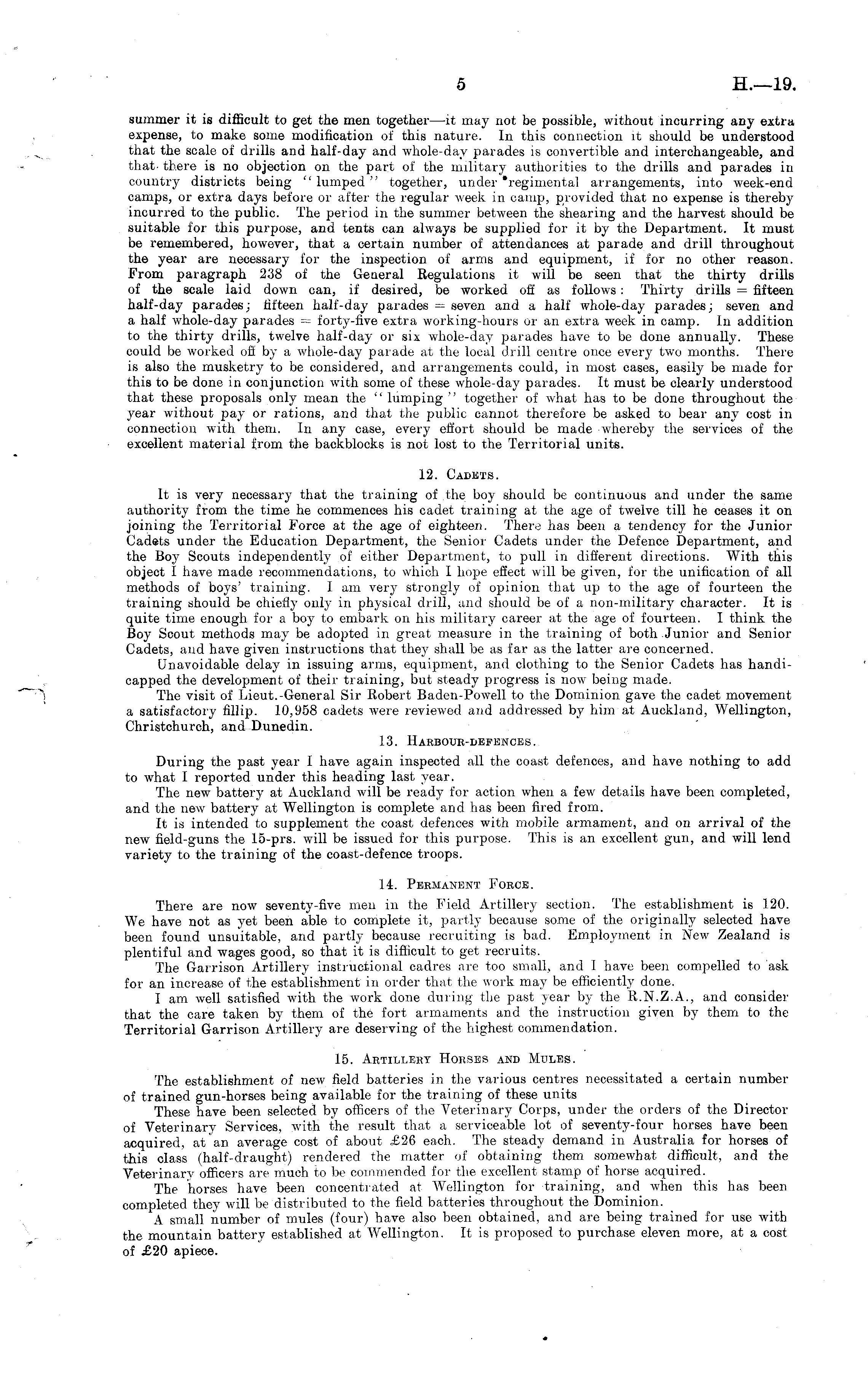 summer it is difficult to get the men together—it may not be possible, without incurring any extra expense, to make some modification of this nature. In this connection it should be understood that the scale of drills and half-day and whole-day parades is convertible and interchangeable, and that there is no objection on the part of the military authorities to the drills and parades in country districts being "lumped" together, under'regimental arrangements, into week-end camps, or extra days before or after the regular week in camp, provided that no expense is thereby incurred to the public. The period in the summer between the shearing and the harvest should be suitable for this purpose, and tents can always be supplied for it by the Department. It must be remembered, however, that a certain number of attendances at parade and drill throughout the year are necessary for the inspection of arms and equipment, if for no other reason. From paragraph 238 of the General Regulations it will be seen that the thirty drills of the scale laid down can, if desired, be worked off as follows: Thirty drills = fifteen half-day parades; fifteen half-day parades = seven and a, half whole-day parades; seven and a half whole-day parades = forty-five extra working-hours or an extra week in camp, in addition to the thirty drills, twelve half-day or six whole-day parades have to be done annually. These could be worked off by a whole-day parade at the local drill centre once every two months. There is also the musketry to be considered, and arrangements could, in most cases, easily be made for this to be done in conjunction with some of these whole-day parades. It must be clearly understood that these proposals only mean the " lumping " together of what has to be done throughout the year without pay or rations, and that the public cannot therefore be asked to bear any cost in connection with them. In any case, every effort should be made whereby the services of the excellent material from the backblocks is not lost to the Territorial units. 12. Cadets. It is very necessary that the training of the boy should be continuous and under the same authority from the time he commences his cadet training at the age of twelve till he ceases it on joining the Territorial Force at the age of eighteen. There has been a tendency for the Junior Cadets under the Education Department, the Senior Cadets under the Defence Department, and the Boy Scouts independently of either Department, to pull in different directions. With this object I have made recommendations, to which 1 hope effect will be given, for the unification of all methods of boys' training. 1 am very strongly of opinion that up to the age of fourteen the training should be chiefly only in physical drill, and should be of a non-military character. It is quite time enough for a boy to embark on his military career at the age of fourteen. I think the Boy Scout methods may be adopted in great measure in the training of both Junior and Senior Cadets, and have given instructions that they shall be as far as the latter are concerned. Unavoidable delay in issuing arms, equipment, and clothing to the Senior Cadets has handicapped the development of their training, but steady progress is now being made. The visit of Lieut.-General Sir Robert Baden-Powell to the Dominion gave the cadet movement a satisfactory fillip. 10,958 cadets were reviewed and addressed by him at Auckland, Wellington, Christchurch, and Dunedin. 13. Harbour-defences. During the past year I have again inspected all the coast defences, and have nothing to add to what I reported under this heading last year. The new battery at Auckland will be ready for action when a few details have been completed, and the new battery at Wellington is complete and has been fired from. It is intended to supplement the coast defences with mobile armament, and on arrival of the new field-guns the 15-prs. will be issued for this purpose. This is an excellent gun, and will lend variety to the training of the coast-defence troops. 14. Permanent Force. There are now seventy-five men in the Field Artillery section. The establishment is 120. We have not as yet been able to complete it, partly because some of the originally selected have been found unsuitable, and partly because recruiting is bad. Employment in New Zealand is plentiful and wages good, so that it is difficult to get recruits. The Garrison Artillery instructional cadres are too small, and I have been compelled to "ask for an increase of the establishment in order that the work may be efficiently done. I am well satisfied with the work done during the past year by the R.N.Z.A., and consider that the care taken by them of the fort armaments and the instruction given by them to the Territorial Garrison Artillery are deserving of the highest commendation. 15. Artillery Horses and Mules. The establishment of new field batteries in the various centres necessitated a certain number of trained gun-horses being available for the training of these units These have been selected by officers of the Veterinary Corps, under the orders of the Director of Veterinary Services, with the result that a serviceable lot of seventy-four horses have been acquired, at "an average cost of about £26 each. The steady demand in Australia for horses of this class (half-draught) rendered the matter of obtaining them somewhat difficult, and the Veterinary officers are much to be commended for the excellent stamp of horse acquired. The horses have been concentrated at Wellington for training, and when this has been completed they will be distributed to the field batteries throughout the Dominion. A small number of mules (four) have also been obtained, and are being trained for use with the mountain battery established at Wellington. It is proposed to purchase eleven more, at a cost of £20 apiece.