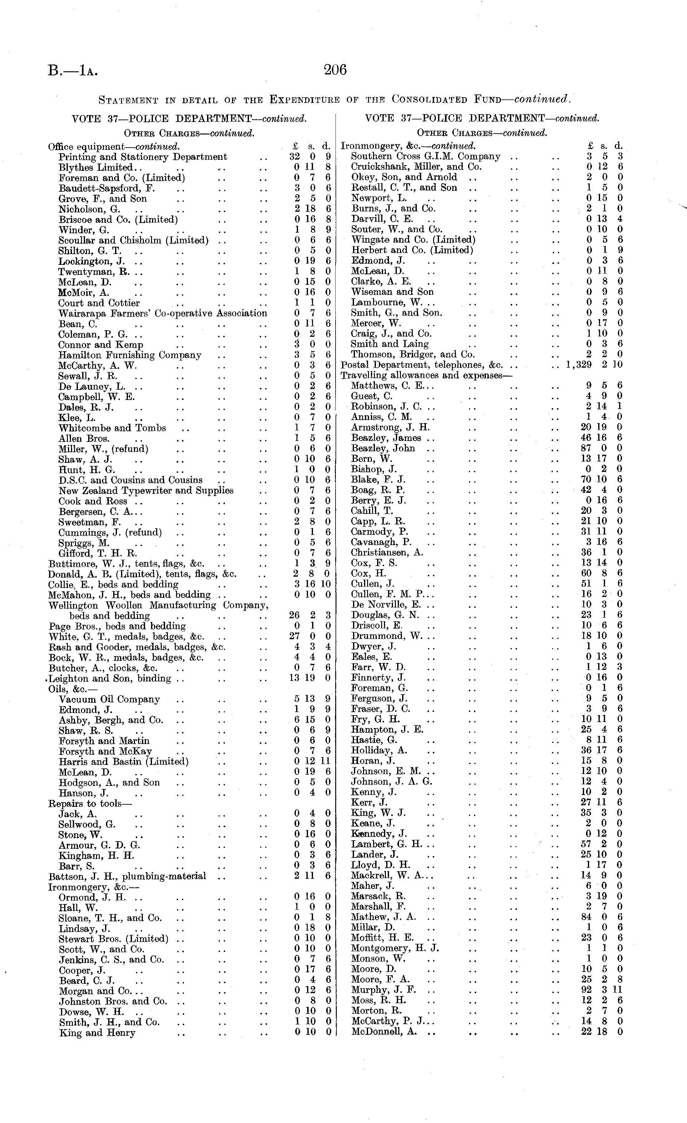 Statement in detail of the Expenditure op tub Consolidated Fund — continued. VOTE 37—POLICE DEPARTMENT— continued. VOTE 37—POLICE DEPARTMENT— continued. Other Charges— continued. Other Charges— continued. Office equipment— continued. £ s. d. Ironmongery, &c.— -continued. £ s. d. Printing and Stationery Department .. 32 0 9 Southern Cross G.I.M. Company .. .. 3 5 3 Blythes Limited.. .. .. .. 011 8 Cruiokshank, Miller, and Co. .. .. 012 6 Foreman and Co. (Limited) .. .. 0 7 6 Okey, Son, and Arnold .. .. .. 2 0 0 Baudett-Sapsford, F. .. .. .. 3 0 6 Restall, C. T., and Son .. .. .. 15 0 Grove, F., and Son . . .. .. 2 5 0 Newport, L. .. .. .. .. 015 0 Nicholson, G. .. .. .. .. 218 6 Burns, J., and Co. .. .. .. 2 10 Briscoe and Co. (Limited) .. .. 016 8 Darvill, C. E. .. .. .. .. 013 4 Winder, G. .. .. .. .. 18 9 Souter, W., and Co. .. .. .. 010 0 Scoullar and Chisholm (Limited) .. .. 0 6 6 Wingate and Co. (Limited) .. .. 0 5 6 Shilton, G. T. .. .. .. .. 0 5 0 Herbert and Co. (Limited) .. .. 0 19 Lockington, J. .. .. .. 019 6 Edmond, J. .. .. .. .. 0 3 6 Twentyman, R. .. .. .. .. 18 0 McLean, D. .. .. .. .. 011 0 McLean, D. .. .. .. .. 015 0 Clarke, A. E. .. .. .. .. 0 8 0 MeMoir, A. .. .. .. .. 016 0 Wiseman and Son .. .. .. 0 9 6 Court and Cottier .. .. .. 110 Lambourne, W. .. ... .. .. 050 Wairarapa Farmers' Co-operative Association 0 7 6 Smith, G., and Son. .. .. .. 0 9 0 Bean, C. .. .. .. .. 0 11 6 Mercer, W. .. .. .. .. 0 17 0 Coleman, P. G. .. . . .. .. 0 2 6 Craig, J., and Co. .. .. .. 1 10 0 Connor and Kemp .. .. .. 3 0 0 Smith and Laing .. .. .. 0 3 6 Hamilton Furnishing Company .. .. 3 5 6 Thomson, Bridger, and Co. .. .. 2 2 0 McCarthy, A. W. .. .. .. 0 3 6 Postal Department, telephones, &c. .. ..1,329 2 10 Sewall, J. R. .. .. .. .. 0 5 0 Travelling allowances and expenses— De Launey, L. .. .. .. .. 0 2 6 Matthews. C. E... .. .. .. 9 5 6 Campbell, W. E. .. .. .. 0 2 6 Guest, C. .. .. .. .. 4 9 0 Dales, R. J. .. .. .. .. 0 2 0 Robinson, J. C. .. .. .. .. 214 1 Klee, L. .. .. .. .. 0 7 0 Anniss, CM... .. .. .. 140 Whitcombe and Tombs .. .. .. 17 0 Armstrong, J. H. .. .. .. 20 19 0 Allen Bros. .. .. .. .. 15 6 Beazley, James .. .. .. .. 46 16 6 Miller, W., (refund) .. .. .. 0 6 0 Beazley, John .. .. .. .. 87 0 0 Shaw. A. J. .. .. .. .. 010 6 Bern, W. .. .. .. .. 13 17 0 H. G. .. .. .. .. 10 0 Bishop, J. .. .. .. .. 0 2 0 D.S.C. and Cousins and Cousins .. .. 010 6 Blake, F. J. .. .. .. .. 70 10 6 New Zealand Typewriter and Supplies .. 0 7 6 Boag, R. P. .. .. .. .. 42 4 0 Cook and Ross .. .. .. .. 0 2 0 Berry, E. J. .. .. .. .. 016 6 Bergersen, C. A... .. .. .. 0 7 6 Cahill, T. .. .. .. .. 20 3 0 Sweetman, F. .. .. .. .. 2 8 0 Capp, L. R. .. .. .. .. 21 10 0 Cummings, J. (refund) .. .. .. 0 16 Carmody, P. .. .. .. .. 31 11 0 Spriggs, M .. .. 0 5 6 Cavanagh, P. .. .. .. 316 6 Gifford, T. H. R. .. .. .. 0 7 6 Christiansen, A. .. .. .. 36 1 0 Buttimore, W. J., tents, flags, &c. .. .. 13 9 Cox, F. S. .. .. .. .. 13 14 0 Donald, A. B. (Limited), tents, flags, &c. .. 2 8 0 Cox, H. .. .. .. .. 60 8 6 Collie. E., beds and bedding .. .. 3 16 10 Cullen, J. .. .. .. .. 51 1 6 McMahon, J. H., beds and bedding .. .. 0 10 0 Cullen, F. M. P... .. .. .. 16 2 0 Wellington Woollen Manufacturing Company, De Norville, E. .. .. .. .. 10 3 0 beds and bedding .. .. .. 26 2 3 Douglas, G. N. . . .. .. .. 23 1 6 Page Bros., beds and bedding . . .. 0 10 Driscoll, E. .. .. .. .. 10 6 6 White, G. T., medals, &c. . . .. 27 0 0 Drummond, W. .. .. .. . . 18 10 0 Rash and Gooder, medals, badges, &c. .. 4 3 4 Dwyer, J. .. .. .. .. 16 0 Bock, W. R., medals, badges, &c. .. .. 4 4 0 Eales, E. .. .. .. .. 013 0 Butcher, A., clocks, &c. .. .. .. 0 7 6 Farr, W. D. .. .. .. .. 1 12 3 .Leighton and Son, binding . . .. .. 13 19 0 Finnerty, J. .. .. .. .. 016 0 Oils, &c.— Foreman, G. .. .. .. .. 0 16 Vacuum Oil Company . . .. .. 513 9 Ferguson, J. .. .. .. .. 9 5 0 Edmond, J. .. . . .. .. 19 9 Fraser, D. C. .. .. .. .. 3 9 6 Ashby, Bergh, and Co. .. .. .. 615 0 Fry, G. H. .. .. .. .. 10 11 0 Shaw, R. S. .. .. .. .. 0 6 9 Hampton, J. E. . . .. . . 25 4 6 Forsyth and Martin .. .. .. 0 6 0 Hastie, G. .. .. .. .. 811 6 Forsyth and McKay .. .. .. 0 7 6 Holliday, A. .. .. .. .. 36 17 6 Harris and Bastin (Limited) .. .. 0 12 11 Horan, J. .. .. .. .. 15 8 0 McLean, D. .. .. .. .. 019 6 Johnson, E. M. .. .. .. .. 12 10 0 Hodgson, A., and Son .. .. 0 5 0 Johnson, J. A. G. .. .. .. 12 4 0 Hanson, J. .. . . .. .. 0 4 0 Kenny, J. .. . . .. .. 10 2 0 Repairs to tools— Kerr, J. .. .. .. .. 27 11 6 Jack, A. .. .. .. .. 0 4 0 King, W. J. .. .. .. .. 35 3 0 Sellwood, G. .. .. .. .. 0 8 0 Keane, J. .. .. .. .. 2 0 0 Stone, W. .. .. .. .. 016 0 Kennedy, J. .. .. .. .. 012 0 Armour, G. D. G. .. .. .. 0 6 0 Lambert, G. H. .. .. .. .. 57 2 0 Kingham, H. H. .. .. .. 0 3 6 Lander, J. .. .. ~ .. 25 10 0 Barr, S. .. .. .. . . 0 3 6 Lloyd, D. H. .. .. .. .. 1 17 0 Battson, J. H., plumbing-material .. .. 211 6 Mackrell, W. A... .. .. .. 14 9 0 Ironmongery, &c.— Maher, J. .. .. .. .. 6 0 0 Ormond, J. H. .. .. .. .. 016 0 Marsack, R. .. .. .. .. 319 0 Hall, W. .. .. .. . • 10 0 Marshall, F. .. .. .. .. 2 7 0 Sloane, T. H., and Co. .. .. .. 0 18 Mathew, J. A. .. .. .. .. 84 0 6 Lindsay, J. .. .. .. .. 018 0 Millar, D. .. .. .. .. 10 6 Stewart Bros. (Limited) .. . . .. 010 0 Moffitt, H. E. .. .. .. .. 23 0 6 Scott, W., and Co. .. .. .. 010 0 Montgomery, H. J. .. .. .. 110 Jenkins, C. S., and Co. .. .. .. 0 7 6 Monson, W. .. .. .. .. 10 0 Cooper, J. .. .. .. .. 017 6 Moore, D. .. .. .. .. 10 5 0 Beard, C. J. .. .. .. .. 0 4 6 Moore, F. A. .. .. .. .. 25 2 8 Morgan and Co 012 6 Murphy, J. F 92 311 Johnston Bros, and Co. .. .. .. 0 8 0 Moss, R. H. .. .. .. .. 12 2 6 Dowse, W. H. .. .. .. .. 010 0 Morton, R. .. .. .. .. 2 7 0 Smith, J. H., and Co. .. .. .. 110 0 McCarthy, P. J. .. .. .. .. 14 8 0 King and Henry .. .. .. 010 0 McDonnell, A. .. .. .. .. 22 18 0
