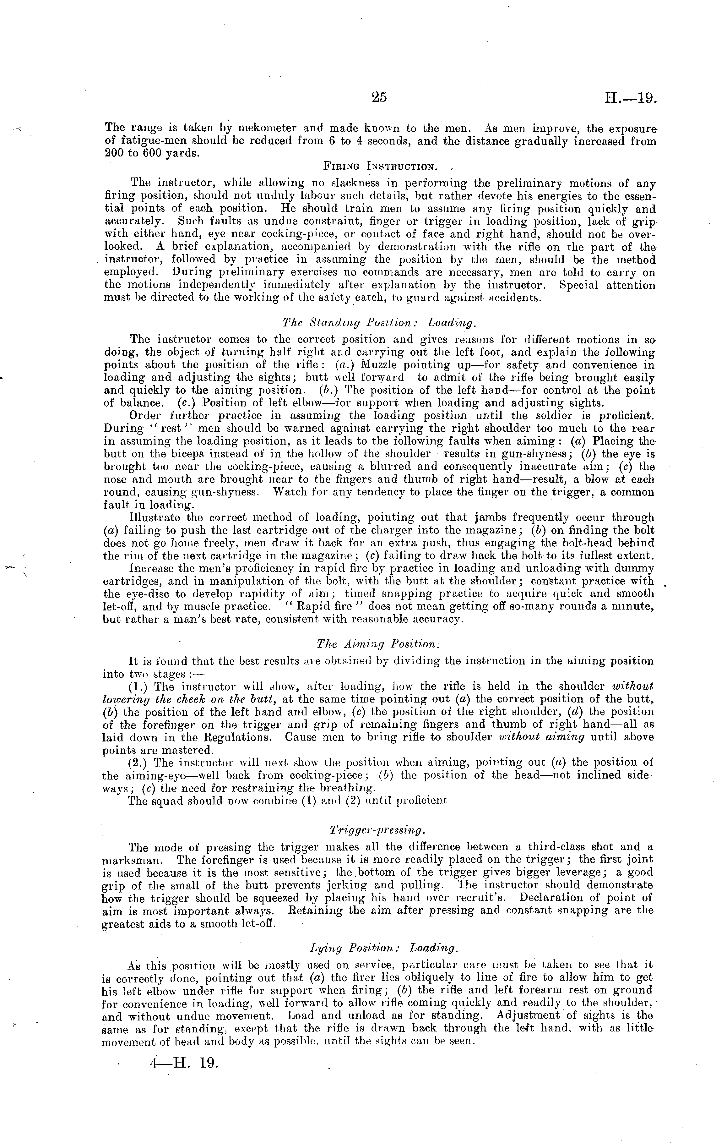 The range is taken by mekometer and made known to the men. As men improve, the exposure of fatigue-men should be reduced from 6 to 4 seconds, and the distance gradually increased from 200 to 600 yards. Firing Instbuction. - The instructor, while allowing no slackness in performing the preliminary motions of any firing position, should not unduly labour such details, but rather devote his energies to the essential points of each position. He should train men to assume any firing position quickly and accurately. Such faults as undue constraint, finger or trigger in loading position, lack of grip with either hand, eye near cocking-piece, or contact of face and right hand, should not be overlooked. A brief explanation, accompanied by demonstration with the rifle on the part of the instructor, followed by practice in assuming the position by the men, should be the method employed. During pieliminary exercises no commands are necessary, men are told to carry on the motions independently immediately after explanation by the instructor. Special attention must be directed to the working of the safety catch, to guard against accidents. The Standing Position: Loading. The instructor comes to the correct position and gives reasons for different motions in so doing, the object of turning half right and carrying out the left foot, and explain the following points about the position of the rifle : (a.) Muzzle pointing vp —for safety and convenience in loading and adjusting the sights; butt well forward —to admit of the rifle being brought easily and quickly to the aiming position, (b.) The position of the left hand —for control at the point of balance, (c.) Position of left elbow —for support when loading and adjusting sights. Order further practice in assuming the loading position until the soldier is proficient. During " rest " men should be warned against carrying the right shoulder too much to the rear in assuming the loading position, as it leads to the following faults when aiming : (a) Placing the butt on the biceps instead of in the hollow of the shoulder —results in gun-shyness; (6) the eye is brought too near the cocking-piece, causing a blurred and consequently inaccurate aim; (c) the nose and mouth are brought near to the fingers and thumb of right hand—result, a blow at each round, causing gun-shyness. Watch for any tendency to place the finger on the trigger, a common fault in loading. Illustrate the correct method of loading, pointing out that jambs frequently occur through (a) failing to push the last cartridge out of the charger into the magazine; (b) on finding the bolt does not go home freely, men draw it back for an extra push, thus engaging the bolt-head behind the rim of the next cartridge in the magazine; (c) failing to draw back the bolt to its fullest extent. Increase the men's proficiency in rapid fire by practice in loading and unloading with dummy cartridges, and in manipulation of the bolt, with the butt at the shoulder; constant practice with the eye-disc to develop rapidity of aim; timed snapping practice to acquire quick and smooth, let-off, and by muscle practice. " Rapid fire " does not mean getting off so-many rounds a minute, but rather a man's best rate, consistent with reasonable accuracy. The Aiming Position. It is found that the best results are obtained by dividing the instruction in the aiming position into two stages : — (1.) The instructor will show, after loading, how the rifle is held in the shoulder without lowering the cheek on the butt, at the same time pointing out (a) the correct position of the butt, (b) the position of the left hand and elbow, (c) the position of the right shoulder, (d) the position of the forefinger on the trigger and grip of remaining fingers and thumb of right hand —all as laid down in the Regulations. Cause men to bring rifle to shoulder luithout aiming until above points are mastered. (2.) The instructor will next show the position when aiming, pointing out (a) the position of the aiming-eye—well back from cocking-piece; (6) the position of the head —not inclined sideways; (c) the need for restraining the breathing. The squad should now combine (1) and (2) until proficient. Trigger- pressing. The mode of pressing the trigger makes all the difference between a third-class shot and a marksman. The forefinger is used because it is more readily placed on the trigger; the first joint is used because it is the most sensitive; the.bottom of the trigger gives bigger leverage; a good grip of the small of the butt prevents jerking and pulling. The instructor should demonstrate how the trigger should be squeezed by placing his hand over recruit's. Declaration of point of aim is most important always. Retaining the aim after pressing and constant snapping are the greatest aids to a smooth let-off. Lying Position: Loading. As this position will be mostly used on service, particular care must be taken to see that it is correctly done, pointing out that (a) the firer lies obliquely to line of fire to allow him to get his left elbow under rifle for support when firing; (6) the rifle and left forearm rest on ground for convenience in loading, well forward to allow rifle coming quickly and readily to the shoulder, and without undue movement. Load and unload as for standing. Adjustment of sights is the same as for standing, except that the rifle is drawn back through the left hand, with as little movement of head and body as possible, until the sights can be seen.