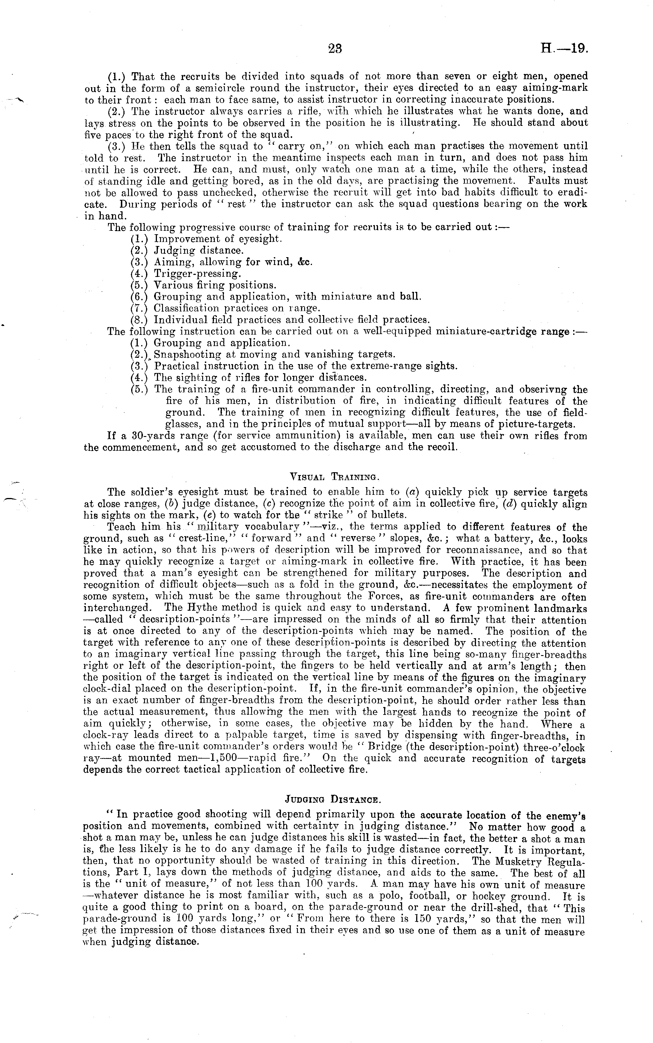 (1.) That the recruits be divided into squads of not more than seven or eight men, opened out in the form of a semicircle round the instructor, their eyes directed to an easy aiming-mark to their front : each man to face same, to assist instructor in correcting inaccurate positions. (2.) The instructor always carries a rifle, with which he illustrates what he wants done, and lays stress on the points to be observed in the position he is illustrating. Tie should stand about five paces to the right front of the squad. (3.) He then tells the squad to " carry on," on which each man practises the movement until told to rest. The instructor in the meantime inspects each man in turn, and does not pass him until he is correct. He can, and must, only watch one man at a time, while the others, instead of standing idle and getting bored, as in the old days, are practising the movement. Faults must not be allowed to pass unchecked, otherwise the recruit will get into bad habits difficult to eradicate. During periods of " rest " the instructor can ask the squad questions bearing on the work in hand. The following progressive course of training for recruits is to be carried out: — (1.) Improvement of eyesight. (2.) Judging distance. (3.) Aiming, allowing for wind, &c. (4.) Trigger-pressing. (5.) Various firing positions. (6.) Grouping and application, with miniature and ball. (7.) Classification practices on range. (8.) Individual field practices and collective field practices. The following instruction can be carried out on a well-equipped miniature-cartridge range :-— (1.) Grouping and application. Snapshooting at moving and vanishing targets. (3.) Practical instruction in the use of the extreme-range sights. (4.) The sighting of rifles for longer distances. (5.) The training of a fire-unit commander in controlling, directing, and obserivng the fire of his men, in distribution of fire, in indicating difficult features of the ground. The training of men in recognizing difficult features, the use of fieldglasses, and in the principles of mutual support —all by means of picture-targets. If a 30-yards range (for service ammunition) is available, men can use their own rifles from the commencement, and so get accustomed to the discharge and the recoil. Visual Training. The soldier's eyesight must be trained to enable him to (a) quickly pick up service targets at close ranges, (&) judge distance, (c) recognize the point of aim in collective fire, (d) quickly align his sights on the mark, (c) to watch for the " strike " of bullets. Teach him his "military vocabulary"—viz., the terms applied to different features of the ground, such as " crest-line," " forward " and " reverse " slopes, &c.; what a battery, &c, looks like in action, so that his powers of description will be improved for reconnaissance, and so that he may quickly recognize a target or aiming-mark in collective fire. With practice, it has been proved that a man's eyesight can be strengthened for military purposes. The description and recognition of difficult objects—such as a fold in the ground, &c.—necessitates the employment of some system, which must be the same throughout the Forces, as fire-unit commanders are often interchanged. The Hythe method is quick and easy to understand. A few prominent landmarks —called " decsription-points " —are impressed on the minds of all so firmly that their attention is at once directed to any of the description-points which may be named. The position of the target with reference to any one of these description-points is described by directing the attention to an imaginary vertical line passing through the target, this line being so-many finger-breadths right or left of the description-point, the fingers to be held vertically and at arm's length; then the position of the target is indicated on the vertical line by means of the figures on the imaginary clock-dial placed on the description-point. If, in the fire-unit commander's opinion, the objective is an exact number of finger-breadths from the description-point, he should order rather less than the actual measurement, thus allowing the men with the largest hands to recognize the point of aim quickly; otherwise, in some cases, the objective may be hidden by the hand. Where a clock-ray leads direct to a palpable target, time is saved by dispensing with finger-breadths, in which case the fire-unit commander's orders would be " Bridge (the description-point) three-o'clock ray —at mounted men —1,500 —rapid fire." On the quick and accurate recognition of targets depends the correct tactical application of collective fire. Judging Distance. " In practice good shooting will depend primarily upon the accurate location of the enemy's position and movements, combined with certainty in judging distance." No matter how good a shot a man may be, unless he can judge distances his skill is wasted —in fact, the better a shot a man is, the less likely is he to do any damage if he fails to judge distance correctly. It is important, then, that no opportunity should be wasted of training in this direction. The Musketry Regulations, Part I, lays down the methods of judging distance, and aids to the same. The best of all is the " unit of measure," of not less than 100 yards. A man may have his own unit of measure —whatever distance he is most familiar with, such as a polo, football, or hockey ground. It is quite a good thing to print on a board, on the parade-ground or near the drill-shed, that " This parade-ground is 100 yards long," or " From here to there is 150 yards," so that the men will get the impression of those distances fixed in their eyes and so use one of them as a unit of measure when judging distance.