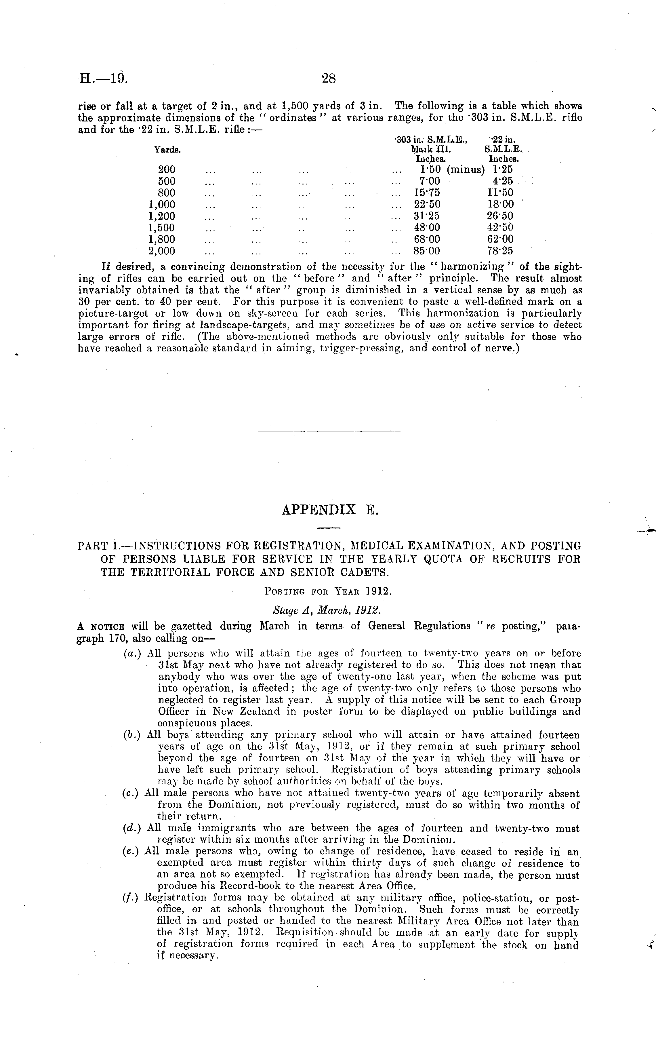 APPENDIX E. PART I.—INSTRUCTIONS FOR REGISTRATION, MEDICAL EXAMINATION, AND POSTING OF PERSONS LIABLE FOR SERVICE IN THE YEARLY QUOTA OF RECRUITS FOR THE TERRITORIAL FORCE AND SENIOR CADETS. Posting foe Year 1912. Stage A, March, 1912. A notice will be gazetted during March in terms of General Regulations "re posting," paiagraph 170, also calling on— (a.) All persons who will attain the ages of fourteen to twenty-two years on or before 31st May next who have not already registered to do so. This does not mean that anybody who was over the age of twenty-one last year, when the scheme was put into operation, is affected; the age of twenty-two only refers to those persons who neglected to register last year. A supply of this notice will be sent to each Group Officer in New Zealand in poster form to be displayed on public buildings and conspicuous places. (b.) All boys attending any primary school who will attain or have attained fourteen years of age on the 31st May, 1912, or if they remain at such primary school beyond the age of fourteen on 31st May of the year in which they will have or have left such primary school. Registration of boys attending primary schools may be made by school authorities on behalf of the boys. (c.) All male persons who have not attained twenty-two years of age temporarily absent from the Dominion, not previously registered, must do so within two months of their return. (d.) All male immigrants who are between the ages of fourteen and twenty-two must register within six months after arriving in the Dominion. (c.) All male persons who, owing to change of residence, have ceased to reside in an exempted area must register within thirty days of such change of residence to an area not so exempted. If registration has already been made, the person must produce his Record-book to the nearest Area Office. (/.) Registration forms may be obtained at any military office, police-station, or postoffice, or at schools throughout the Dominion. Such forms must be correctly filled in and posted or handed to the nearest Military Area Office not later than the 31st May, 1912. Requisition should be made at an early date for supply of registration forms required in each Area to supplement the stock on hand if necessary.