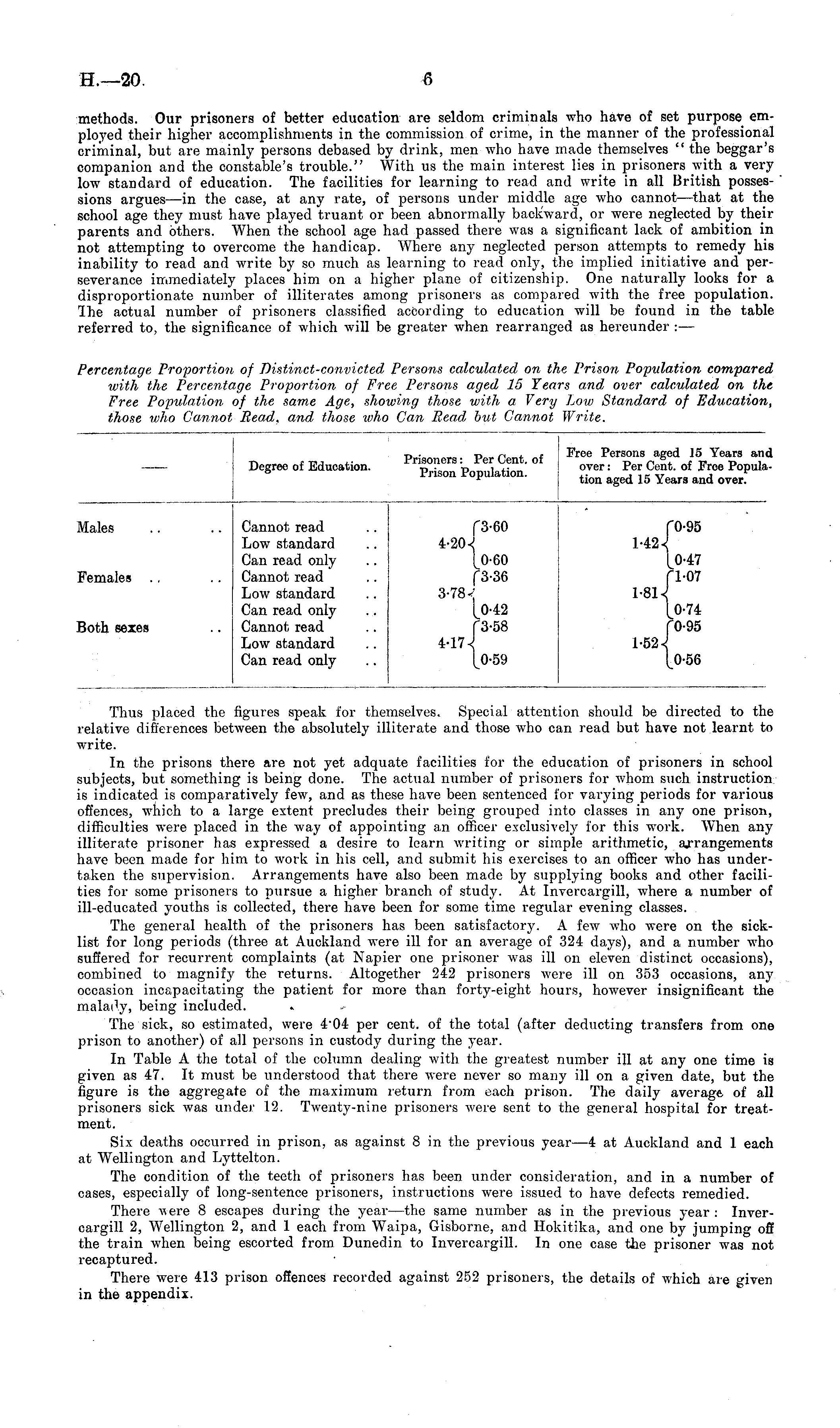 Thus placed the figures speak for themselves. Special attention should be directed to the relative differences between the absolutely illiterate and those who can read but have not learnt to write. In the prisons there are not yet adquate facilities for the education of prisoners in school subjects, but something is being done. The actual number of prisoners for whom such instruction is indicated is comparatively few, and as these have been sentenced for varying periods for various offences, which to a large extent precludes their being grouped into classes in any one prison, difficulties were placed in the way of appointing an officer exclusively for this work. When any illiterate prisoner has expressed a desire to learn writing or simple arithmetic, arrangements have been made for him to work in his cell, and submit his exercises to an officer who has undertaken the supervision. Arrangements have also been made by supplying books and other facilities for some prisoners to pursue a higher branch of study. At Invercargill, where a number of ill-educated youths is collected, there have been for some time regular evening classes. The general health of the prisoners has been satisfactory. A few who were on the sicklist for long periods (three at Auckland were ill for an average of 324 days), and a number who suffered for recurrent complaints (at Napier one prisoner was ill on eleven distinct occasions), combined to magnify the returns. Altogether 242 prisoners were ill on 353 occasions, any occasion incapacitating the patient for more than forty-eight hours, however insignificant the malady, being included. The sick, so estimated, were 4 - 04 per cent, of the total (after deducting transfers from one prison to another) of all persons in custody during the year. In Table A the total of the column dealing with the greatest number ill at any one time is given as 47. It must be understood that there were never so many ill on a given date, but the figure is the aggregate of the maximum return from each prison. The daily average of all prisoners sick was under 12. Twenty-nine prisoners were sent to the general hospital for treatment. Six deaths occurred in prison, as against 8 in the previous year —4 at Auckland and 1 each at Wellington and Lyttelton. The condition of the teeth of prisoners has been under consideration, and in a number of cases, especially of long-sentence prisoners, instructions were issued to have defects remedied. There were 8 escapes during the year —the same number as in the previous year : Invercargill 2, Wellington 2, and 1 each from Waipa, Gisborne, and Hokitika, and one by jumping off the train when being escorted from Dunedin to Invercargill. In one case the prisoner was not recaptured. There were 413 prison offences recorded against 252 prisoners, the details of which are given in the appendix.