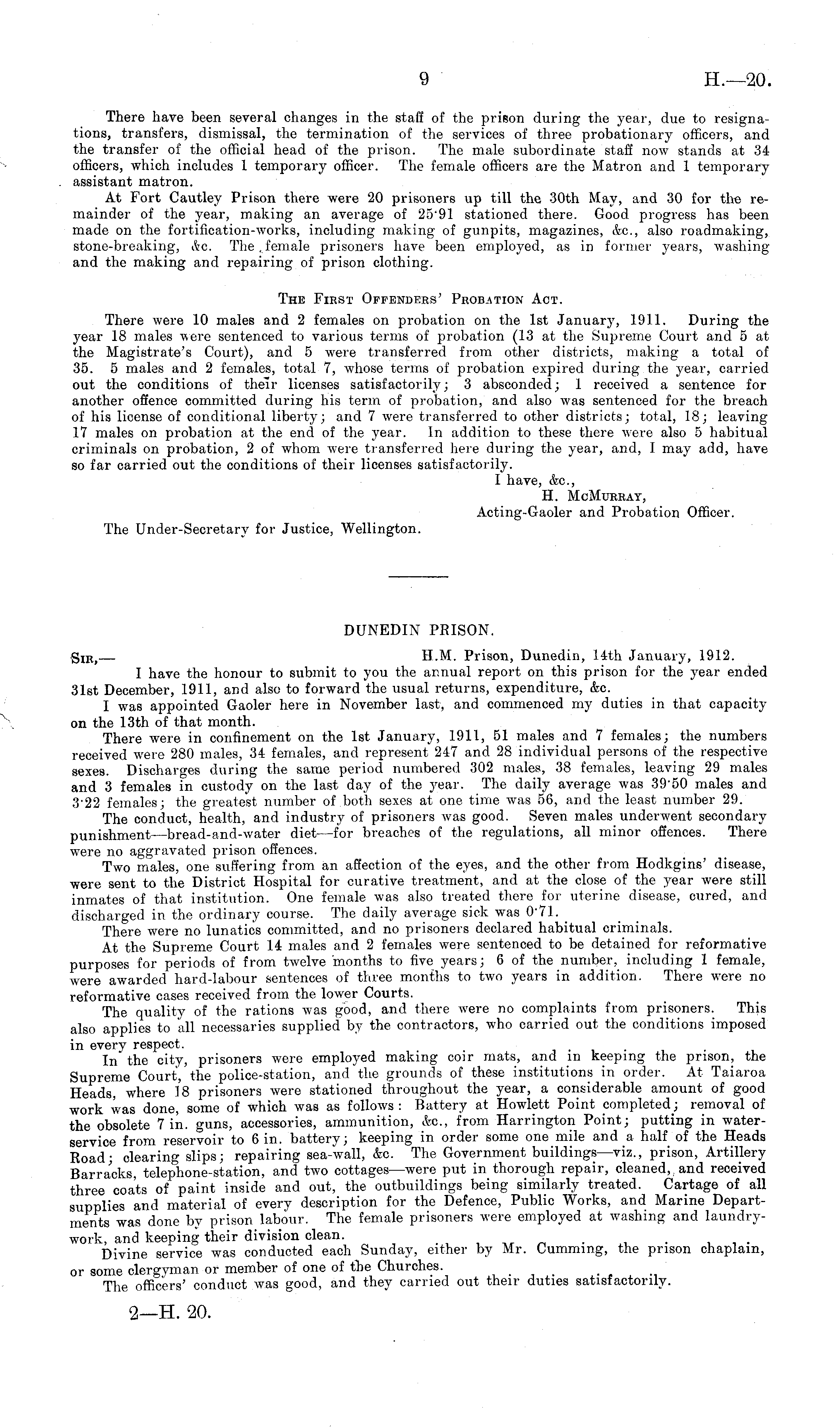 There have been several changes in the stafi of the prison during the year, due to resignations, transfers, dismissal, the termination of the services of three probationary officers, and the transfer of the official head of the prison. The male subordinate staff now stands at 34 officers, which includes 1 temporary officer. The female officers are the Matron and 1 temporary assistant matron. At Fort Cautley Prison there were 20 prisoners up till the 30th May, and 30 for th« remainder of the year, making an average of 25'91 stationed there. Good progress has been made on the fortification-works, including making of gunpits, magazines, &c, also roadmaking, stone-breaking, Ac. The , female prisoners have been employed, as in former years, washing and the making and repairing of prison clothing. The First Offenders' Probation Act. There were 10 males and 2 females on probation on the Ist January, 1911. During the year 18 males were sentenced to various terms of probation (13 at the Supreme Court and 5 at the Magistrate's Court), and 5 were transferred from other districts, making a total of 35. 5 males and 2 females, total 7, whose terms of probation expired during the year, carried out the conditions of their licenses satisfactorily; 3 absconded; 1 received a sentence for another offence committed during his term of probation, and also was sentenced for the breach of his license of conditional liberty; and 7 were transferred to other districts; total, 18; leaving 17 males on probation at the end of the year. In addition to these there were also 5 habitual criminals on probation, 2 of whom were transferred here during the year, and, I may add, have so far carried out the conditions of their licenses satisfactorily. I have, &c, H. McMurrat, Acting-Gaoler and Probation Officer. The Under-Secretary for Justice, Wellington.
