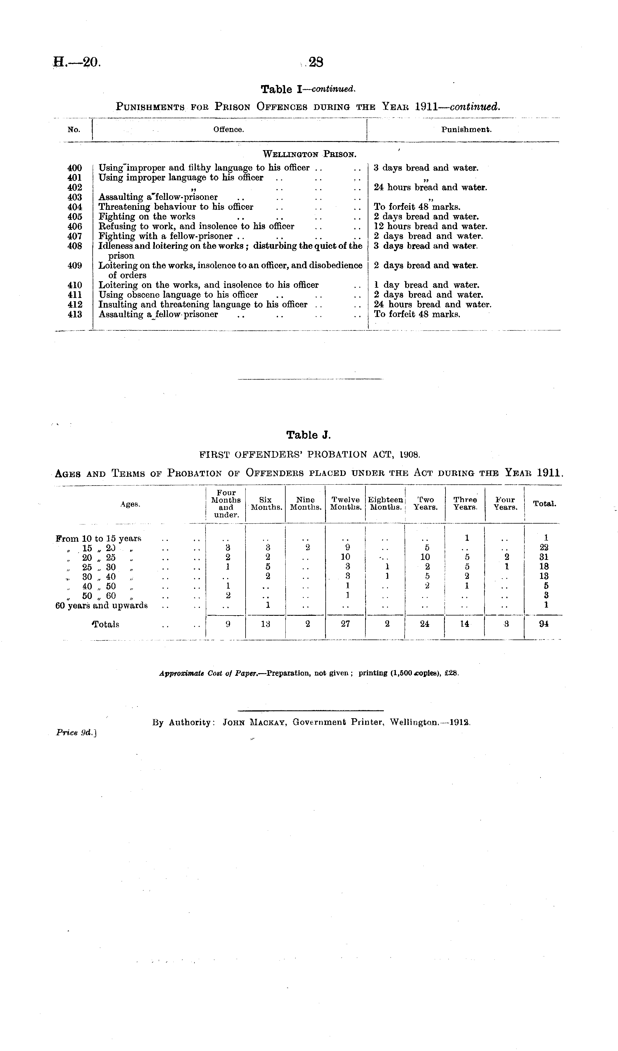 Table I — continued. Punishments for Prison Offences during the Year 1911- continued.