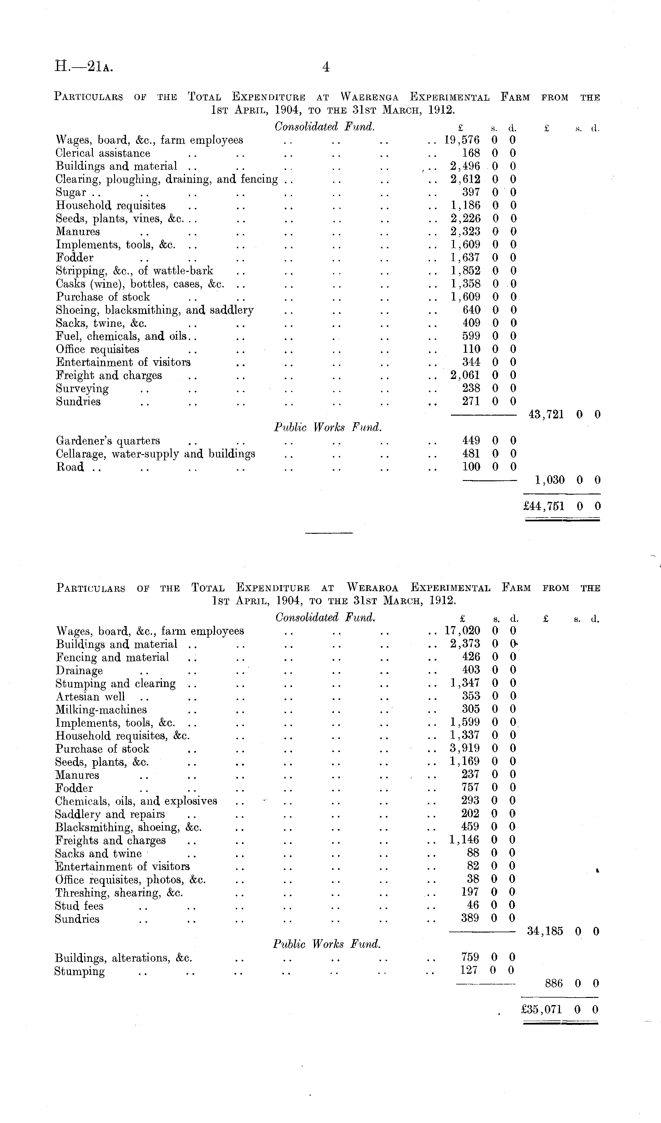 Particulars of the Total Expenditure at Waerenga Experimental Farm from the Ist April, 1904, to the 31st March, 1912. Consolidated Fund. £ s. d. £ s. d. Wages, board, &c, farm employees .. .. .. .. 19,576 0 0 Clerical assistance .. .. .. . . .. .. 168 0 0 Buildings and material .. . . . . . . . . 2,496 0 0 Clearing, ploughing, draining, and fencing . . . . . . 2,612 0 0 Sugar .. .. . . .. . . . . .. .. 397 0 0 Household requisites .. .. .. ~ .. 1,186 0 0 Seeds, plants, vines, &c. . . .. .. .. .. .. 2,226 0 0 Manures .. .. .. .. .. .. .. 2,323 0 0 Implements, tools, &c. .. .. .. .. .. 1,609 0 0 Fodder .. .. .. .. .. .. .. 1,637 0 0 Stripping, &c, of wattle-bark .. .. ~ .. .. 1,852 0 0 Casks (wine), bottles, cases, &c. .. .. .. .. .. 1,358 0 0 Purchase of stock .. .. . . . . . . 1,609 0 0 Shoeing, blacksmithing, and saddlery .. .. .. .. 640 0 0 Sacks, twine, &c. .. .. .. .. .. .. 409 0 0 Fuel, chemicals, and oils. . .. .. . . .. .. 599 0 0 Office requisites .. .. .. . . .. .. 110 0 0 Entertainment of visitors .. .. .. . . .. 344 0 0 Freight and charges .. .. .. .. .. .. 2,061 0 0 Surveying .. .. .. . . . . . . .. 238 0 0 Sundries .. .. .. .. .. .. .. 271 0 0 43,721 0 0 Public Works Fund. Gardener's quarters ~ .. .. .. . . .. 449 0 0 Cellarage, water-supply and buildings .. . . .. .. 481 0 0 Road .. .. .. .. .. .. .. .. 100 0 0 1,030 0 0 £44,751 0 0
