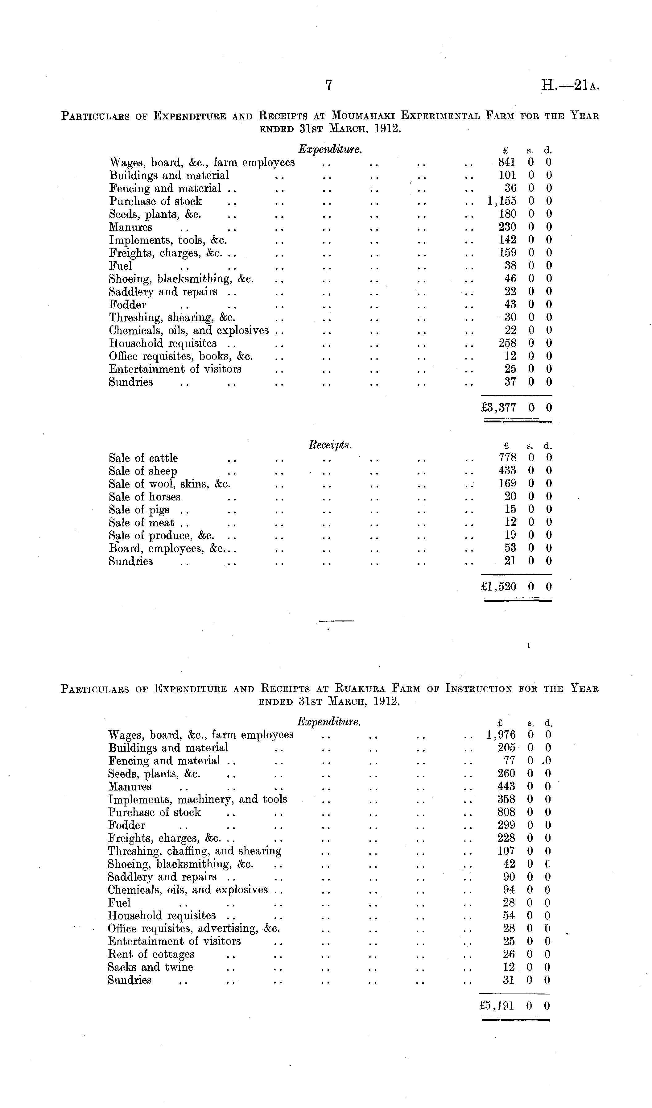 i Particulars of Expenditure and Receipts at Ruakura Farm of Instruction for the Year ended 31st March, 1912. Expenditure. £ s. d. Wages, board, &c, farm employees .. .. .. .. 1,976 0 0 Buildings and material .. .. .. .. .. 205 0 0 Fencing and material .. .. .. .. .. .. 77 0 .0 Seeds, plants, &c. .. .. .. .. .. .. 260 0 0 Manures .. .. .. .. .. .. .. 443 0 0 Implements, machinery, and tools .. . . .. " .. 358 0 0 Purchase of stock .. .. .. .. .. .. 808 0 0 Fodder .. .. .. .. .. .. .. 299 0 0 Freights, charges, &c. . . .. .. .. .. .. 228 0 0 Threshing, chaffing, and shearing ~ .. .. .. 107 0 0 Shoeing, blacksmithing, &c. . . . . . . .. . . 42 0 f. Saddlery and repairs . . .. .. .. .. .. 90 0 0 Chemicals, oils, and explosives .. .. .. .. .. 94 0 0 Fuel .. .. .. .. .. .. .. 28 0 0 Household requisites .. .. .. .. .. .. 54 0 0 Office requisites, advertising, &c. .. .. .. .. 28 0 0 Entertainment of visitors .. .. .. .. .. 25 0 0 Rent of cottages .. .. .. .. .. .. 26 0 0 Sacks and twine .. .. .. .. .. .. 12 0 0 Sundries ~ .. .. .. .. .. .. 31 0 0 £5,191 0 0