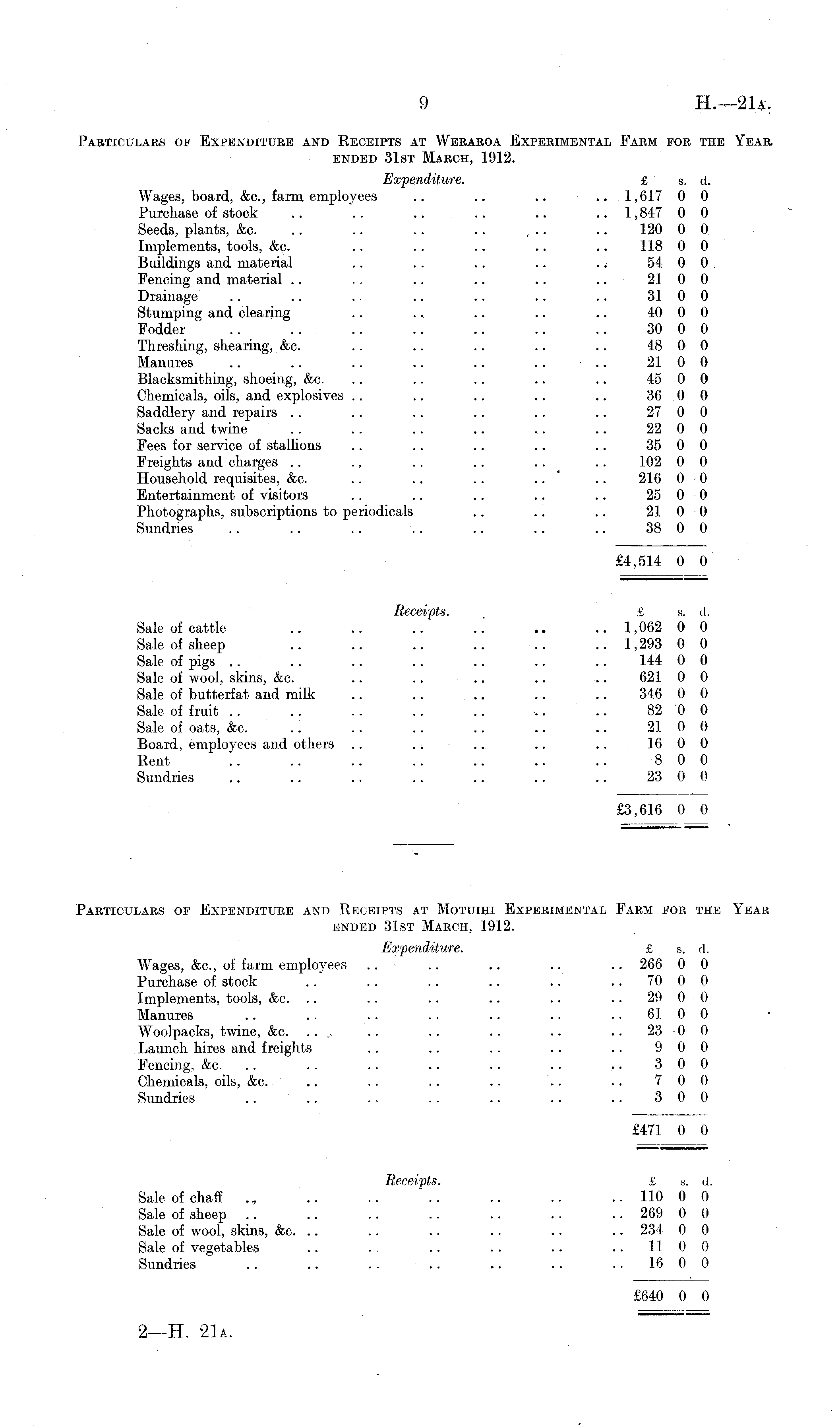Particulars of Expenditure and Receipts at Motuihi Experimental Farm for the Year ended 31st March, 1912. Expenditure. £ s. d. Wages, fee, of farm employees .. .. .. .. .. 266 0 0 Purchase of stock .. .. .. .. .. 70 0 0 Implements, tools, &c. .. .. .. .. .. 29 0 0 Manures .. .. .. .. .. .. 61 0 0 Woolpacks, twine, &c. .... .. .. .. .. 23 0 0 Launch hires and freights .. .. .. .. .. 900 Fencing, &c. .. .. .. .. .. .. ~ 3 0 0 Chemicals, oils, fee. .. .. .. .. .. .. 700 Sundries .. .. .. .. .. .. .. 300 £471 0 0 Receipts. £ s. d. Sale of chaff .. .. .. .. .. .. .. 110 0 0 Sale of sheep .. .. .. .. .. .. .. 269 0 0 Sale of wool, skins, fee. .. .. .. .. .. .. 234 0 0 Sale of vegetables .. .. .. .. .. .. 11 0 0 Sundries .. .. .. .. .. .. .. 16 0 0 £640 0 0
