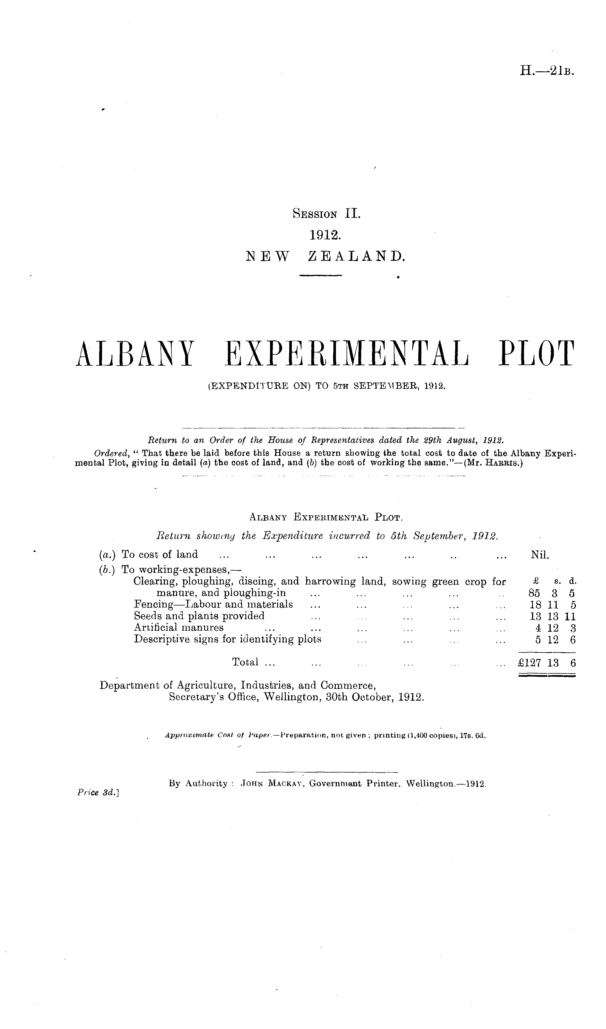 Albany Experimental Plot. Return showing the Expenditure incurred to sth September, 1912. (a.) To cost of land ... ... ... ... ... ... ... Nil. (b.) To working-expenses, — Clearing, ploughing, discing, and harrowing land, sowing green crop for & s. d. manure, and ploughing-in ... ... ... ... .. 85 3 5 Fencing—Labour and materials ... ... ... ... ... 18 11 5 Seeds and plants provided ... ... ... ... ... 13 13 11 Artificial manures ... ... ... ... ... ... 4 12 3 Descriptive signs for identifying plots ... ... ... ... 5 12 6 Total ... ... ... ... ... ... £127 13 6 Department of Agriculture, Industries, and Commerce, Secretary's Office, Wellington, 30th October, 1912. Approximate Cost of Paper. —Preparation, not given ; printing (1,400 copies), 17s. Cd.