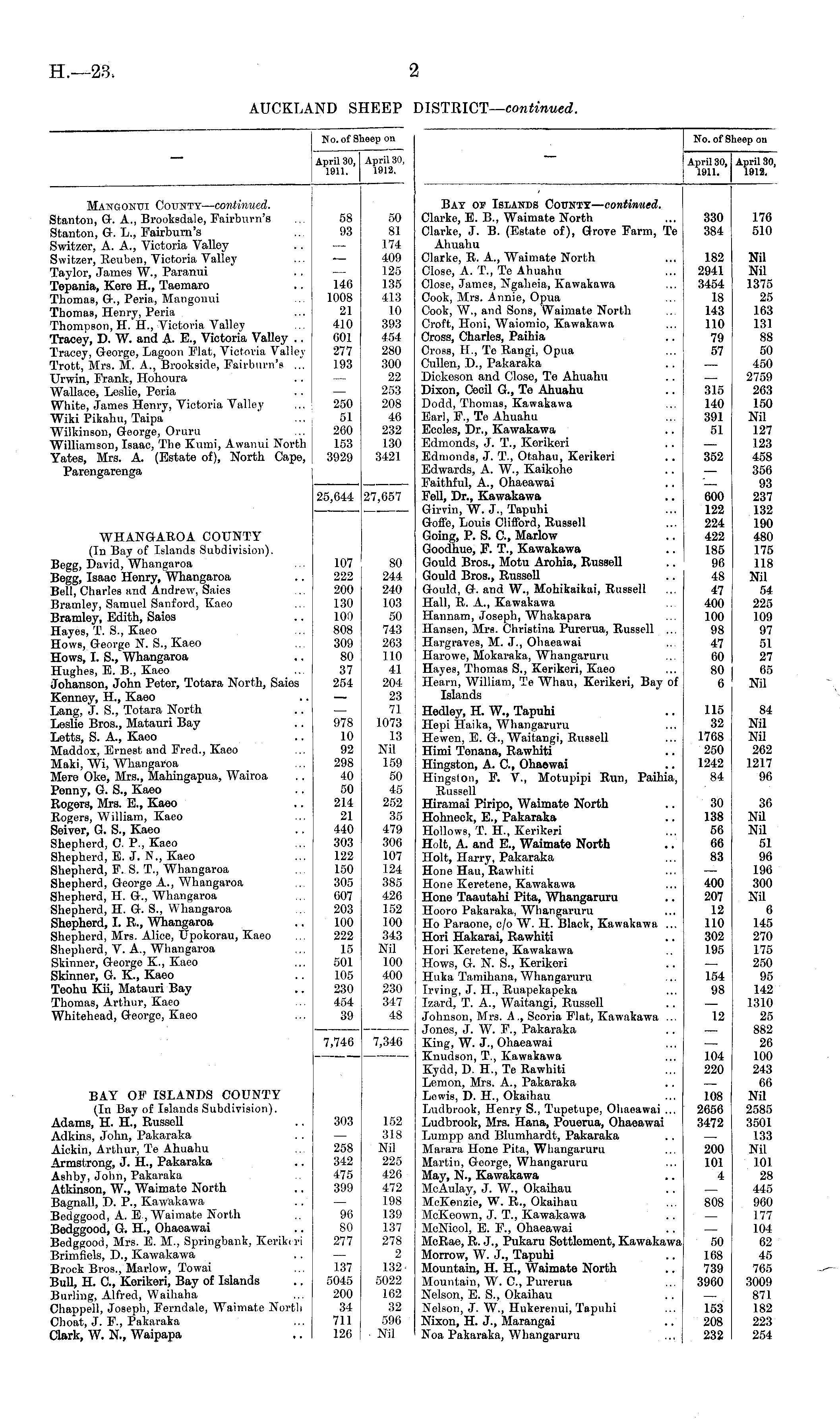 AUCKLAND SHEEP ISTRICT—continued. No. of Sheep on No. of Sheep on April 30, April 30, 1911. 1912, April 30, April 30, 1911. 1912. Mangonui County— continued. Stanton, G. A., Brooksdale, Fairburn's Stanton, G. L., Fairburn's Switzer, A. A., Victoria Valley Switzer, Reuben, Victoria Valley Taylor, James W., Paranui Tepania, Kere H., Taemaro Thomas, G., Peria, Mangonui Thomas, Henry, Peria Thompson, H. H., Victoria Valley Tracey, D. W. and A- E., Victoria VaUey .. Tracey, George, Lagoon Flat, Victoria Valley Trott, Mrs. M. A., Brookside, Fairburn's ... Urwin, Frank, Hohoura Wallace, Leslie, Peria White, James Henry, Victoria Valley Wiki Pikahu, Taipa Wilkinson, George, Oruru Williamson, Isaac, The Kumi, Awanui North Yates, Mrs. A. (Estate of), North Cape, Parengarenga WHANGAROA COUNTY (In Bay of Islands Subdivision). Begg, David, Whangaroa Begg, Isaac Henry, Whangaroa Bell, Charles and Andrew, Saies Bramley, Samuel Sanford, Kaeo Bramley, Edith, Saies Hayes, T. S., Kaeo Hows, George N. S., Kaeo Hows, I. S., Whangaroa Hughes, E. B., Kaeo Johanson, John Peter, Totara North, Saies Kenney, H., Kaeo Lang, J. S., Totara North Leslie Bros., Matauri Bay Letts, S. A, Kaeo Maddox, Ernest and Fred., Kaeo Maki, Wi, Whangaroa Mere Oke, Mrs., Mahingapua, Wairoa Penny, G. S., Kaeo Rogers, Mrs. E., Kaeo Rogers, William, Kaeo Seiver, G. S., Kaeo Shepherd, C. P., Kaeo Shepherd, E. J. N., Kaeo Shepherd, F. S. T., Whangaroa Shepherd, George A., Whangaroa Shepherd, H. G., Whangaroa Shepherd, H. G. S., Whangaroa Shepherd, I. R., Whangaroa Shepherd, Mrs. Alice, Upokorau, Kaeo Shepherd, V. A., Whangaroa Skinner, George K., Kaeo Skinner, G. K., Kaeo Teohu Kii, Matauri Bay Thomas, Arthur, Kaeo Whitehead, George, Kaeo 25,644 107 222 200 130 100 808 309 80 37 254 978 10 92 298 40 50 214 21 440 303 122 150 305 607 203 100 222 15 501 105 230 454 39 58 93 146 1008 21 410 601 277 193 250 51 260 153 3929 27,657 80 244 240 103 50 743 263 110 41 204 23 71 1073 13 Nil 159 50 45 252 35 479 306 107 124 385 426 152 100 343 Nil 100 400 230 347 48 50 81 174 409 125 135 413 10 393 454 280 300 22 253 208 46 232 130 3421 Bay 01- Islands County— continued. Clarke, E. B., Waimate North Clarke, J. B. (Estate of), Grove Farm, Te Ahuahu Clarke, R. A., Waimate North Close, A. T., Te Ahuahu Close, James, Ngaheia, Kawakawa Cook, Mrs. Annie, Opua Cook, W., and Sons, Waimate North Croft, Honi, Waiomio, Kawakawa Cross, Charles, Paihia Cross, IL, Te Rangi, Opua Cullen, D., Pakaraka Dickeson and Close, Te Ahuahu Dixon, Cecil G., Te Ahuahu Dodd, Thomas, Kawakawa Earl, F., Te Ahuahu Eccles, Dr., Kawakawa Edmonds, J. T., Kerikeri Edmonds, J. T., Otahau, Kerikeri Edwards, A. W., Kaikohe Faithful, A., Ohaeawai FeU, Dr., Kawakawa Girvin, W. J., Tapuhi Goffe, Louis Clifford, Russell Going, P. S. ft, Marlow Goodhue, F. T., Kawakawa Gould Bros., Motu Arohia, RusseU Gould Bros., RusseU Gould, G. and W., Mohikaikai, Russell Hall, R. A., Kawakawa Hannam, Joseph, Whakapara Hansen, Mrs. Christina Purerua, Russell ... Hargraves, M. J., Ohaeawai Harowe, Mokaraka, Whangaruru Hayes, Thomas S., Kerikeri, Kaeo Hearn, William, Te Whau, Kerikeri, Bay of Islands Hedley, H. W., Tapuhi Hepi Haika, Whangaruru Hewen, B. G., Waitangi, Russell Himi Tenana, Rawhiti Hingston, A. ft, Ohaewai Hingston, F. V., Motupipi Run, Paihia, Russell Hiramai Piripo, Waimate North Hohneck, E., Pakaraka Hollows, T. H, Kerikeri Holt, A. and E., Waimate North Holt, Harry, Pakaraka Hone Hau, Rawhiti Hone Keretene, Kawakawa Hone Taautahi Pita, Whangaruru Hooro Pakaraka, Whangaruru Ho Paraone, c/o W. H. Black, Kawakawa .., Hori Hakarai, Rawhiti Hori Keretene, Kawakawa Hows, G. N. S., Kerikeri Huka Tamihana, Whangaruru Irving, J. H., Ruapekapeka Izard, T. A., Waitangi, Russell Johnson, Mrs. A,, Scoria Flat, Kawakawa ... Jones, J. W. F., Pakaraka King, W. J., Ohaeawai Knudson, T., Kawakawa Kydd, D. H, Te Rawhiti Lemon, Mrs. A., Pakaraka Lewis, D. H, Okaihau Ludbrook, Henry S., Tupetupe, Ohaeawai ... Ludbrook, Mrs. Hana, Pouerua, Ohaeawai Lumpp and Bhimhardt, Pakaraka Marara Hone Pita, Whangaruru Martin, George, Whangaruru May, N., Kawakawa McAulay, J. W., Okaihau McKenzie, W. R., Okaihau McKeown, J. T., Kawakawa McNicol, E. F., Ohaeawai McRae, R. J., Pukaru Settlement, Kawakawa Morrow, W. J., Tapuhi Mountain, H. H., Waimate North Mountain, W. ft, Purerua Nelson, E. S., Okaihau Nelson, J. W., Hukerenui, Tapuhi Nixon, H. J., Marangai Noa Pakaraka, Whangaruru 330 384 182 2941 3454 18 143 110 79 57 315 140 391 51 352 600 122 224 422 185 96 48 47 400 100 98 47 60 80 6 115 32 1768 250 1242 84 176 510 Nil Nil 1375 25 163 131 88 50 450 2759 263 150 Nil 127 123 458 356 93 237 132 190 480 175 118 Nil 54 225 109 97 51 27 65 Nil 84 Nil Nil 262 1217 96 7,746 7,346 30 138 56 66 83 400 207 12 110 302 195 154 98 12 104 220 36 NU Nil 51 96 196 300 NU 6 145 270 175 250 95 142 1310 25 882 26 100 243 66 Nil 2585 3501 133 Nil 101 28 445 960 177 104 62 45 765 3009 871 182 223 254 BAY OF ISLANDS COUNTY (In Bay of Islands Subdivision). Adams, H. H., RusseU Adkins, John, Pakaraka Aickin, Arthur, Te Ahuahu Armstrong, J. H., Pakaraka Ashby, John, Pakaraka Atkinson, W., Waimate North Bagnall, D. P., Kawakawa Bedggood, A. E, Waimate North Bedggood, G. H, Ohaeawai Bedggood, Mrs. E. M., Springbank, Kerikeri Brimfiels, D., Kawakawa Brock Bros., Marlow, Towai Bull, H. ft, Kerikeri, Bay of Islands Burling, Alfred, Waihaha Chappell, Joseph, Ferndale, Waimate North Choat, J. F., Pakaraka Clark, W. N., Waipapa 303 258 342 475 399 96 80 277 152 318 Nil 225 426 472 198 139 137 278 2 1325022 162 32 596 ■ Nil 108 2050 3472 200 101 4 808 137 5045 200 34 711 126 50 108 739 3900 153 208 232