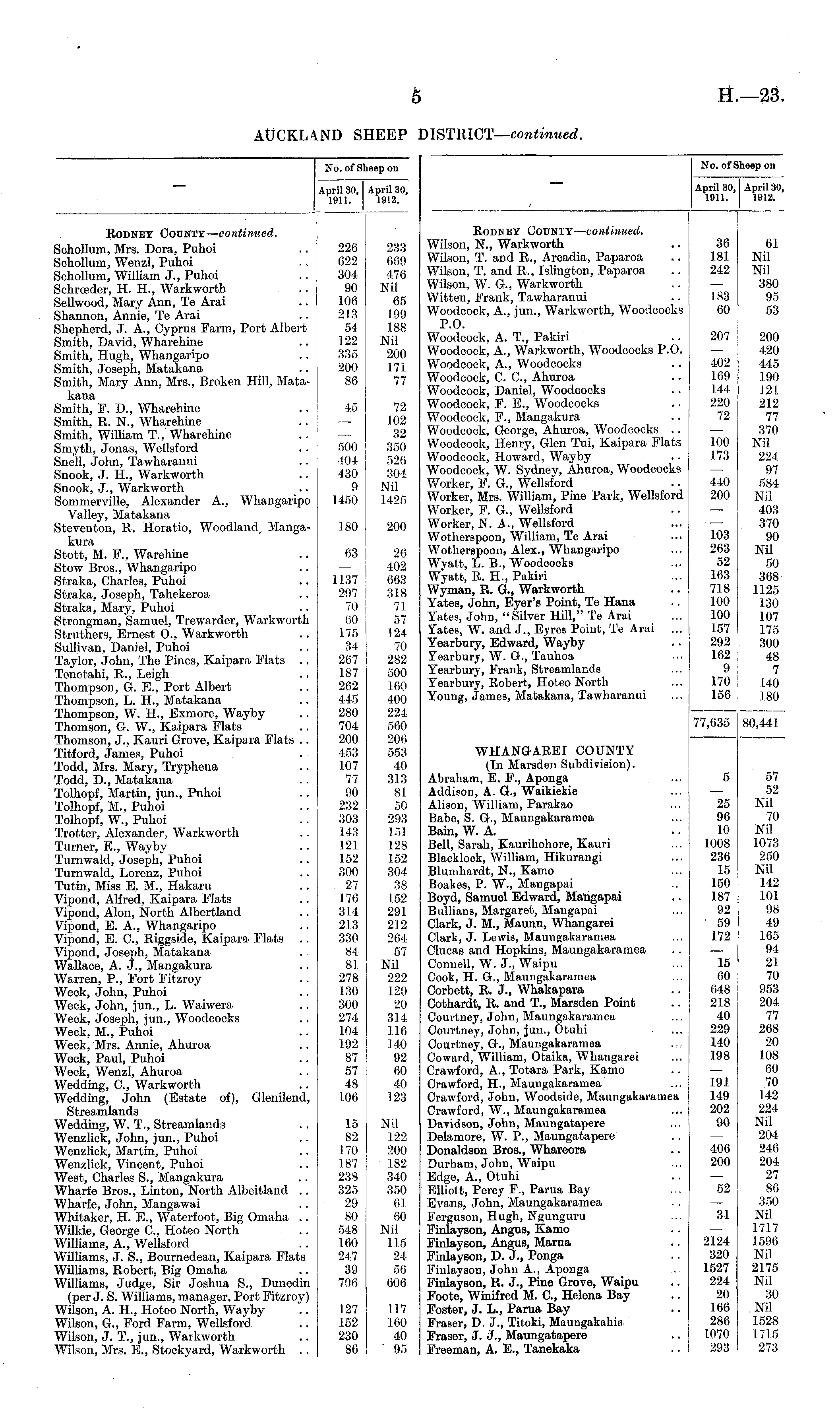 April 30, April 30, 1911. 1912. No. of Sheep on No. of Sheep on April 30, April 30, 1911. 1912. Rodney County— continued. Scholium, Mrs. Dora, Puhoi Scholium, Wenzl, Puhoi SchoUum, William J., Puhoi Schrceder, H. H., W 7 arkworth Sellwood, Mary Ann, Te Arai Shannon, Annie, Te Arai Shepherd, J. A., Cyprus Farm, Port Albert Smith, David, Wharehine Smith, Hugh, Whangaripo Smith, Joseph, Matakana Smith, Mary Ann, Mrs., Broken Hill, Matakana Smith, F. D., Wharehine Smith, R. N., Wharehine Smith, William T., Wharehine Smyth, Jonas, Wellsford Snell, John, Tawharanui Snook, J. H., Warkworth Snook, J., Warkworth Sommerville, Alexander A., Whangaripo Valley, Matakana Steventon, R. Horatio, Woodland, Mangakura Stott, M. P., Warehine Stow Bros., Whangaripo Straka, Charles, Puhoi Straka, Joseph, Tahekeroa Straka, Mary, Puhoi Strongman, Samuel, Trewarder, Warkworth Struthers, Ernest O., Warkworth Sullivan, Daniel, Puhoi Taylor, John, The Pines, Kaipara Flats .. Tenetahi, R., Leigh Thompson, G. E., Port Albert Thompson, L. IL, Matakana Thompson, W. H., Exmore, Wayby Thomson, G. W., Kaipara Flats Thomson, J., Kauri Grove, Kaipara Flats .. Titford, James, Puhoi Todd, Mrs. Mary, Tryphena Todd, D., Matakana Tolhopf, Martin, jun., Puhoi Tolhopf, M., Puhoi Tolhopf, W., Puhoi Trotter, Alexander, Warkworth Turner, E., Wayby Turnwald, Joseph, Puhoi Turnwald, Lorenz, Puhoi Tutin, Miss E. M., Hakaru Vipond, Alfred, Kaipara Fiats Vipond, Alon, North Albertland Vipond. E. A., Whangaripo Vipond, E. C, Riggside, Kaipara Flats Vipond, Joseph, Matakana WaUace, A. J., Mangakura Warren, P., Fort Fitzroy Week, John, Puhoi Week, John, jun., L. Waiwera Week, Joseph, jun., Woodcocks Week, M., Puhoi Week, Mrs. Annie, Ahuroa Week, Paul, Puhoi Week, Wenzl, Ahuroa Wedding, C, Warkworth Wedding, John (Estate of), Glenilend, Streamlands Wedding, W. T., Streamlands WenzHck, John, jun., Puhoi Wenzliek, Martin, Puhoi WenzUck, Vincent, Puhoi West, Charles S., Mangakura Wharfe Bros., Linton, North Albeitland .. W'harfe. John, Mangawai Whitaker, H. E., Waterfoot, Big Omaha .. Wilkie, George C, Hoteo North WiUiams, A., Wellsford Williams, J. S., Bournedean, Kaipara Flats WUliams, Robert, Big Omaha WilUams, Judge, Sir Joshua S., Dunedin (per J. S. Williams, manager. Port Fitzroy) Wilson, A. H., Hoteo North, Wayby Wilson, G., Ford Farm, Wellsford Wilson, J. T., jun., Warkworth Wilson, Mrs. E., Stockyard, Warkworth .. 226 622 304 90 106 213 54 122 335 200 86 45 500 404 430 9 1450 233 669 476 NU 65 199 188 Nil 200 171 77 72 102 32 350 526 304 Nil 1425 Rodney County— continued. Wilson, N., Warkworth WUson, T. and R., Arcadia, Paparoa Wilson, T. and R., Islington, Paparoa WUson, W. G., Warkworth Witten, Frank, Tawharanui Woodcock, A., jun., Warkworth, Woodcocks P.O. Woodcock, A. T., Pakiri Woodcock, A., Warkworth, Woodcocks P.O. Woodcock, A., Woodcocks Woodcock, C. C, Ahuroa Woodcock, Daniel, Woodcocks Woodcock, F. E., Woodcocks Woodcock, F., Mangakura Woodcock, George, Ahuroa, Woodcocks .. Woodcock, Henry, Glen Tui, Kaipara Flats Woodcock, Howard, Wayby Woodcock, W. Sydney, Ahuroa, Woodcocks Worker, F. G., Wellsford Worker, Mrs. William, Pine Park, Wellsford Worker, F. G., Wellsford Worker, N. A., Wellsford Wotherspoon, WiUiam, Te Arai Wotherspoon, Alex., Whangaripo Wyatt, L. B., Woodcocks Wyatt, R. H., Pakiri Wyman, R. G., Warkworth Yates, John, Eyer's Point, Te Hana Yates, John, " Silver Hill," Te Arai Yates, W. and J., Eyres Point, Te Arai ... Yearbury, Edward, Wayby Yearbury, W. G., Tauhoa Yearbury, Frank, Streamlands Yearbury, Robert, Hoteo North Young, James, Matakana, Tawharanui 36 181 242 183 60 207 402 169 144 220 72 100 173 440 200 61 Nil Nil 380 95 53 200 420 445 190 121 212 77 370 Nil 224 97 584 Nil 403 370 90 Nil 50 368 1125 130 107 175 300 48 7 140 180 180 200 63 1137 297 70 00 175 34 267 187 262 445 280 704 200 453 107 77 90 232 303 143 121 152 300 27 176 314 213 330 84 81 278 130 300 274 104 192 87 57 48 106 26 402 663 318 71 57 124 70 282 500 160 400 224 560 206 553 40 313 81 50 293 151 128 152 304 38 152 291 212 264 57 Nil 222 120 20 314 116 140 92 60 40 123 103 263 52 163 718 100 100 157 292 162 9 170 156 77,635 80,441 WHANGAREI COUNTY (In Marsden Subdivision). Abraham, E. F., Aponga Addison, A. G., Waikiekie Alison, William, Parakao Babe, S. &., Maungakaramea Bain, W. A. Bell, Sarah, Kaurihohore, Kauri Blacklock, William, Hikurangi Blumhardt, N., Kamo Boakes, P. W., Mangapai Boyd, Samuel Edward, Mangapai Bullians, Margaret, Mangapai Clark, J. M., Maunu, Whangarei Clark, J. Lewis, Maungakaramea Clucas and Hopkins, Maungakaramea Connell, W. J., Waipu Cook, H. G., Maungakaramea Corbett, R. J., Whakapara Cothardt, R. and T., Marsden Point Courtney, John, Maungakaramea Courtney, John, jun., Otuhi Courtney, G., Maungakaramea Coward, William, Otaika, Whangarei Crawford, A., Totara Park, Kamo Crawford, H., Maungakaramea Crawford, John, Woodside, Maungakaramea Crawford, W., Maungakaramea Davidson, John, Maungatapere Delamore, W. P., Maungatapere Donaldson Bros., Whareora Durham, John, Waipu Edge, A., Otuhi Elliott, Percy P., Parua Bay Evans, John, Maungakaramea Ferguson, Hugh, Ngunguru Finlayson, Angus, Kamo Finlayson, Angus, Marua Finlayson, D. J., Ponga Finlayson, John A., Aponga Finlayson, R. J., Pine Grove, Waipu Foote, Winifred M. G, Helena Bay Foster, J. L., Parua Bay Fraser, D. J., Titoki, Maungakahia Fraser, J. J., Maungatapere Freeman, A. E., Tanekaka 5 25 96 10 1008 236 15 150 187 92 ■ 59 172 15 00 648 218 40 229 140 198 57 52 Nil 70 Nil 1073 250 NU 142 101 98 49 165 94 21 70 953 204 77 268 20 108 60 70 142 224 Nil 204 246 204 27 86 350 NU 1717 1590 Nil 2175 Nil 30 Nil 1528 1715 273 191 149 202 90 15 82 170 187 238 325 29 80 548 160 247 39 706 Nil 122 -200 182 340 350 61 60 Nil 115 24 56 606 406 200 52 31 2124 320 1527 224 20 166 286 1070 293 127 152 230 86 117 160 40 ' 95