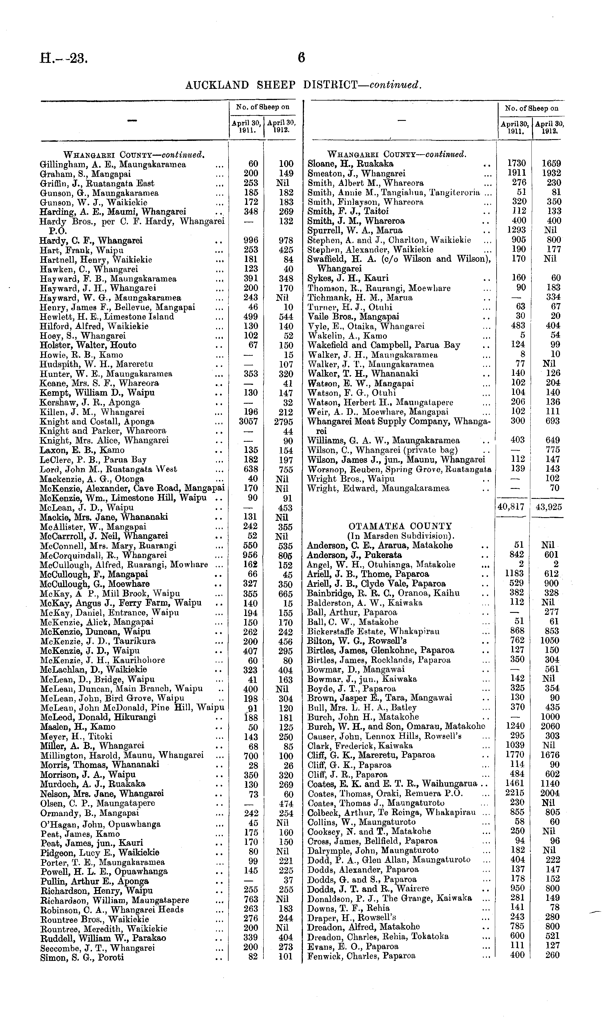 No. of Sheep on April 30, April 30, 1911. 1912. No. of Sheep on April 30, April 30, 1911. 1912, Whangarei County— continued. Gillingham, A. E., Maungakaramea Graham, S., Mangapai Griffin, J., Ruatangata East Gunson, G., Maungakaramea Gunson, W. J., Waikiekie Harding, A. E., Maumi, Whangarei Hardy Bros., per C. F. Hardy, Whangarei P.O. Hardy, C. F., Whangarei Hart, Frank, Waipu Hartnell, Henry, Waikiekie ... Hawken, G, Whangarei Hayward, F. B., Maungakaramea Hayward, J. H., Whangarei Hayward, W. G., Maungakaramea Henry, James F., Bellevue, Mangapai Hewlett, H. E., Limestone Island Hilford, Alfred, Waikiekie Hoey, S., Whangarei Holster, Walter, Houto Howie, R. B., Kamo Hudspith, W. H., Mareretu Hunter, W. E., Maungakaramea Keane, Mrs. S. F., Whareora Kempt, WUliam D., Waipu Kershaw, J. R., Aponga Killen, J. M., Whangarei Knight and Costall, Aponga Knight and Parker, Whareora Knight, Mrs. Alice, Whangarei Laxon, E. B., Kamo LeClere, P. B., Parua Bay Lord, John M., Ruatangata West Mackenzie, A. G., Otonga McKenzie, Alexander, Cave Road, Mangapai McKenzie, Wm., Limestone HUI, Waipu .. McLean, J. D., Waipu Mackie, Mrs. Jane, Whananaki McAllister, W., Mangapai McCarrroll, J. NeU, Whangarei McConnell, Mrs. Mary, Ruarangi McCorquindall, R., Whangarei McCullough, Alfred, Ruarangi, Mowhare ... McCuUough, P., Mangapai McCuUough, G., Moewhare McKay, A P., Mill Brook, Waipu McKay, Angus J., Ferry Farm, Waipu McKay, Daniel, Entrance, Waipu McKenzie, Alick, Mangapai McKenzie, Duncan, Waipu McKenzie, J. D., Taurikura McKenzie, J. D., Waipu McKenzie, J. H., Kaurihohore McLachlan, D., Waikiekie McLean, D., Bridge, Waipu McLean, Duncan, Main Branch, Waipu McLean, John, Bird Grove, Waipu McLean, John McDonald, Pine Hill, Waipu McLeod, Donald, Hikurangi Maslen, H., Kamo Meyer, H., Titoki MUler, A. B., Whangarei Millington, Harold, Maunu, Whangarei ... Morris, Thomas, Whananaki Morrison, J. A., Waipu Murdoch, A. J., Ruakaka Nelson, Mrs. Jane, Whangarei Olsen, C. P., Maungatapere Ormandy, B., Mangapai O'Hagan, John, Opuawhanga Peat, James, Kamo Peat, James, jun., Kauri Pidgeon, Lucy E., Waikiekie Porter, T. E., Maungakaramea Powell, H. L. E., Opuawhanga PuUin, Arthur E., Aponga Richardson, Henry, Waipu Richardson, William, Maungatapere Robinson, C. A., Whangarei Heads Rountree Bros., Waikiekie Rountree, Meredith, Waikiekie Ruddell, WUliam W., Parakao Seccombe, J. T., Whangarei Simon, S. G., Poroti 60 200 253 185 172 348 996 253 181 123 391 200 243 46 499 130 102 67 353 130 196 3057 135 182 638 40 170 90 131 242 52 550 956 162 66 327 355 140 194 150 262 200 407 60 323 41 400 198 91 188 50 143 68 700 28 350 130 73 100 149 Nil 182 183 269 132 978 425 84 40 348 170 Nil 10 544 140 52 150 15 107 320 41 147 32 212 2795 44 90 154 197 755 Nil NU 91 453 NU 355 Nil 535 805 152 45 350 665 15 155 170 242 456 295 80 404 163 NU 304 120 181 125 250 85 100 26 320 269 60 474 254 Nil 160 150 Nil 221 225 37 255 Nil 183 244 Nil 404 273 101 Whangarei County— continued. Sloane, H., Ruakaka Smeaton, J., Whangarei Smith, Albert M., Whareora Smith, Annie M., Tangiahua, Tangiteroria ... Smith, Finlayson, Whareora Smith, F. J., Taitoi Smith, J. M., Whareroa Spurrell, W. A., Marua Stephen, A. and J., Charlton, Waikiekie Stephen, Alexander, Waikiekie Swaffield, H. A. (c/o Wilson and Wilson), Whangarei Sykes, J. H., Kauri Thomson, R., Raurangi, Moewhare Tichmank, H. M., Marua Turner, H. J., Otuhi Vaile Bros., Mangapai Vyle, E., Otaika, Whangarei Wakelin, A., Kamo Wakefield and Campbell, Parua Bay Walker, J. H., Maungakaramea Walker, J. T., Maungakaramea Walker, T. H., Whananaki Watson, E. W., Mangapai Watson, F. G., Otuhi Watson, Herbert H., Maungatapere Weir, A. D.. Moewhare, Mangapai Whangarei Meat Supply Company, Whangarei WUliams, G. A. W., Maungakaramea Wilson, C, Whangarei (private bag) WUson, James J., jun., Maunu, Whangarei Worsnop, Reuben, Spring Grove, Ruatangata Wright Bros., Waipu Wright, Edward, Maungakaramea OTAMATEA COUNTY (In Marsden Subdivision). Anderson, 0. E., Ararua, Matakohe Anderson, J., Pukerata Angel, W. H., Otuhianga, Matakohe ArieU, J. B., Thome, Paparoa ArieU, J. B., Clyde Vale, Paparoa Bainbridge, R. R. C, Oranoa, Kaihu Balderston, A. W., Kaiwaka Ball, Arthur, Paparoa Ball, C. W., Matakohe Bickerstaffe Estate, Whakapirau BUton, W. G., RowseU's Birtles, James, Glenkohne, Paparoa Birtles, James, Rocklands, Paparoa Bowmar, D., Mangawai Bowmar, J., jun., Kaiwaka Boyde, J. T., Paparoa Brown, Jasper E., Tara, Mangawai Bull, Mrs. L. H. A., Batley Burch, John H., Matakohe Burch, W. H., and Son, Omarau, Matakohe Causer, John, Lennox Hills, Rowsell's Clark, Frederick, Kaiwaka Cliff, G. K., Mareretu, Paparoa Cliff, G. K., Paparoa Cliff, J. R., Paparoa Coates, E. K. and E. T. R., Waihungarua .. Coates, Thomas, Oraki, Remuera P.O. Coates, Thomas J., Maungaturoto Colbeck, Arthur, Te Reinga, Whakapirau ... Collins, W., Maungaturoto Cooksey, N. and T., Matakohe Cross, James, Bellfield, Paparoa Dalrymple, John, Maungaturoto Dodd, P. A., Glen Allan, Maungaturoto Dodds, Alexander, Paparoa Dodds, G. and S., Paparoa Dodds, J. T. and R., Wairere Donaldson, P. J., The Grange, Kaiwaka ... Downs, T. F., Rehia Draper, H., Rowsell's Dreadon, Alfred, Matakohe Dreadon, Charles, Rehia, Tokatoka Evans, E. O., Paparoa Fenwick, Charles, Paparoa 1730 1911 276 51 320 112 400 1293 905 190 170 160 90 63 30 483 5 124 8 77 140 102 104 206 102 300 403 112 139 40,817 51 842 2 1183 529 382 112 1659 1932 230 81 350 133 400 Nil 800 177 Nil 60 183 334 67 20 404 54 99 10 Nil 126 204 140 136 111 693 649 775 147 143 102 70 j 43,925 NU 601 2 612 900 328 Nil 277 61 853 1050 150 304 561 Nil 354 90 435 1000 2060 303 Nil 1676 90 602 1140 2004 Nil 805 60 Nil 96 Nil 222 147 152 800 149 78 280 800 521 127 260 51 868 762 127 350 142 325 130 370 242 45 175 170 80 99 145 1240 295 1039 1770 114 484 1461 2215 230 855 58 250 94 182 404 137 178 950 281 141 243 785 600 111 400 255 763 263 276 200 339 200 82