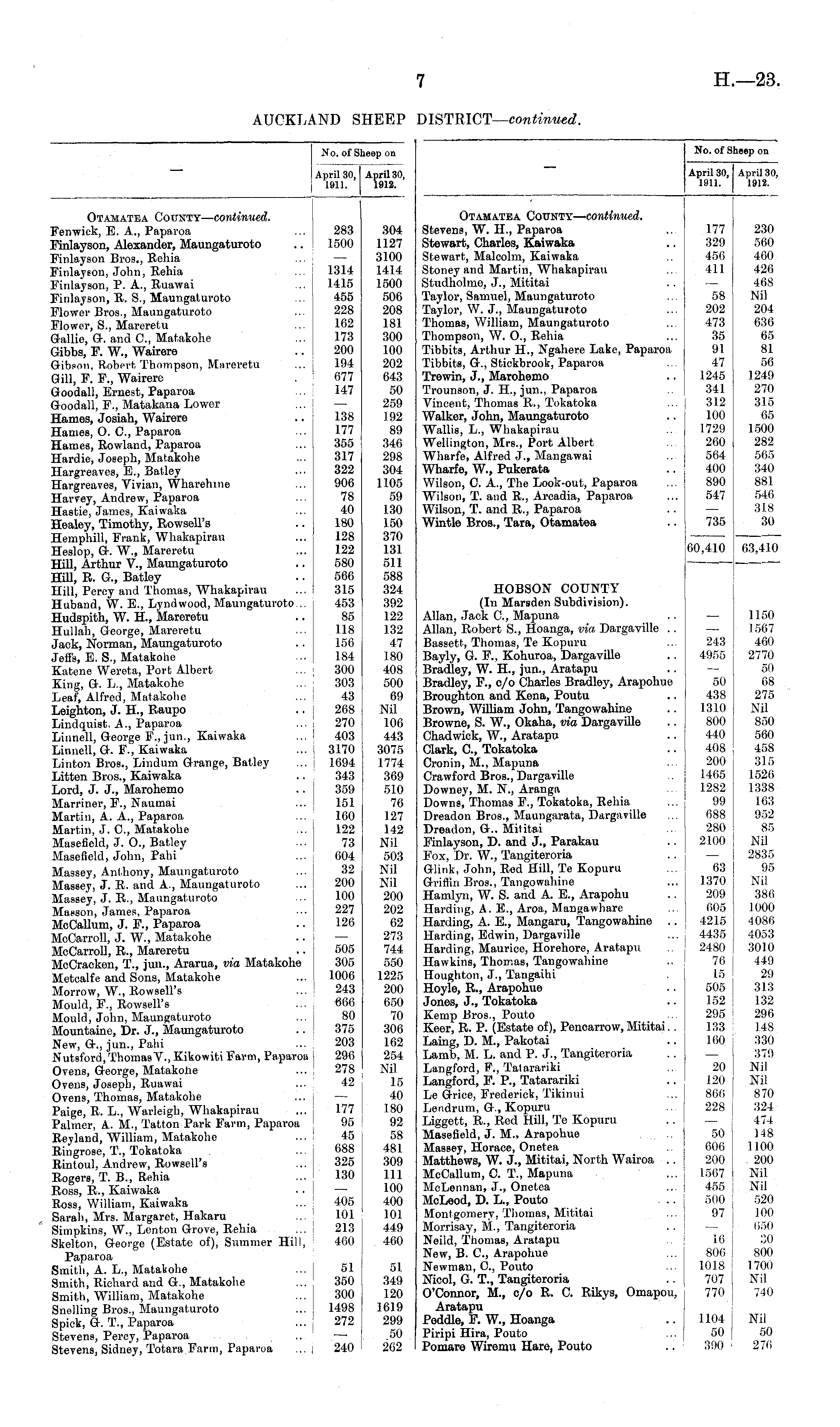 No. of Sheep on April 30,1 April 3 1911. 1912. April 30, April 30, 1911. 1912. No. of Sheep on April 30, 1912. Otamatea County— continued. Fenwick, E. A., Paparoa Finlayson, Alexander, Maungaturoto Finlayson Bros., Rehia Finlayson, John, Rehia Finlayson, P. A., Ruawai Finlayson, R. S., Maungaturoto Flower Bros., Maungaturoto Flower, S., Mareretu Gallie, G. and G, Matakohe Gibbs, E. W., Wairere Gibson, Robert Thompson, Mareretu Gill, F. F., Wairere Goodall, Ernest, Paparoa Goodall, F., Matakana Lower Hames, Josiah, Wairere Hames, O. G, Paparoa Hames, Rowland, Paparoa Hardie, Joseph, Matakohe Hargreaves, E., Batley Hargreaves, Vivian, Wharehine Harvey, Andrew, Paparoa Hastie, James, Kaiwaka Healey, Timothy, RowseU's Hemphill, Frank, Whakapirau Heslop, G. W„ Mareretu HUI, Arthur V., Maungaturoto HUI, R. G., Batley Hill, Percy and Thomas, Whakapirau Huband, W. E., Lyndwood, Maungaturoto ... Hudspith, W. H., Mareretu Hullah, George, Mareretu Jack, Norman, Maungaturoto Jeffs, E. S., Matakohe Katene Wereta, Port Albert King, G. L., Matakohe Leaf, Alfred, Matakohe Leighton, J. H., Raupo Lindquist, A., Paparoa Linnell, George F., jun., Kaiwaka Linnell, G. F., Kaiwaka Linton Bros., Lindum Grange, Batley Litten Bros., Kaiwaka Lord, J. J., Marohemo Marriner, F., Naumai Martin, A. A., Paparoa Martin, J. G, Matakohe Masefield, J. O., Batley Masefield, John, Pahi Massey, Anthony, Maungaturoto Massey, J. R. and A., Maungaturoto Massey, J. R., Maungaturoto Masson, James, Paparoa McCallum, J. F., Paparoa McCarroll, J. W., Matakohe McCarroll, R., Mareretu McCracken, T., jun., Ararua, via Matakohe Metcalfe and Sons, Matakohe Morrow, W., Rowsell's Mould, F., Rowsell's Mould, John, Maungaturoto Mountaine, Dr. J., Maungaturoto New, G., jun., Pahi Nutsford, ThomasV., Kikowiti Farm, Paparoa Ovens, George, Matakoiie Ovens, Joseph, Ruawai Ovens, Thomas, Matakohe Paige, R. L., Warleigh, Whakapirau Palmer, A. M., Tatton Park Farm, Paparoa Reyland, William, Matakohe Ringrose, T., Tokatoka Rintoul, Andrew, Rowsell's Rogers, T. B., Rehia Ross, R., Kaiwaka Ross, William, Kaiwaka Sarah, Mrs. Margaret, Hakaru Simpkins, W., Lenton Grove, Rehia Skelton, George (Estate of), Summer Hill, Paparoa Smith, A. L., Matakohe Smith, Richard and G., Matakohe Smith, WiUiam, Matakohe Snelling Bros., Maungaturoto Spick, G. T., Paparoa Stevens, Percy, Paparoa Stevens, Sidney, Totara Farm, Paparoa 283 1.500 1314 1415 455 228 162 173 200 194 677 147 304 1127 3100 1414 1500 506 208 181 300 100 202 643 50 259 192 89 346 298 304 1105 59 130 150 370 131 511 588 324 392 122 132 47 180 408 500 69 Nil 106 443 3075 1774 369 510 76 127 142 NU 503 Nil Nil 200 202 62 273 744 550 1225 200 650 70 306 162 254 Nil 15 40 180 92 58 481 309 111 100 400 101 449 460 Otamatea County— continued. Stevens, W. H., Paparoa Stewart, Charles, Kaiwaka Stewart, Malcolm, Kaiwaka Stoney and Martin, Whakapirau Studholme, J., Mititai Taylor, Samuel, Maungaturoto Taylor, W. J., Maungaturoto Thomas, William, Maungaturoto Thompson, W. O., Rehia Tibbits, Arthur H., Ngahere Lake, Paparoa Tibbits, G., Stickbrook, Paparoa Trewin, J., Marohemo Trounson, J. H., jun., Paparoa Vincent, Thomas R., Tokatoka Walker, John, Maungaturoto Wallis, L., Whakapirau Wellington, Mrs., Port Albert Wharfe, Alfred J., Mangawai Wharfe, W., Pukerata Wilson, C. A., The Look-out, Paparoa Wilson, T. and R., Arcadia, Paparoa WTlson, T. and R., Paparoa Wintle Bros., Tara, Otamatea 177 329 456 411 58 202 473 35 91 47 1245 341 | 312 100 1729 260 564 400 890 547 230 560 460 426 468 Nil 204 636 65 81 56 1249 270 315 65 1500 282 565 340 881 540 318 30 138 177 355 317 322 906 78 40 180 128 122 580 566 315 453 85 118 156 184 300 303 43 268 270 403 3170 1694 343 359 151 160 122 73 604 32 200 100 227 126 HOBSON COUNTY (In Marsden Subdivision). Allan, Jack G, Mapuna Allan, Robert S., Hoanga, via Dargaville .. Bassett, Thomas, Te Kopuru Bayly, G. F., Kohuroa, DargavUle Bradley, W. H., jun., Aratapu Bradley, P., o/o Charles Bradley, Arapohue Broughton and Kena, Poutu Brown, WiUiam John, Tangowahine Browne, S. W., Okaha, via DargavUle Chadwick, W., Aratapu Clark, C, Tokatoka Cronin, M., Mapuna Crawford Bros., Dargaville Downey, M. N., Aranga Downs, Thomas F., Tokatoka, Rehia Dreadon Bros., Maungarata, Dargaville Dreadon, G.. Mititai Finlayson, D. and J., Parakau Fox, Dr. W., Tangiteroria Glink, John, Red Hill, Te Kopuru Griffin Bros., Tangowahine Hamlyn, W. S. and A. E., Arapohu Harding, A. E., Aroa, Mangawhare Harding, A. E., Mangaru, Tangowahine .. Harding, Edwin, Dargaville Harding, Maurice, Horehore, Aratapu Hawkins, Thomas, Tangowahine Houghton, J., Tangaihi Hoyle, R., Arapohue Jones, J., Tokatoka Kemp Bros., Pouto Keer, R. P. (Estate of), Pencarrow, Mititai.. Laing, D. M., Pakotai Lamb, M. L. and P. J., Tangiteroria Langford, F., Tatarariki Langford, F. P., Tatarariki Le Grice, Frederick, Tikinui Lendrum, G., Kopuru Liggett, R., Red Hill, Te Kopuru Masefield, J. M., Arapohue Massey, Horace, Onetea Matthews, W. J., Mititai, North Wairoa .. McCallum, C. T., Mapuna McLennan, J., Onetea McLeod, D. L., Pouto Montgomery, Thomas, Mititai Morrisay, M., Tangiteroria Neild, Thomas, Aratapu New, B. C, Arapohue Newman, 0., Pouto Nicol, G. T., Tangiteroria O'Connor, M., c/o R. C. Rikys, Omapou, Aratapu Peddle, F. W., Hoanga Piripi Hira, Pouto Pomare Wiremu Hare, Pouto 735 60,410 243 4955 63,410 1150 1567 460 2770 50 68 275 NU 850 560 458 315 1526 1338 163 952 85 Nil 2835 95 Nil 386 1000 4086 4053 3010 449 29 313 132 296 148 330 379 Nil Nil 870 324 474 148 1100 200 Nil Nil 520 100 650 30 800 1700 Nil 740 50 438 131.0 800 440 408 200 1465 1282 99 688 280 2100 505 305 1006 243 666 80 375 203 296 278 42 63 1370 209 605 4215 4435 2480 76 15 505 152 295 133 160 20 120 866 228 177 95 45 688 325 130 50 006 200 1567 455 500 97 405 101 213 460 51 350 300 1498 272 51 349 120 1619 299 50 262 16 800 1018 707 770 1104 50 390 Nil 50 276 240