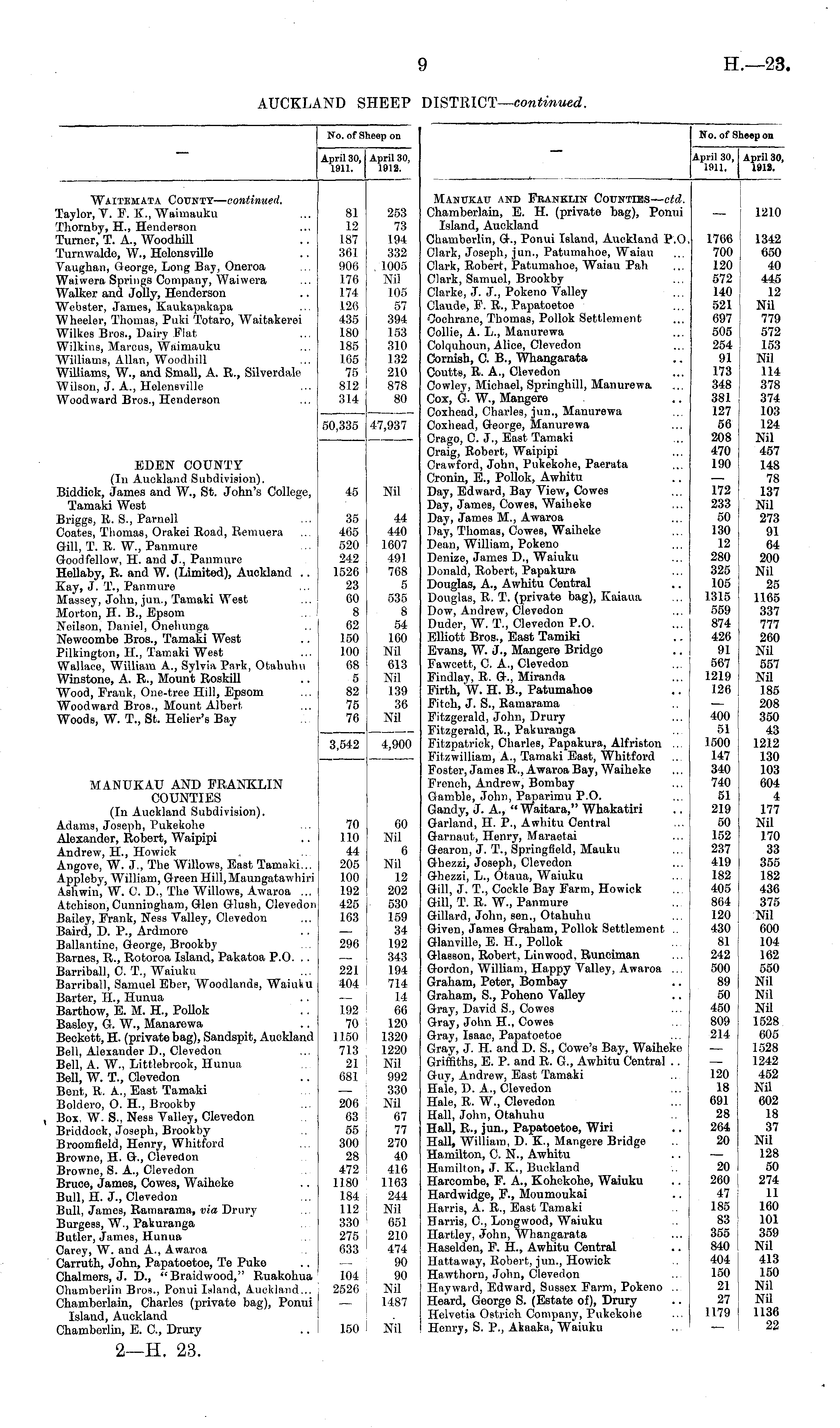 No. of Sheep on No. of Sheep on April 30, 1911. April 30, 1912. April 30, 1911. April 30, 1912. Waitemata County— continued. Taylor, V. F. K., Waimauku Thornby, H., Henderson Turner, T. A., Woodhill Turnwalde, W., Helensville Vaughan, George, Long Bay, Oneroa Waiwera Springs Company, Waiwera Walker and Jolly, Henderson Webster, James, Kaukapakapa Wheeler, Thomas, Puki Totaro, Waitakerei Wilkes Bros., Dairy Flat Wilkins, Marcus, Waimauku Williams, Allan, Woodhill WiUiams, W., and SmaU, A. R., Silverdale Wilson, J. A., Helensville Woodward Bros., Henderson EDEN COUNTY (In Auckland Subdivision). Biddick, James and W., St. John's College, Tamaki West Briggs, R. S., Parnell Coates, Thomas, Orakei Road, Remuera Gill, T. R. W., Panmure Goodfellow, H. and J., Panmure HeUaby, R. and W. (Limited), Auckland .. Kay, J. T., Panmure Massey, John, jun., Tamaki West Morton, H. B., Epsom ... I Neilson, Daniel, Onehunga Newcombe Bros., Tamaki West Pilkington, H., Tamaki West Wallace, William A., Sylvia Park, Otahuhu Winstone, A. R., Mount RoskiU Wood, Frank, One-tree Hill, Epsom Woodward Bros., Mount Albert Woods, W. T., St. Helier's Bay MANUKAU AND FRANKLIN COUNTIES (In Auckland Subdivision). Adams, Joseph, Pukekohe Alexander, Robert, Waipipi Andrew, H., Howick Angove, W. J., The WUIowb, East Tamaki... Appleby, William, Green Hill,Maungatawhiri Ash win, W. C. D., The Willows, Awaroa ... Atchison, Cunningham, Glen Glush, Clevedon Bailey, Frank, Ness Valley, Clevedon Baird, D. P., Ardmore Ballantine, George, Brookby Barnes, R., Rotoroa Island, Pakatoa P.O. . . Barriball, C. T., Waiuku Barriball, Samuel Eber, Woodlands, Waiuku Barter, H., Hunua Barthow, E. M. H., PoUok Basley, G. W., Manarewa Beckett, H. (private bag), Sandspit, Auckland Bell, Alexander D., Clevedon Bell, A. W., Littlebrook, Hunua Bell, W. T., Clevedon Bent, R. A., East Tamaki Boldero, O. H., Brookby Box, W. S., Ness Valley, Clevedon Briddock, Joseph, Brookby Broomfield, Henry, Whitford Browne, H. &., Clevedon Browne, S. A., Clevedon Bruce, James, Cowes, Waiheke Bull, H. J., Clevedon Bull, James, Ramarama, via Drury Burgess, W., Pakuranga Butler, James, Hunua Carey, W. and A., Awaroa Carruth, John, Papatoetoe, Te Puke Chalmers, J. D., "Braidwood," Ruakohua Chamberlin Bros., Ponui Island, Auckland... Chamberlain, Charles (private bag), Ponui Island, Auckland Chamberlin, E. G, Drury 81 12 187 361 906 176 174 126 435 180 185 165 75 812 314 50,335 45 35 465 520 242 1526 23 60 8 62 150 100 68 5 82 75 76 3,542 253 73 194 332 1005 Nil 105 57 394 153 31.0 132 210 878 80 47,937 Nil 44 440 1607 491 768 5 535 8 54 160 NU 613 Nil 139 36 Nil 4,900 Manukau and Franklin Counties— ctd. Chamberlain, E. H. (private bag), Ponui Island, Auckland Chamberlin, G., Ponui Island, Auckland P.O. Clark, Joseph, jun., Patumahoe, Waiau Clark, Robert, Patumahoe, Waiau Pah Clark, Samuel, Brookby Clarke, J. J., Pokeno Valley Claude, F. R., Papatoetoe Cochrane, Thomas, PoUok Settlement Collie, A. L., Manurewa Colquhoun, Alice, Clevedon Cornish, C. B., Whangarata Coutts, R. A., Clevedon Cowley, Michael, Springhill, Manurewa Cox, G. W., Mangere Coxhead, Charles, jun., Manurewa Coxhead, George, Manurewa Crago, C. J., East Tamaki Craig, Robert, Waipipi Crawford, John, Pukekohe, Paerata Cronin, E., Pollok, Awhitu Day, Edward, Bay View, Cowes Day, James, Cowes, Waiheke Day, James M., Awaroa Day, Thomas, Cowes, Waiheke Dean, William, Pokeno Denize, James D., Waiuku Donald, Robert, Papakura Douglas, A., Awhitu Central Douglas, R. T. (private bag), Kaiaua Dow, Andrew, Clevedon Duder, W. T., Clevedon P.O. Elliott Bros., East Tamiki Evans, W. J., Mangere Bridge Fawcett, C. A., Clevedon Findlay, R. G., Miranda Firth, W. H. B., Patumahoe Fitch, J. S., Ramarama Fitzgerald, John, Drury Fitzgerald, R., Pakuranga Fitzpatrick, Charles, Papakura, Alfriston ... Fitzwilliam, A., Tamaki East, Whitford Foster, James R., Awaroa Bay, Waiheke French, Andrew, Bombay Gamble, John, Paparimu P.O. Gandy, J. A., " Waitara," Whakatiri Garland, H. P., Awhitu Central Garnaut, Henry, Maraetai Gearon, J. T., Springfield, Mauku Ghezzi, Joseph, Clevedon Ghezzi, L., Otaua, Waiuku Gill, J. T., Cockle Bay Farm, Howick Gill, T. R. W., Panmure Gillard, John, sen., Otahuhu Given, James Graham, Pollok Settlement .. Glanville, E. H., Pollok Glasson, Robert, Linwood, Runciman Gordon, William, Happy Valley, Awaroa .., Graham, Peter, Bombay Graham, S., Poheno VaUey Gray, David S., Cowes Gray, John H., Cowes Gray, Isaac, Papatoetoe Gray, J. H. and D. S., Cowe's Bay, Waiheke Griffiths, E. P. and R. G„ Awhitu Central .. Guy, Andrew, East Tamaki Hale, D. A., Clevedon Hale, R. W., Clevedon Hall, John, Otahuhu Hall, R., jun., Papatoetoe, Wiri Hall, William, D. K., Mangere Bridge Hamilton, C. N., Awhitu Hamilton, J. K., Buckland Harcombe, F. A., Kohekohe, Waiuku Hardwidge, F-, Moumoukai Harris, A. R., East Tamaki Harris, G, Longwood, Waiuku Hartley, John, Whangarata Haselden, F. H., Awhitu Central Hattaway, Robert, jun., Howick Hawthorn, John, Clevedon Hayward, Edward, Sussex Farm, Pokeno .. Heard, George S. (Estate of), Drury Helvetia Ostrich Company, Pukekohe Henry, S. P., Akaaka, Waiuku 1766 700 120 572 140 521 697 505 254 91 173 348 381 127 56 208 470 190 172 233 50 130 12 280 325 105 1315 559 874 426 91 567 1219 126 400 51 1500 147 340 740 51 219 50 152 237 419 182 405 864 120 430 81 242 500 89 50 450 809 214 1210 1342 650 40 445 12 NU 779 572 153 Nil 114 378 374 103 124 Nil 457 148 78 137 Nil 273 91 64 200 Nil 25 1165 337 777 260 Nil 557 NU 185 208 350 43 1212 130 103 604 4 177 Nil 170 33 355 182 436 375 Nil 600 104 162 550 Nil Nil Nil 1528 605 1528 1242 452 Nil 602 18 37 Nil 128 50 274 11 160 101 359 NU 413 150 Nil Nil 1136 22 70 110 44 205 100 192 425 163 60 Nil 6 Nil 12 202 530 159 34 192 343 194 714 14 66 120 1320 1220 Nil 992 330 Nil 67 77 270 40 416 1163 244 Nil 651 210 474 90 90 Nil 1487 296 221 404 192 70 1150 713 21 681 206 63 55 300 28 472 1180 184 112 330 275 633 120 18 691 28 264 20 20 260 47 185 83 355 84