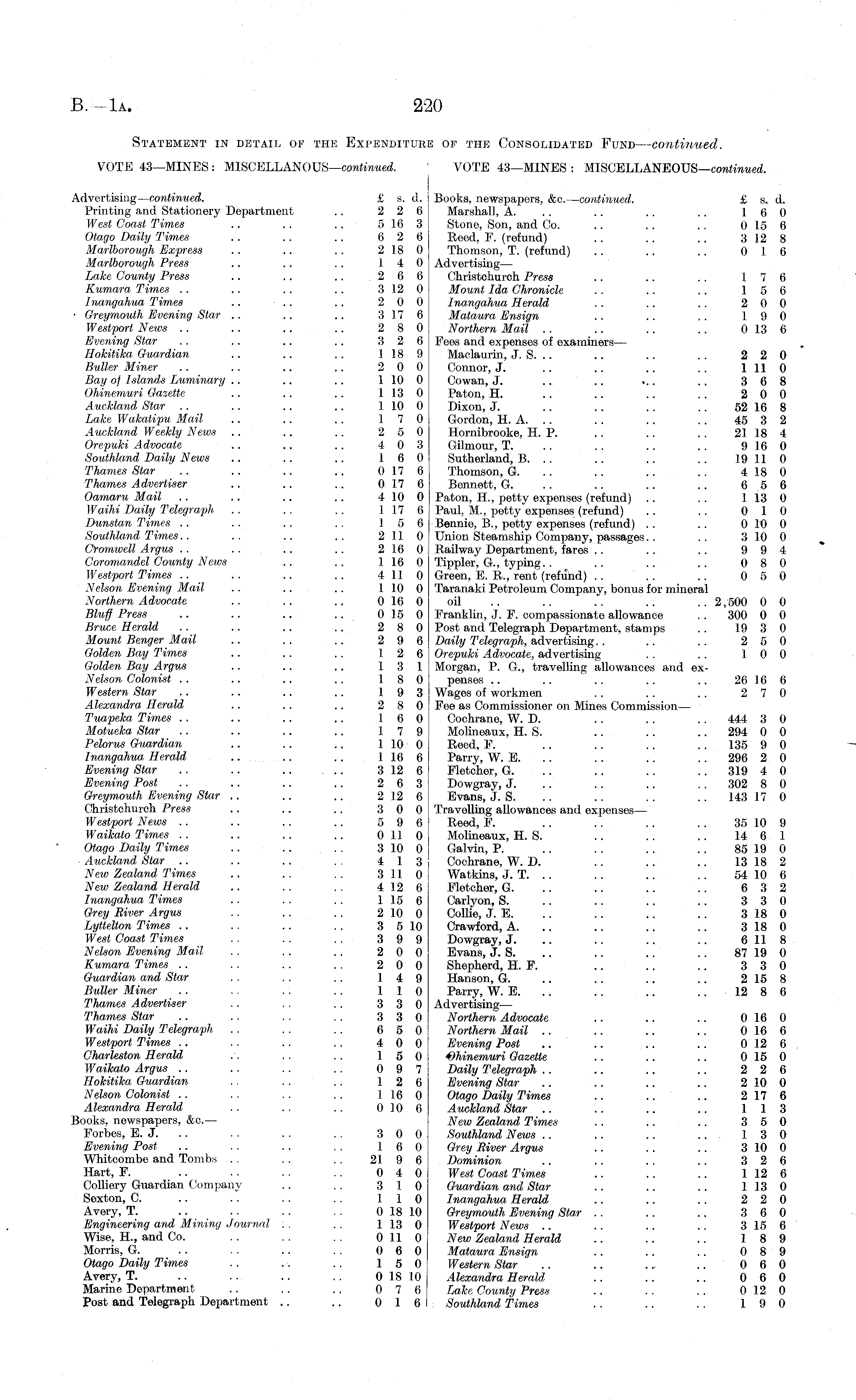Statement in detail of the Expenditure of the Consolidated Fund— continued. VOTE 43—MINES : MISCELLANOUS— continued. ' VOTE 43—MINES : MISCELLANEOUS— continued, Advertising— continued. £ a. d. Books, newspapers, &c.— continued. £ s. d. Printing and Stationery Department .. 2 2 6 Marshall, A. . . .. .. .. 16 0 West Coast Times .. . , .. 516 3 Stone, Son, and Co. .. . . .. 015 6 Otago Daily Times .. .. .. 6 2 6 Reed, F. (refund) .. .. .. 3 12 8 Marlborough Express .. .. .. 218 0 Thomson, T. (refund) .. .. 0 16 Marlborough Press .. .. .. 14 0 Advertising— Lake County Press .. .. .. 2 6 6 Christchuroh Press .. .. .. 17 6 Kumar a Times .. .. .. .. 3120 Mount Ida Chronicle . . .. 15 6 Inangahua Times .. .. .. 2 0 0 Inangahua Herald .. .. .. 2 0 0 • Greymouth Evening Star . ... .. 317 6 Mataura Ensign .. .. . . 19 0 Westport News .. .. .. .. 2 8 0 Northern Mail . . .. .. .. 013 6 Evening Star . . .. .. .. 3 2 6 Fees and expenses of examiners— Hokitika Guardian .. .. .. 118 9 Maclaurin, J. S. .. .. .. . . 2 2 0 Butter Miner .. .. .. .. 2 0 0 Connor, J. .. 1110 Bay of Islands Luminary .. .. .. 110 0 Cowan, J. .. .. ... 3 6 8 Oh'inemuri Gazette ' .. .. .. 113 0 Paton, H. .. .. 2 0 0 Auckland Star .. . . .. .. 1 10 0 Dixon, J. .. .. 52 16 8 Lake Wakatipu Mail .. .. .. 17 0 Gordon, H. A. .. . . .. . . 45 3 2 Auckland Weekly News .. .. .. 2 5 0 Hornibrooke, H. P. .. . . 21 18 4 Ore/puki Advocate .. .. .. 4 0 3 Gilmour, T. .. . . .. . . 916 0 Southland Daily News .. .. .. 16 0 Sutherland, B. .. .. .. .. 19 11 0 Thames Star . . .. .. .. 017 6 Thomson, G. .. .. .. 418 0 Thames Advertiser .. .. ... 0 17 6 Bennett, G. .. .. .. .. 6 5 6 Oamaru Mail .. .. .. .. 410 0 Paton, H., petty expenses (refund) . . . . 113 0 Waihi Daily Telegraph, .. .. .. 117 6 Paul, M., petty expenses (refund) .. .. 0 10 Dunstan Times . . .. .. .. 15 6 Bennie, 8., petty expenses (refund) . . .. 0 10 0 Southland Times.. .. .. .. 2 11 0 Union Steamship Company, passages. . .. 310 0 Cromwell Argus . . .. .. .. 216 0 Railway Department, fares .. .. .. 9 9 4 Coromandel County News .. .. 116 0 Tippler, G., typing. . .. .. .. 0 8 0 Westport Times .. . . .. .. 4 110 Green, E. R., rent (refund) .. . . .. 0 5 0 Nelson Evening Mail .. .. .. 110 0 Taranaki Petroleum Company, bonus for mineral Northern Advocate .. .. .. 016 0 oil .. .. .. .. .. 2,500 0 0 Bluff Press .. .. .. .. 015 0 Franklin, J. F. compassionate allowance . . 300 0 0 Bruce Herald .. . . .. .. 2 8 0 Post and Telegraph Department, stamps .. 19 3 0 Mount Benger Mail .. .. .. 2 9 6 Daily Telegraph, advertising.. .. .. 2 5 0 Golden Bay Times .. . . .. 12 6 Orepuki Advocate, advertising . . 10 0 Golden Bay Argus .. .. .. 13 1 Morgan, P. G., travelling allowances and exNelson Colonist . . .. .. .. 18 0 penses .. .. .. .. .. 26 16 6 Western Star .. .. .. . . 19 3 Wages of workmen .. . . . . 2 7 0 Alexandra Herald .. .. .. 2 8 0 Fee as Commissioner on Mines Commission— Tuapeka Times . . .. .. .. 16 0 Cochrane, W. D. .. . . .. 444 3 0 Motueka Star .. .. .. .. 17 9 Molineaux, H. S. .. .. .. 294 0 0 Pelorus Guardian .. .. .. 1 10 0 Reed, F. .. .. .. 135 9 0 Inangahua Herald .. .. .. 116 6 Parry, W. E. .. . . .. .. 296 2 0 Evening Star .. .. .. . .. 312 6 Fletcher, G. .. . . .. 319 4 0 Evening Post .. .. .. .. 2 6 3 Dowgray, J. .. .. .. 302 8 0 Greymouth Evening Star .. .. .. 212 6 Evans, J. S. .. .. . . 143 17 0 Christchuroh Press .. .. .. 3 0 0 Travelling allowances and expenses— Westport News .. .. .. .. 5 9 6 Reed, F. .. . . .. .. 35 10 9 Waikato Times . . .. .. .. 0110 Molineaux, H. S. .. . . .. 14 6 1 Otago Daily Times .. .. .. 310 0 Galvin, P. .. .. .. . . 85 19 0 Auckland Star .. .. .. .. 4 13 Cochrane, W. D. .. . . .. 13 18 2 New Zealand Times .. .. .. 3 11 0 Watkins, J. T. .. .. .. .. 54 10 6 New Zealand Herald .. . . . . 412 6 Fletcher, G. .. .. .. .. 6 3 2 Inangahua Times .. . . .. 1 15 6 Carlyon, S. .. .. .. . . 3 3 0 Grey River Argus .. .. .. 210 0 Collie, J. E. .. .. .. . . 318 0 Lyttelion Times .. .. .. .. 3 510 Crawford, A. .. .. .. 318 0 West Coast Times .. .. .. 3 9 9 Dowgray, J. .. .. .. .. 6 11 8 Nelson Evening Mail .. . . .. 2 0 0 Evans, J. S. .. .. . . .. 87 19 0 Kumara Times .. . . . . .. 2 0 0 Shepherd, H. F. .. .. .. 3 3 0 Guardian and Star .. . . .. 14 9 Hanson, G. .. .. .. 215 8 Buller Miner . . .. . . .. 110 Parry, W. E. .. .. 12 8 6 Thames Advertiser .. . . .. 3 3 0 Advertising— Thames Star .. .. . . .. 3 3 0 Northern Advocate .. .. .. 016 0 Waihi Daily Telegraph .. . . .. 6 5 0 Northern Mail .. .. .. .. 0166 Westport Times .. . . . . . . 4 0 0 Evening Post .. .. .. .. 012 6 Charleston Herald :. . . .. 15 0 Ohinemuri Gazette .. .. .. 015 0 Waikato Argus .. .. . . . . 0 9 7 Daily Telegraph .. .. .. .. 2 2 6 Hokitika Guardian . . . . .. 12 6 Evening Star .. . . .. .. 210 0 Nelson Colonist .. .. .. . . 116 0 Otago Daily Times .. .. .. 217 6 Alexandra Herald .. .. .. 0 10 6 Auckland Star .. .. .. .. 113 Books, newspapers, &c.— New Zealand Times . . .. .. 3 5 0 Forbes, E. J. .. . . .. .. 3 0 0 Southland News .. .. .. ...130 Evening Post .. . . .. . . 16 0 Grey River Argus .. .. .. 310 0 Whitcombe and Tombs . . .. . . 21 9 6 Dominion .. .. . . . . 3 2 6 Hart, F. .. . . .. .. 0 4 0 West Coast Times .. .. . . 112 6 Colliery Guardian Company .. . . 3 10 Guardian and Star .. .. . . 113 0 Sexton, C. .. . . . . . . 110 Inangahua Herald .. .. . . 2 2 0 Avery, T. .. .. . . . . 018 10 Greymouth Evening Star .. .. .. 3 6 0 Engineering and Mining Journal . . .. 1 13 0 Westport News .. .. 3 15 6 Wise, H., and Co. .. . . . . 0 11 0 New Zealand Herald .. .. .. 18 9 Morris, G. .. .. .. . . 0 6 0 Mataura Ensign .. .. .. 0 8 9 Otago Daily Times .. .. .. 15 0 Western Star .. .. ... .. 0 6 0 Avery, T. .. .. .. .. 0 18 10 Alexandra Herald .. .. .. 0 6 0 Marine Department . . . . .. 0 7 6 Lake County Press .. .. . . 012 0 Post and Telegraph Department .. .. 0 16 Southland Times . . .. . . 19 0