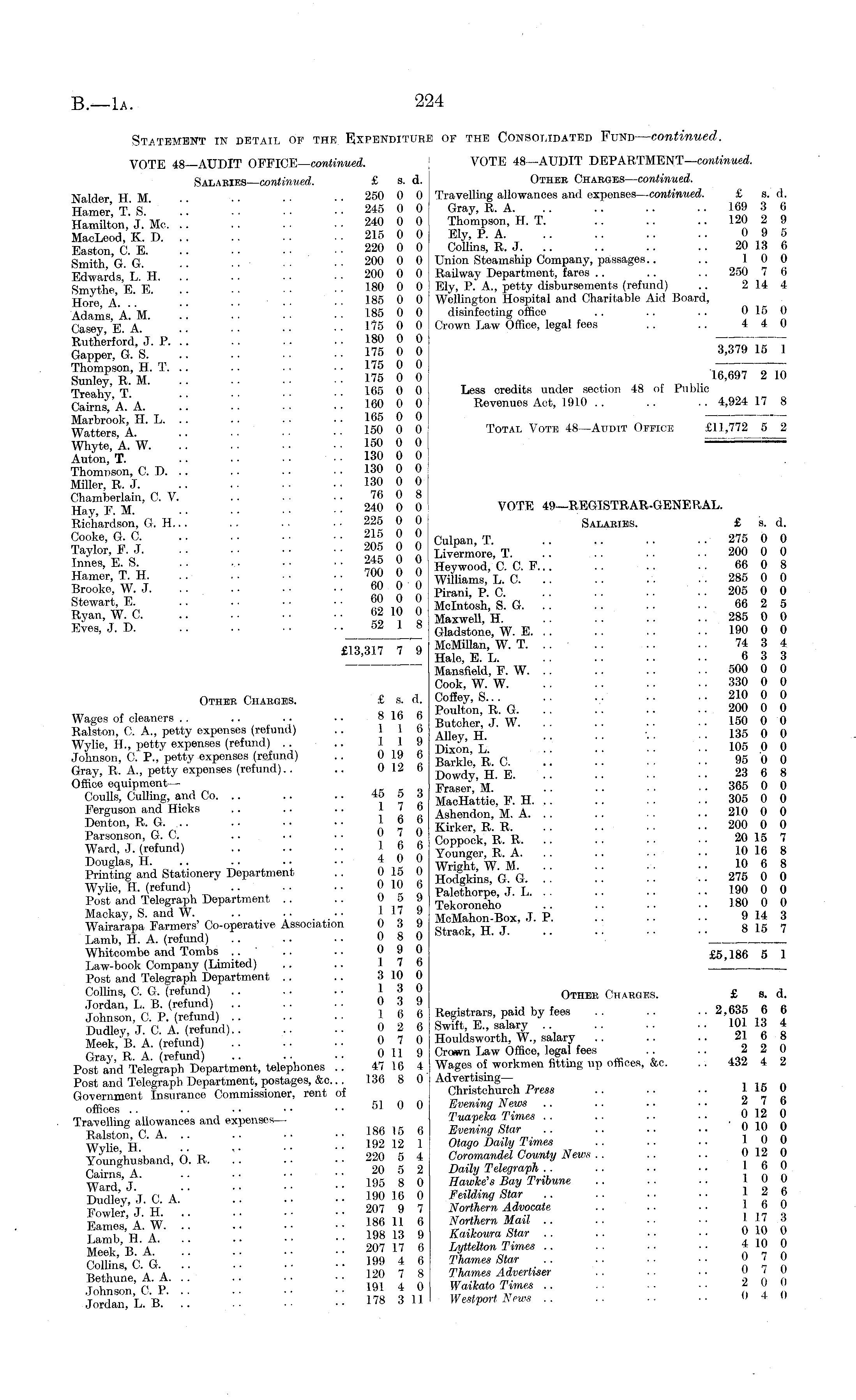 Statement tn detail of the Expenditure of the Consolidated Fund— continued. VOTE 48—AUDIT OFFlCE— continued. VOTE 48—AUDIT DEPARTMENT— continued. Salaries— continued. £ s. d. Other Charges— continued. Nalder H M 250 0 0 Travelling allowances and expenses— continued. £ s. d. Hamer T." S. .. 245 0 0 Gray, R. A. .. .. .. 169 3 6 Hamilton,' J-' Me 240 0 0 Thompson, H. T 120 2 9 ManTeod KT> 215 0 0 Ely, P. A. .. .. .. .. 0 9 5 EastonCE. " " " ..22000 CoLs, R. J 20 13 6 Smith 6 G ■ •■ ■• 200 0 0 Union Steamship Company, passages.. .. 10 0 Edwards LH. .. '.'■ ■■ 200 0 0 Railway Department, fares .. .. .. 250 7 6 Smythe E E ■ ■ . . 180 0 0 Ely, P. A., petty disbursements (refund) .. 214 4 Hor e A . . • . .. ]85 0 0 Wellington Hospital and Charitable Aid Board, Adams AM .. • ■ 185 0 0 disinfecting office .. .. .. 015 0 Casey E A '.'. ■■ ■■ . . 175 0 0 Crown Law Office, legal fees .. .. 4 4 0 Rutherford,' J. P. '.'. 180 0 0 T^TT^T Gapper, G. S 175 0 0 3,379 15 1 Thompson, H. T. .. .. . . .. 175 0 0 ■■,„„„"„ „ ,„ Sunley,R.M 175 0 0 ...>»' 2 10 Treahv T 165 0 0 Less credits under section 48 ot Public Cairns, A.'a. '.'. 1. 160 0 0 Revenues Act, 1910 .. .. .. 4,924 17 8 Marbrook' H L .. . . .. 165 0 0 Watters A. •• 150 0 0 Total Vote 48—Audit Office £11,772 5 2 Whyte, A. W. .. • • ■ ■ . . 150 0 0 _ Auton, T. 130 0 0 Thompson, CD... .. .. . . 130 0 0 Miller, R. J 130 0 0 H h ay m F er M! n ' G V, . . '.'. '.'. '■'■ ™0 0 VOTE 49-REGISTRAR-GENERAL. Richardson, G. H... . . .. . . 225 0 0 Salaries. £ s. d. Cooke, G. C. 215 0 0 275 „ „ Taylor F J 205 0 0 Liv £ rm 'ore, T 200 0 0 Innes, E. S 245 0 0 Hood c . C . F 66 0 8 Hamer, TH. 700 0 0 wi f u ' L . c 285 0 0 Brooke, W.J. .. 60 0 0 pirani p c 205 0 0 Stewart E ™ Mclntosh, S. G 66 2 5 %an, W. C f 10 0 Maxwell H 285 0 0 Eves, J. D Gladstone, W. E 190 0 0 »,„,, , a McMillan, W. T. .. .. .. .. 74 3 4 £18 ' 31^_ 7 9 Hale, E. L 6 3 3 Mansfield, F. W. . . .. .. .. 500 0 0 Cook, W. W. .. .. • • . . 330 0 0 Other Charges. £ s. d. Ooffley, S .. 210 0 0 , , a 1 a a Poulton, R. G. . . .. .. • • 0 0 Wages of cleaners .. .. 8 16 6 Butohe j w 150 0 0 Ralston, C. A., petty expenses (refund) .. 6 „ . 135 0 0 Wylie, H., petty expenses (refund) .. 11 9 M £ " \\ \\ . . 105 .0 0 .Tohnson, C. P., petty expenses (retimd) .. 0 L» t> ' _ „ 95 0 0 Gray, R. A., petty expenses (refund).. .. 012 6 " '' ;; ;; 23 6 8 Office equipment- Fraser,'M 365 0 0 Coulls, CuUing, and Co 45 o 3 Macllatti F . H 305 0 0 Ferguson and Hicks 6 Aghendon M A 210 0 0 Denton, R.G 16 6 Kirk RR 200 0 0 Parsonson G. C 0 7 0 kRR 20 15 7 Ward J. Refund) 16 6 RA 10 16 8 Douglas, H. .. .. •• •• 4 0 0 M . . 10 6 8 Printing and Stationery Department .. 0 lo 0 Hoc f ki ' g. q. " 275 0 0 Wyhe, H. refund .. .. .. 0 10 b p , ? h T T 190 0 0 Poland Telegraph Department .. 05 9 %£££& J - L;; [[ " .. m 0 0 Mackav, S. and W. .. • • • • 111 » MM h T> nx t p 914 3 Wairarapa Farmers' Co-operative Association 03 9 j^T^'T* , " 815 7 Lamb, H. A. (refund) 0 8 0 btraok, 11. d •• ■• Whitcombe and Tombs .... ..090 £5,186 5 1 Law-book Company (Limited) .. .. 17 6 Post and Telegraph Department .. .. 3 10 0 Collins, C. G. (refund) ion Other Charges. £ s. d. Sn L c B P. ( (X d d) :: :: :: ?' 9 6 .. ■■ a -Sf xf 2 Dudley, J. C. A. (refund) 0 2 6 Swift E., salary . 10113 4 Meek, 7 8. A. (refund) 0 7 0 Houldsworth W., salary 21 6 8 P ' B * s_,f lln( . 0 11 9 Crown Law Office, legal fees .. .. 2 2 0 Post and Telegraph Department, telephones .. 47 16 4 Wages of workmen fitting up offices, &c. .. 432 4 2 Post and Telegraph Department, postages, &c... 136 8 0 Advertising— Government Insurance Commissioner, rent of Chnstchurch Press 1 15 0 offices 51 0 0 Evening News 2 7 6 Travelling allowances and expenses- Tuapeka Times ■ n 10 0 Ralston C A .. 186 15 6 Evening Star .. .. .. •• 010 0 Wrhe H •• ..192 12 1 Otago Daily Times .. .. 10 0 Younghusband, O. R. ! 220 5 4 Goromandel County New* 012 0 Oaima a 20 5 2 Daily Telegraph .. .. . • ■ • 6 0 Ward J " •• .. 195 8 0 Hawke's Bay Tribune 0 0 Dudfevrj-cA.-- :: .. :: i«ne o ™^ to; .. .. 2 6 Fowler J H .. 207 9 7 Northern Advocate .. .. ■■ 1 6 0 t-ZosAW " . 186 11 6 Northern Mail 117.3 ftimb-i'l .. 198 13 9 kaikouraStar 010 0 ..207 17 6 Lyttelton Times 410 0 Collins 6 G " • .. 199 4 6 Thames Star 0 7 0 bSaa. :: :: .: ..12078 :■: 070 Johnson G.P 191 4 0 Waikato Times .. ..20 0 Jordan, L. B 178 311 Westport News 0 4 0