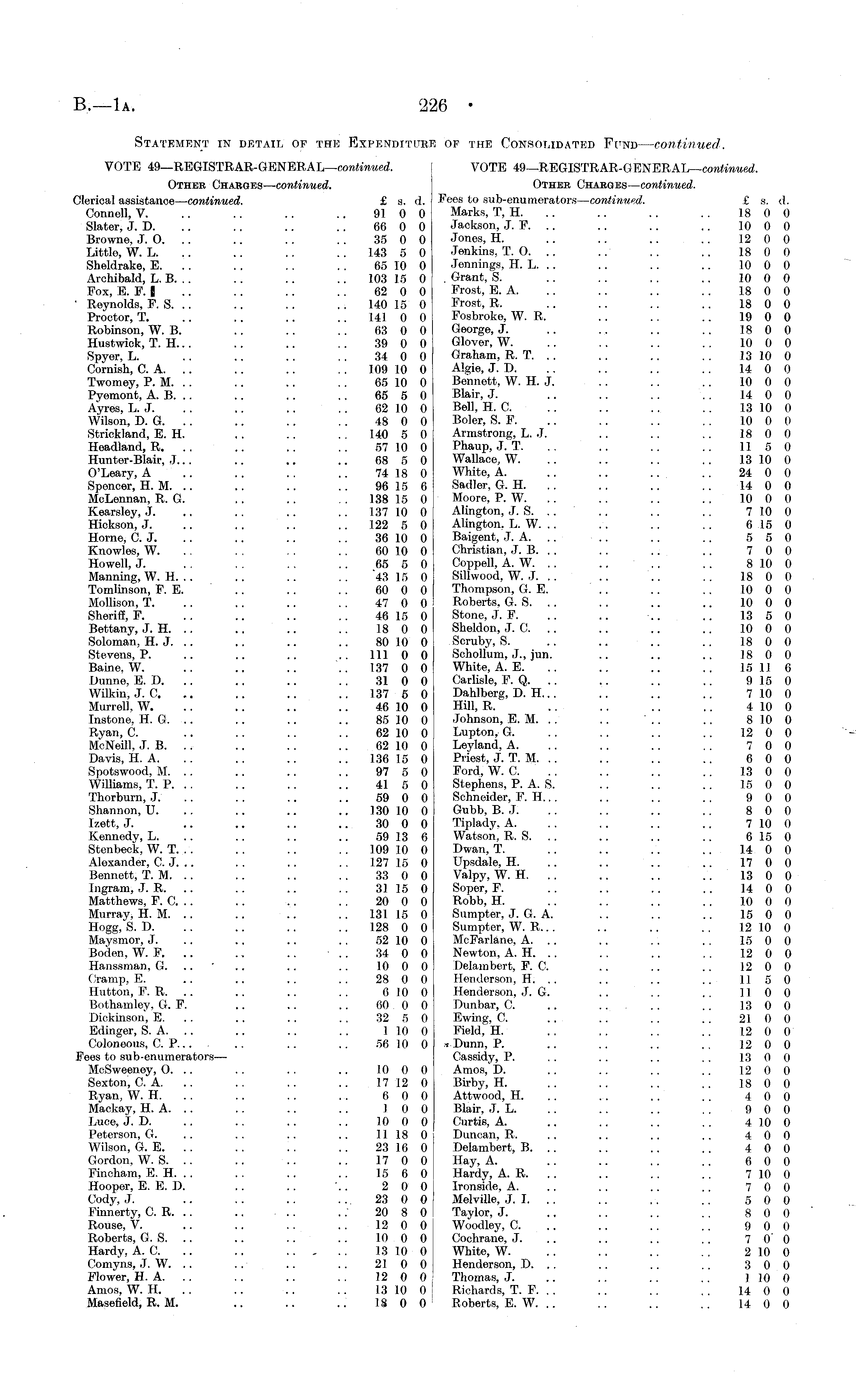 Statement in detail op the Expenditure of the Consolidated Ftnd — continued. VOTE 49—REGISTRAR-GENERAL— continued. VOTE 49—REGISTRAR-GENERAL— continued. Othek Charges— continued. Other Charges— continued. Clerical assistance— continued. £ s. d. F ees to sub-enumerators— continued. £ s. d. Connell, V. .. .. .. .. 91 0 0 Marks, T, H. .. .. .. .. 18 0 0 Slater, J. D. .. .. .. .. 66 0 0 Jackson, J. P. .. .. .. .. 10 0 0 Browne, J. 0. .. .. .. . . 35 0 0 Jones, H. .. .. .. .. 12 0 0 Little, W. L. .. .. .. .. 143 5 0 Jenkins, T. 0. .. .. .. .. 18 0 0 Sheldrake, E. .. .. . . .. 65 10 0 Jennings, H. L. .. .. .. .. 10 0 0 Archibald, L. B. . . .. .. .. 103 ] 5 0 . Grant, S. .. .. .. .. 10 0 0 Pox, E. F. 8 ■ • .. • • • • 62 0 0 Frost, E. A. .. .. .. .. 18 0 0 ■ Reynolds, F. S. .. .. .. 140 15 0 Frost, R. . . .. .. .. 18 0 0 Proctor, T. .. .. .. .. 141 0 0 Fosbroke, W. R. .. .. .. 19 0 0 Robinson, W. B. .. . . .. 63 0 0 George, J. .. .. .. .. 18 0 0 Hustwick, T. H... .. .. .. 39 0 0 Glover, W. .. .. .. .. 10 0 0 Spyer. L. .. .. .. .. 34 0 0 Graham, R. T. .. .. .. .. 13 10 0 Cornish, C. A. .. .. .. .. 109 10 0 Algie, J. D. .. .. .. .. 14 0 0 Twomey, P. M. . . .. .. . . 65 10 0 Bennett, W. H. J. . . .. .. 10 0 0 Pyemont, A. B. .. .. .. .. 65 5 0 Blair, J. .. .. . . . . 14 0 0 Ayres, L. J. . . .. .. . . 62 10 0 Bell, H. C. .. .. .. .. 13 10 0 Wilson, D. G. . . .. .. .. 48 0 0 Boler, S. F. .. .. .. . . 10 0 0 Strickland, E. H. .. .. 140 5 0 Armstrong, L. J. .. .. .. 18 0 0 Headland, R. .. .. .. .. 57 10 0 Phaup, J. T. .. .. .. .. 11 5 0 Hunter-Blair, J. .. .. .. .. 68 5 0 Wallace, W. .. .. .. .. 13 10 0 O'Leary, A .. . . . . .. 74 18 0 White, A. .. .. .. . . 24 0 0 Spencer, H. M. .. .. .. .. 96 15 6 Sadler, G. H. .. .. .. . . 14 0 0 McLennan, R. G. .. .. .. 138 15 0 Moore, P. W. .. .. .. .. 10 0 0 Kearsley, J. .. . . .. 137 10 0 Alington, J. S. .. .. .. . . 710 0 Hickson, J. .. .. .. .. 122 5 0 Alington. L. W. .. .. .. .. 615 0 Home, C. J. .. .. .. .. 36 10 0 Baigent, J. A. .. .. .. .. 5 5 0 Knowles, W. . . . . . . 60 10 0 Christian, J. B. . . .. .. .. 7 0 0 Howell, J. . . . . .. . . 65 5 0 Coppell, A. W. . . .. . . . . 8 10 0 Manning, W. H. .. .. .. .. '43 15 0 Sillwood, W. J. .. .. .. .. 18 0 0 Tomlinson, F. E. .. .. .. 60 0 0 Thompson, G. E. . . .. .. 10 0 0 Mollison, T. .. .. .. . . 47 0 0 Roberts. G. S. . . .. .. .. 10 0 0 Sheriff, F. .. .. .. .. 46 15 0 Stone, J. F. .. .. -.. .. 13 5 0 Bettany, J. H. .. .. .. .. 18 0 0 Sheldon, J. C. .. .. .. .. 10 0 0 Soloman, H. J. .. .. .. .. 80 10 0 Scruby, S. .. .. .. .. 18 0 0 Stevens, P. .. .. .. 11l 0 0 Scholium, J., jun. .. .. .. 18 0 0 Baine. W. .. .. .. 137 0 0 White, A. E. .. .. .. .. 15 11 6 Dunne, E. D. .. .. .. .. 31 0 0 Carlisle, F. Q. .. .. .. .. 915 0 Wilkin, J. C. .. .. .. 137 5 0 Dahlberg, D. H... .. .. .. 710 0 Murrell, W. .. .. .. .. 46 10 0 Hill, R. .. .. .. .. 410 0 Instone, H. G. .. .. .. .. 85 10 0 Johnson, E. M. .. .. ' .. .. 8 10 0 Ryan, C. .. .. .. . . 62 10 0 Lupton, G. .. .. .. .. 12 0 0 McNeil], J. B. .. .. .. .. 62 10 0 Leyland, A. .. .. . . .. 7 0 0 Davis, H. A. .. .. .. 136 16 0 Priest, J. T. M. . . .. .. .. 6 0 0 Spotswood, M. .. .. .. . . 97 5 0 Ford, W. C. . . .. .. .. 13 0 0 Williams, T. P. .. .. .. .. 41 5 0 Stephens, P. A. S. .. .. .. 15 0 0 Thorburn, J. . . .. .. 59 0 0 Schneider, F. H.. . . . .. .. 9 0 0 Shannon, U. .. .. .. .. 130 10 0 Gubb, B. J. .. .. .. 8 0 0 Izett, J. .. .. .. .. 30 0 0 Tiplady. A. .. .. .. .. 710 0 Kennedy, L. . . .. .. .. 59 13 6 Watson, R. S. . . .. .. .. 6 15 0 Stenbeek, W. T. . . . . .. . . 109 10 0 Dwan, T. .. .. .. .. 14 0 0 Alexander, C. J. .. .. .. .. 127 15 0 Upsdale, H. .. .. .. .. 17 0 0 Bennett, T. M. .. .. .. . . 33 0 0 Valpy, W. H. .. .. .. .. 13 0 0 Ingram, J. R. .. .. .. .. 31 15 0 Soper, F. .. .. .. .. 14 0 0 Matthews, F. C. .. .. .. . . 20 0 0 Robb, H. .. .. .. . . 10 0 0 Murray, H. M. .. .. .. 131 15 0 Sumpter, J. G. A. .. .. .. 15 0 0 Hogg, S. D. . . .. .. .. 128 0 0 Sumpter, W. R... .. .. . . 12 10 0 Maysmor, J. .. .. .. . . 52 10 0 McFarlane, A. . . .. . . . . 15 0 0 Boden, W. F. .. .. .. .. 34 0 0 Newton, A. H. .. .. .. . . 12 0 0 Hanssman, G. .. .. 10 0 0 Delambert, F. C. .. .. .. 12 0 0 Cramp, E. .. .. .. .. 28 0 0 Henderson, H. .. .. .. .. 1150 Hutton, F. R. .. .. .. . . 610 0 Henderson, J. G. .. .. . . 110 0 Bothamley, G. F. .. .. .. 60 0 0 Dunbar, C. .. 13 0 0 Dickinson, E. . . .. . . . . 32 5 0 Ewing, C. .. .. .. . . 21 0 0 Edinger, S. A. .. .. .. .. 110 0 Field, H. .. . . .. 12 0 0 Coloneous, ('. P.. .. 56 10 0 -• Dunn, P. .. .. .. .. 12 0 0 Fees to sub-enumerators— Cassidy, P. .. .. .. .. 13 0 0 MeSweeney, O. .. .. .. .. 1000 Amos, D. .. .. .. .. 12 0 0 Sexton, C. A. .. .. .. .. 17120 Birby, H. .. .. .. .. 18 0 0 Ryan, W. H. .. .. .. .. 6 0 0 Attwood, H. .. .. . . . . 4 0 0 Mackay, H. A. .. .. .. . . 10 0 Blair, J. L. .. .. .. 9 0 0 Luce, J. D. .. .. .. .. 10 0 0 Curtis, A. .. .. .. .. 410 0 Peterson, G. .. .. .. .. .11 18 0 Duncan, R. .. .. .. .. 4 0 0 Wilson, G. E. .. . . . . .. 23 16 0 Delambert, B. .. .. .. .. 4 0 0 Gordon, W. S. .. .. .. .. 17 0 0 Hay, A. .. .. .. .. 6 0 0 Fincham, E. H. .. .. .. .. 15 6 0 Hardy, A. R. .. .. .. 710 0 Hooper, E. E. D. .. .. \. 2 0 0 Ironside, A. .. .. .. .. 7 0 0 Cody, J. .. .. .. ... 23 0 0 Melville, J. I. . . .. .. .. 500 Finnerty, C. R. .. .. .. .." 20 8 0 Taylor, J. .. .. .. . . 8 0 0 Rouse, V. .. .. .. . . 12 0 0 Woodley, C. .. .. .. .. 9 0 0 Roberts, G. S. .. .. .. .. 1000 Cochrane, J. .. .. .. .. 7 00 Hardy, A. C. .. .. 13 10 0 White, W. .. .. .. .. 210 0 Comyns, J. W. .. .. .. .. 21 0 0 Henderson, D. .. .. .. .. 3 0 0 Flower, H. A. .. .. .. .. 12 0 0 Thomas, J. .. .. .. .. 1 10 0 Amos, W. H. .. .. .. .. 13 10 0 Richards, T. F. .. .. .. .. 14 0 0 Masefield, R. M. .. .. .; 18 0 0 Roberts, E. W. .. .. .. .. 14 0 0