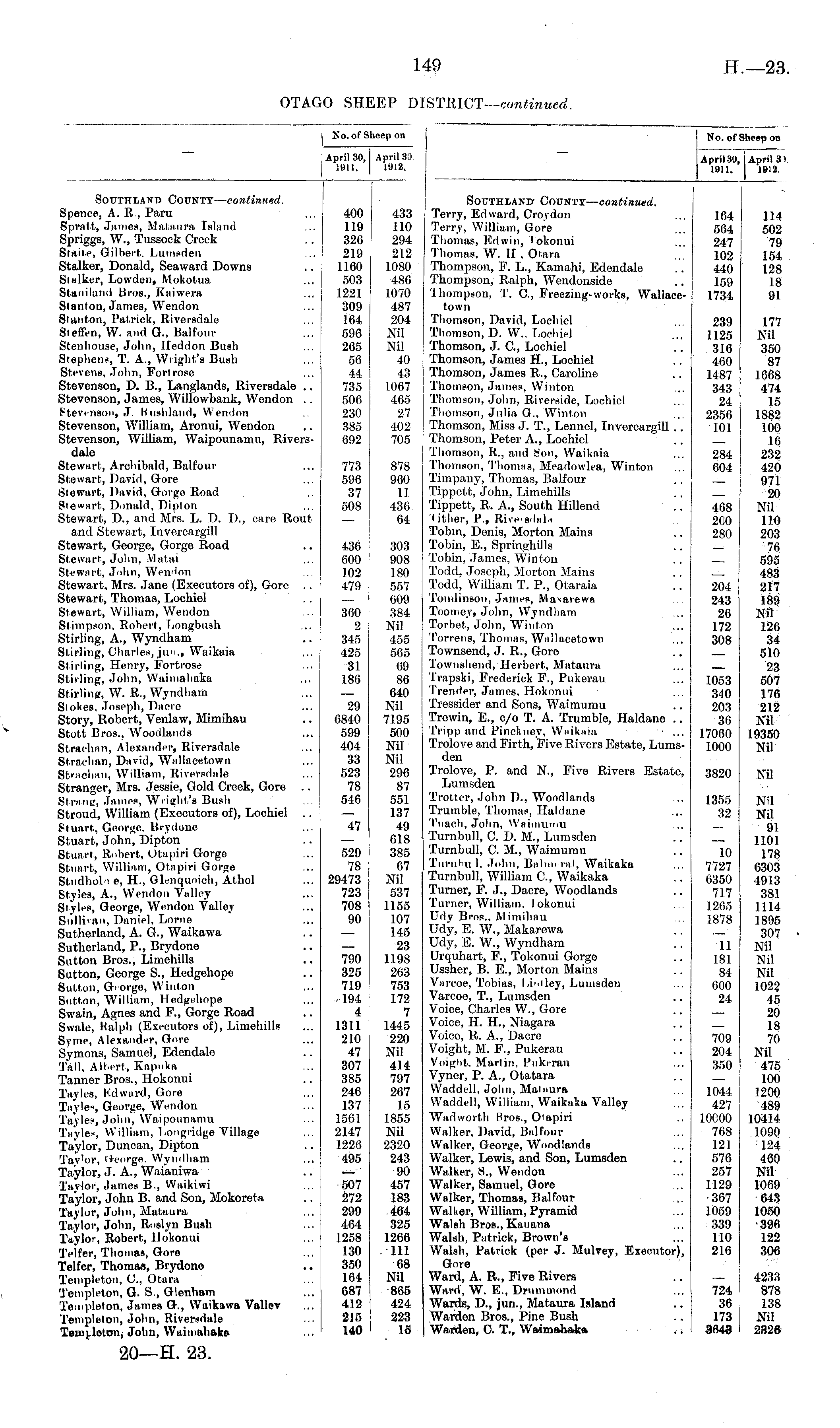 No. of Sheep on April 30, April 30 1911. 1912. No. of Sheep on April 30, i April 3D 1911. 1912. Southland County— continued. Spence, A. R , Paru Spraft, James, Mataura Island Spriggs, W., Tussock Creek Stail.e, Gilbert. Lumsden Stalker, Donald, Seaward Downs Stalker, Lowden, Mokotua Stuniland Bros., Kaiwera Slanton, James, Wendon Stanton, Patrick, Riversdale StefTen, W. and G., Balfour Stenhouse, John, Heddon Bush Stephens, T. A., Wright's Bush Stevens, John, Fortrose Stevenson, D. B., Langlands, Riversdale .. Stevenson, James, WUlowbank, Wendon .. Stevenson, J Hushland, Wendon Stevenson, WUliam, Aronui, Wendon Stevenson, William, Waipounamu, Riversdale Stewart, Archibald, Balfour Stewart, David, Gore Stewart, David, Gorge Road Ste»art, Donald, Dipton Stewart, D., and Mrs. L. D. D., care Rout and Stewart, Invercargill Stewart, George, Gorge Road Stewart, John, Matai Stewart, John, Wen'lon Stewart. Mrs. Jane (Executors of), Gore . . Stewart, Thomas, Loehiel Stewart, William, Wendon Stimpson, Robert, Longbush Stirling, A., Wyndham Stirling, Charles, jun., Waikaia Stirling, Henry, Fortrose Stirling, John, Waimahaka Stirling, W. R., Wyndham Stokes, Joseph, Dacre Story, Robert, Venlaw, Mimihau Stott Bros., Woodlands Strachan, Alexander, Riversdale Strachan, David, Wallacetown Strachan, William, Riversdale Stranger, Mrs. Jessie, Gold Creek, Gore .. Strang, James, Wright's Bush Stroud, William (Executors of), Loehiel .. Stuart, George. Brydone Stuart, John, Dipton Stuart, Robert, Otapiri Gorge Stuart, William, Otapiri Gorge Studholn e, H., Glemquoich, Athol Styles, A., Wendon Valley Styles, George, Wendon Valley Sullivan, Daniel. Lome Sutherland, A. G., Waikawa Sutherland, P., Brydone Sutton Bros., Limehills Sutton, George S., Hedgehope Sutton, George, Winton Sutton, William, Hedgehope Swain, Agnes and F., Gorge Road Swale, Kalph (Executors of), Limehills Syme, Alexander, Gore Symons, Samuel, Edendale Tall, Albert, Kapuka Tanner Bros., Hokonui Tayles, K.dward, Gore Tayle-, George, Wendon Tayles, John, Waipounamu Tayles, William, Longridge Village Taylor, Duncan, Dipton Tay'or, Henrge. Wyndham Taylor, J. A., Waianiwa Taylor, James B., Waikiwi Taylor, John B. and Son, Mokoreta Taylor, John, Mataura Taylor, John, Roslyn Bush Taylor, Robert, Hokonui Telfer, Thomas, Gore Telfer, Thomas, Brydone Templeton, C, Otara Templeton, G. S., Glenham Templeton, James G., Waikawa Vallev Templeton, John, Riversdale Tenn-leUnij John, Waimahaka 400 119 326 219 1160 503 1221 309 164 596 265 56 44 735 506 230 385 692 773 596 37 508 436 600 102 479 360 2 345 425 31 186 29 6840 599 404 33 523 78 546 433 110 294 212 1080 486 1070 487 204 Nil NU 40 43 1067 465 27 402 705 878 960 11 436 64 303 908 180 557 609 384 NU 455 565 69 86 640 Nil 7195 500 Nil Nil 296 87 551 137 49 618 385 67 Nil 537 1155 107 145 23 1198 263 753 172 7 1445 220 Nil 414 797 267 15 1855 Nil 2320 243 90 457 183 464 325 1266 111 68 Nil 865 424 223 IS Southland County— continued. Terry, Edward, Croydon Terry, William, Gore Thomas, Edwin, tokonui Thomas. W. II . Otara Thompson, F. L., Kamahi, Edendale Thompson, Ralph, Wendonside 'Ihompson, T. C, Freezing-works, Wallacetown Thomson, David, Loehiel Thomson, D. W., Loehiel Thomson, J. G, Loehiel Thomson, James H., Loehiel Thomson, James R., Caroline Thomson, James, Winton Thomson, John, Riverside, Loehiel Thomson, Julia G., Winton Thomson, Miss J. T., Lennel, Invercargill .. Thomson, Peter A., Loehiel Thomson, R., and Son, Waikaia Thomson, Thomas, Meadowlea, Winton Timpany, Thomas, Balfour Tippett, John, Limehills Tippett, R. A., South Hillend 'litlier, P.t Riveigilnlrt Tobm, Denis, Morton Mains Tobin, E., Springhills Tobin, James, Winton Todd. Joseph, Morton Mains Todd, WiUiam T. P., Otaraia Tomlinson, James, Maiarewa Toomey, John, Wyndham Torbet, John, Winton Tori-ens, Thomas, Wallacetown Townsend, J. R., Gore Townshend, Herbert, Mataura Trapski, Frederick F., Pukerau T render, James, Hokonui Tressider and Sons, Waimumu Trewin, E., c/o T. A. Trumble, Haldane .. Tripp and Pinchney, Waikaia ... Trolove and Firth, Five Rivers Estate, Lumsden Trolove, P. and N., Five Rivers Estate, Lumsden Trotter, John D., Woodlands Trumble, Thomas, Haldane Tuach, John, Waimumu Turnbull, C. D. M., Lumsden Turnbull, C. M., Waimumu Tiirahu 1. John, Balnu rai, Waikaka Turnbull, WiUiam C, Waikaka Turner, F. J., Dacre, Woodlands Turner, William, I okonui Udy Bros.. Mimihau Udy, E. W., Makarewa Udy, E. W., Wyndham Urquhart, F., Tokonui Gorge Ussher, B. E., Morton Mains Varcoe, Tobias, Liutley, Lumsden Varcoe, T., Lumsden Voice, Charles W., Gore Voice, H. H., Niagara Voice, R. A., Dacre Voight, M. F., Pukerau Voight, Marlin, Pukerau Vyner, P. A., Otatara Waddell, John, Malaura Waddell, William, Waikaka Valley Wad worth Bros., Otapiri Walker, David, Balfour Walker, George, Woodlands Walker, Lewis, and Son, Lumsden Walker, 8., Wendon Walker, Samuel, Gore Walker, Thomas, Balfour Walker, William, Pyramid Walsh Bros., Kauana Walsh, Patrick, Brown's Walsh, Patrick (per J. Mulvey, Executor), Gore Ward, A. R., Five Rivers Ward, W. E., Drummond Wards, D., jun., Mataura Island Warden Bros., Pine Bush Warden, O. T.. Waimahaka . * 164 564 247 102 440 159 1734 239 1125 316 460 1487 343 24 2356 101 284 604 468 200 280 204 243 26 172 308 1053 340 203 36 17060 1000 3820 114 502 79 154 128 18 91 177 Nil 350 87 1668 474 15 1882 100 16 232 420 971 20 NU 110 203 76 595 483 217 189 Nil 126 34 510 23 507 176 212 Nil 19350 NU Nil 1355 32 Nil NU 91 1101 178 6303 4913 381 1114 1895 307 Nil Nil NU 1022 45 20 18 70 Nil 475 100 1200 489 10414 1090 124 460 NU 1069 643 1050 396 122 306 47 529 78 29473 723 708 90 10 7727 6350 717 1265 1878 790 325 719 194 4 1311 210 47 307 385 246 137 1561 2147 1226 495 507 272 299 464 1258 130 350 164 687 412 215 140 11 181 84 600 24 709 204 350 1044 427 10000 768 12] 576 257 1129 367 1059 339 110 216 724 36 173 3643 4233 878 138 Nil 2326