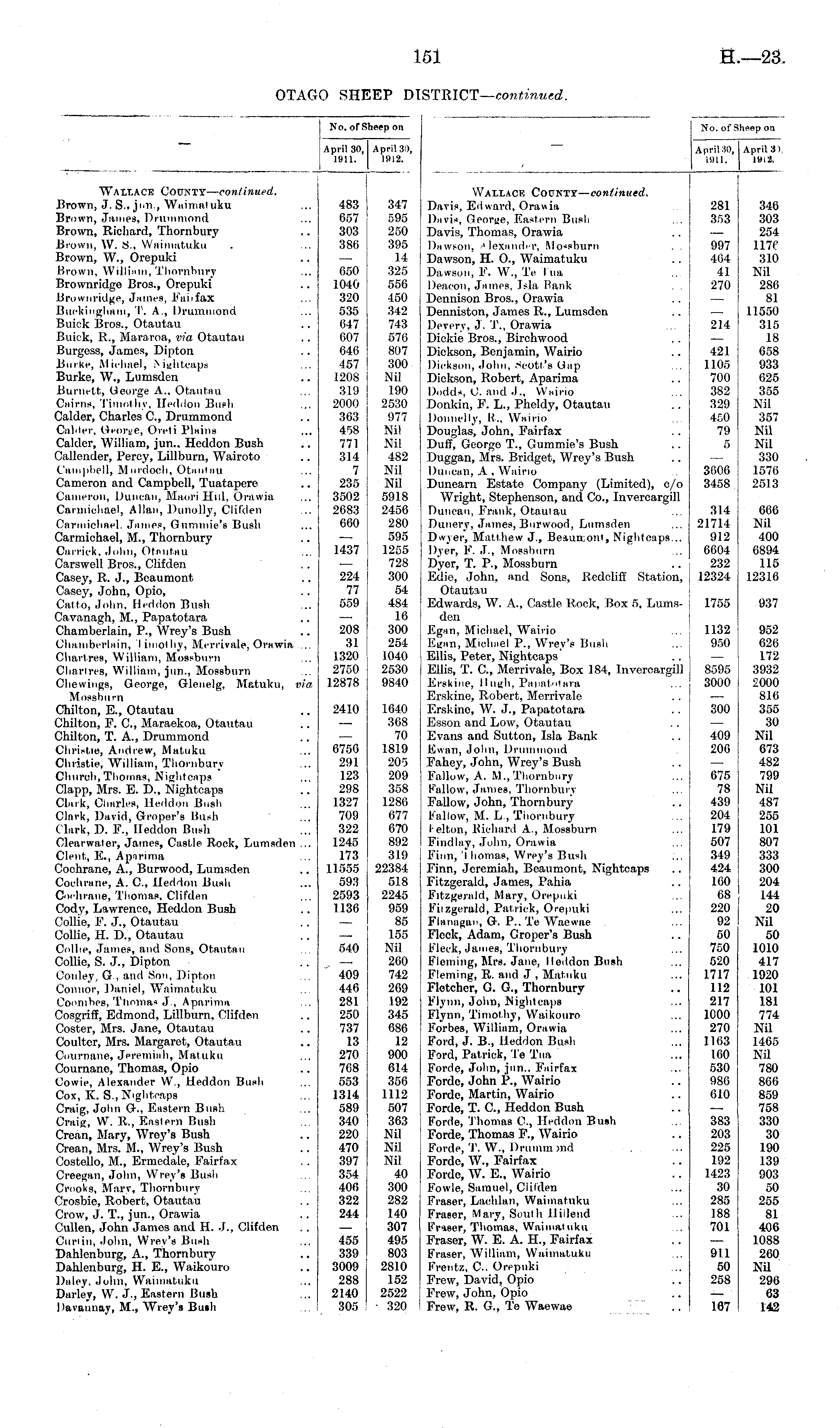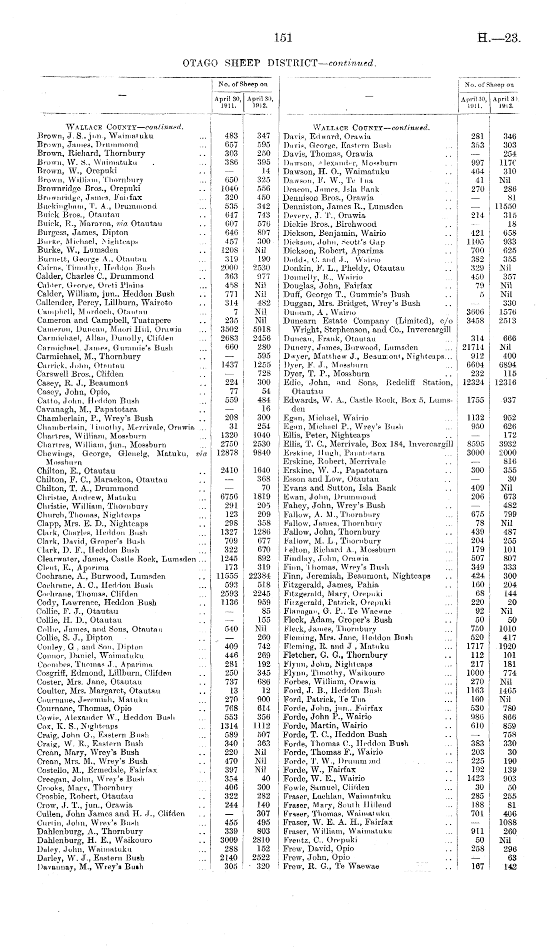 No. of Sheep on April 30, April 30, 1911. 1912. No. of Sheep on April 30, April 31 1911. 1912. Wallace County— continued. Brown, J. S, jun , Waimatuku Brown, James, Drummond Brown, Richard, Thornbury Brown, W. S., Waimatuku Brown, W., Orepuki Brown, William, Thornbury Brownridge Bros., Orepuki Brownridge, James, Fairfax Buckingham, T. A., Drummond Buick Bros., Otautau Buick, R., Mararoa, via Otautau Burgess, James, Dipton Burke, Michael, Myhtcaps Burke, W., Lumsden Burnett, Ueorge A., Otautau Cairns, 'Timothy, Heddon Bush Calder, Charles C, Drummond Cahler, Georye, Oreti Plains Calder, William, jun.. Heddon Bush Callender, Percy, Lillburn, Wairoto Campbell, Murdoch, Otautau Cameron and Campbell, Tuatapere Cameron, Duncan, Maori Hill, Orawia Carmichael, Allan, Diiiiolly, Clifden Carniichael. James, Gummie's Bush Carmichael, M., Thornbury Cai-rick, John, Otautau Carswell Bros., Clifden Casey, R. J., Beaumont Casey, John, Opio, Catto, John, Heddon Bush Cavanagh, M., Papatotara Chamberlain, P., Wrey's Bush Chamberlain, 'I iniolhy, Merrivale, Orawia ... Chart.re8, William, Mossburn Charlres, William, jun., Mossburn Chewings, George, Glenelg, Matuku, via Mossburn Chilton, E., Otautau Chilton, F. C, Maraekoa, Otautau Chilton, T. A., Drummond Christie, Andrew, Matuku Christie, William, Thornbury Church, Thomas, Nightcaps Clapp, Mrs. E. D., Nightcaps Chirk, Charles, Heddon Bush Clark, David, Groper's Bush Clark, D. F., Heddon Bush Clearwater, James, Castle Rock, Lumsden ... Clent, E., Apnrima Cochrane, A., Burwood, Lumsden Cochrane, A. G, Heddon Bush Cochrane, Thomas. Clifden Cody, Lawrence, Heddon Bush Collie, F. J., Otautau Collie, H. D., Otautau Collie, James, and Sons, Otautau Collie, S. J., Dipton Conley, G, and Son, Dipton Connor, Daniel, Waimatuku Coombes, Thomas J., Aparima Cosgriff, Edmond, Lillburn, Clifden Coster, Mrs. Jane, Otautau Coulter, Mrs. Margaret, Otautau Cournane, Jeremiah, Matuku Cournane, Thomas, Opio Cowie, Alexander W., Heddon Bush Cox, K. S.,Nightcap8 Craig, John G., Eastern Bush Craig, W. R., Eastern Bush Crean, Mary, W 7 rey's Bush Crean, Mrs. M., Wrey's Bush Costello, M., Ermedale, Fairfax Creegan, John, Wrey's Bush Crooks, Mary, Thornbury Crosbie, Robert, Otautau Crow, J. T., jun., Orawia Cullen, John James and H. J., Clifden Cunin, John, Wrey's Bush Dahlenburg, A., Thornbury Dahlenburg, H. E., Waikouro Daley, John, Waimatuku Darley, W. J., Eastern Bush Davannay, M., Wrey's Bush 483 657 303 386 650 1040 320 535 647 607 646 457 1208 319 2000 363 458 771 314 7 235 3502 2683 660 1437 224 77 559 208 31 1320 2750 12878 2410 6756 291 123 298 1327 709 322 1245 173 11555 593 2593 1136 347 595 250 395 14 325 556 450 342 743 576 807 300 Nil 190 2530 977 Nil Nil 482 Nil Nil 5918 2456 280 595 1255 728 300 54 484 16 300 254 1040 2530 9840 1640 368 70 1819 205 209 358 1286 677 670 892 319 22384 518 2245 959 85 155 Nil 260 742 269 192 345 686 12 900 614 356 1112 507 363 Nil Nil Nil 40 300 282 140 307 495 803 2810 152 2522 - 320 Wallace County— continued. Davis, Edward, Ora«in Davis, George, Eastern Bush Davis, Thomas, Orawia Dawson, Alexander, Mossburn . . Dawson, H. O., Waimatuku Dawson, F. W., Te Tua Deacon, James, Isla Bank . . Dennison Bros., Orawia Denniston, James R., Lumsden Devery, J. T., Orawia Dickie Bros., Birchwood Dickson, Benjamin, Wairio Dickson, John, .Scott's Gap Dickson, Robert, Aparima Dodds, O. and J., Wairio Donkin, F. L., Pheldy, Otautau Donnelly, R., Wairio Douglas, John, Fairfax Duff, George T., Gummie's Bush Duggan, Mrs. Bridget, Wrey's Bush Duncan, A , Wairio Dunearn Estate Company (Limited), c/o Wright, Stephenson, and Co., Invercargill Duncan, Frank, Otautau Dunery, James, Burwood, Lumsden Dwyer, Matthew J., Beaumont, Nightcaps... Dyer, P. J., Mossburn Dyer, T. P., Mossburn Edie, John, and Sons, Redcliff Station, Otautau Edwards, W. A., Castle Rock, Box 5, Lumsden Egan, Michael, Wairio Euan, Michael P., Wrey's Bush Ellis, Peter, Nightcaps' EUis, T. C, Merrivale, Box 184, Invercargill Erskine, H null, Panntolara Erskine, Robert, Merrivale Erskine, W. J., Papatotara Esson and Low, Otautau Evans and Sutton, Isla Bank Kwan, John, Drummond Fahey, John, Wrey's Bush Fallow, A. M., Thornbury Fallow, James, Thornbury FaUow, John, Thornbury Fallow, M. L , Thornbury l-elton, Richard A., Mossburn Findlay, John, Orawia Finn, Thomas, Wrey's Bush Finn, Jeremiah, Beaumont, Nightcaps Fitzgerald, James, Pahia Fitzgerald, Mary, Orepuki Fitzgerald, Patrick, Orepuki Flanagan, G. P.. Te Waewae Fleck, Adam, Groper's Bush Fleck, James, Thornbury Fleming, Mrs. Jane, Heddon Bush Fleming, R. and J , Matuku Fletcher, G. G., Thornbury Flynn, John, Nightcaps Flynn, Timothy, Waikouro Forbes, William, Orawia Ford, J. B., Heddon Bush Ford, Patrick, Te Tua Forde, John, jun.. Fairfax Forde, John P., Wairio Forde, Martin, Wairio Forde, T. C, Heddon Bush Forde, Thomas G, Heddon Bush Forde, Thomas F., Wairio Forde, T. W., Druinm >nd Forde, W., Fairfax Forde, W. E.. Wairio Fowle, Samuel, Clifden Fraser, Laehlan, Waimatuku Fraser, Mary, South Hillend Fraser, Thomas, Waimatuku Fraser, W. E. A. H., Fairfax Fraser, William, Waimatuku Frentz, G. Orepuki Frew, David, Opio Frew, John, Opio Frew, R. G., Te Waewae 281 353 997 464 41 270 214 421 1105 700 382 329 450 79 5 3606 3458 314 21714 912 6604 232 12324 1755 1132 950 8595 3000 300 409 206 346 303 254 1176 310 Nil 286 81 11550 315 18 658 933 625 355 Nil 357 Nil NU 330 1576 2513 666 Nil 400 6894 115 12316 937 952 626 172 3932 2000 816 355 30 Nil 673 482 799 Nil 487 255 101 807 333 300 204 144 20 Nil 50 1010 417 1920 101 181 774 Nil 1465 Nil 780 866 859 758 330 30 190 139 903 50 255 81 406 1088 260 NU 296 63 142 540 675 78 439 204 179 507 349 424 160 68 220 92 50 750 520 1717 112 217 1000 270 1163 160 530 980 610 409 446 281 250 737 13 270 768 553 1314 589 340 220 470 397 354 406 322 244 383 203 225 192 1423 30 285 188 701 455 339 3009 288 2140 305 911 50 258 167