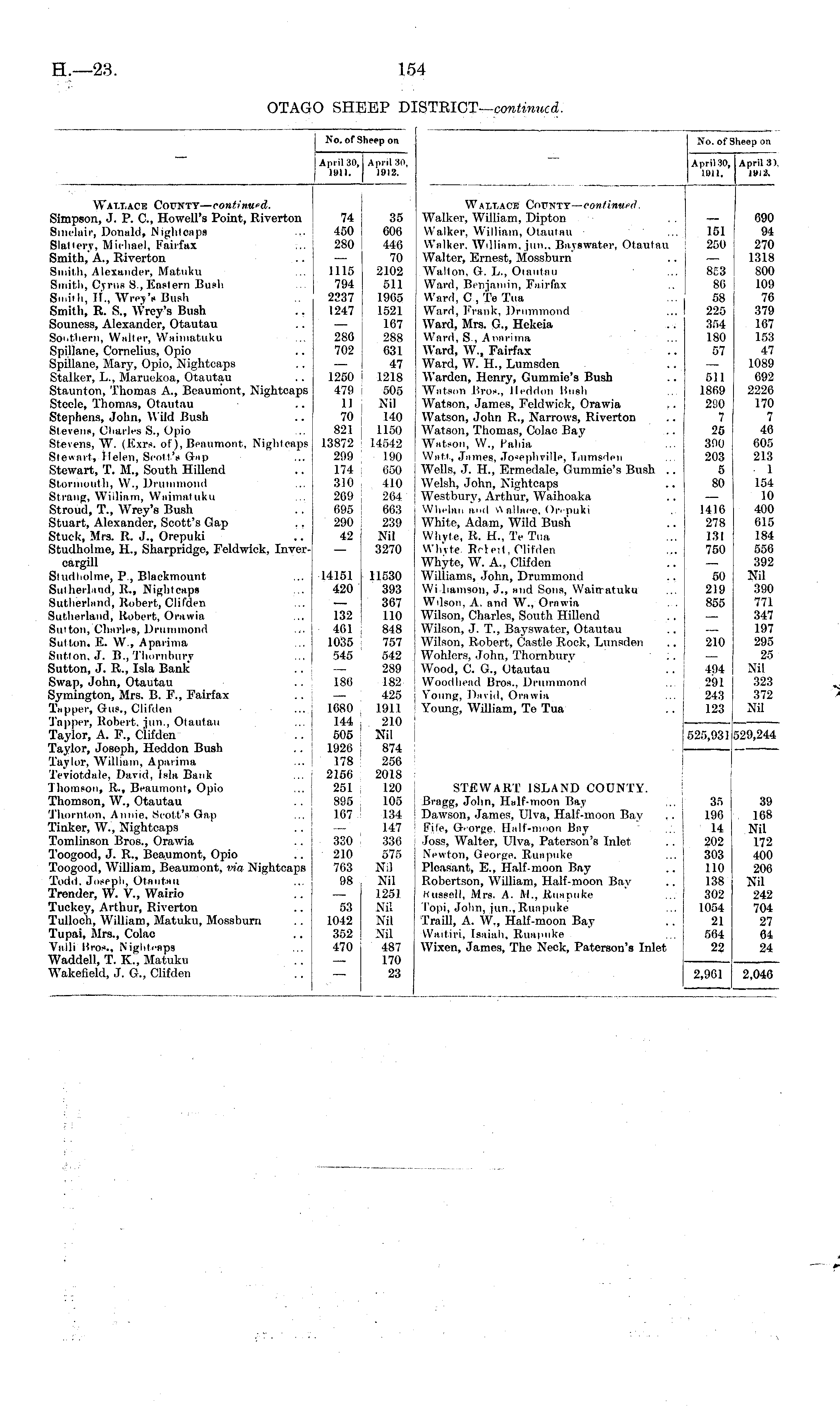 April 30, April 30, j 1911. 1912. No. of Sheep on No. of Sheep on April 30, April 3 1U11. 1912. April 3), 1912. Wallace County— continued. Simpson, J. P. C, Howell's Point, Riverton Sinclair, Donald, Nightcaps Slattery, Michael, Fairfax Smith, A., Riverton Smith, Alexander, Matuku Smith, Cyrus S., Eastern Bush Smith, H., Wrey's Bush Smith, R. S., Wrey's Bush Souness, Alexander, Otautau Soi.thern, Waiter, Waimatuku Spillane, Cornelius, Opio Spillane, Mary, Opio, Nightcaps Stalker, L., Maruckoa, Otautau Staunton, Thomas A., Beaumont, Nightcaps Steele, Thomas, Otautau Stephens, John, Wild Bush Stevens, Charles S., Opio Stevens, W. (Exrs. of), Beaumont, Nightcaps Stewart, Helen, Scott's Gap Stewart, T. M., South HUlend Storinoiith, W., Drummond Strang, William, Waimatuku Stroud, T., Wrey's Bush Stuart, Alexander, Scott's Gap Stuck, Mrs. R. J., Orepuki Studholme, H., Sharpridge, Feldwick, InveroargiU Studholme, P., Blaekmount Sutherland, R., Nightcaps Sutherland, Robert, Clifden Sutherland, Robert, Orawia Sutton, CharleB, Drummond Sutton. E. W., Aparima Sutton. J. B., Thornburv Sutton, J. R., Isla Bank Swap, John, Otautau Symington, Mrs. B. F., Fairfax .. Tapper, Gus., Clifden ... j Tapper, Robert, jun., Otautau Taylor, A. F., Clifden Taylor, Joseph, Heddon Bush .. \ Taylor, William, Aparima ... | Teviotdttle, David, Isla Bank Thomson, R., Beaumont, Opio Thomson, W., Otautau Thornton, Annie, Scott's Gap Tinker, W., Nightcaps Tomlinson Bros., Orawia Toogood, J. R., Beaumont, Opio Toogood, WiUiam, Beaumont, via Nightcaps Todd. Joseph, Otautau Trender, W. V., Wairio Tuckey, Arthur, Riverton Tulloch, WiUiam, Matuku, Mossburn Tupai, Mrs., Colac Valli I.res.. Nightcaps Waddell, T. K., Matuku Wakefield, J. G., Clifden 74 35 450 606 280 446 — 70 1115 2102 794 511 2337 1905 1247 1521 — 167 286 288 702 031 47 1250 '■ 1218 479 ! 505 II NU 70 140 821 j 1150 13872 I 14542 299 | 190 174 i 650 310 i 410 209 ; 264 695 i 663 290 I 239 42 Nil — 3270 Wallace County— continued. Walker, William, Dipton Walker, William, Otautau Walker. William, jun.. Bayawater, Otautau Walter, Ernest, Mossburn Walton, G. L., Otautau Ward, Benjamin, Fairfax Ward, C , te Tua Ward, Frank, Drummond Ward, Mrs. G., Hekeia Ward, S , Aoni-iina Ward, W, Fairfax Ward, W. H., Lumsden Warden, Henry, Gummie's Bush Watson Bros., Heddon Hush Watson, James, Feldwick, Orawia Watson, John R., Narrows, Riverton Watson, Thomas, Colac Bay Watson, W., Pahia Watt., James, Josephville, Lumsden Wells, J. H., Ermedale, Gummie's Bush .. Welsh, John, Nightcaps Westburyr, Arthur, Waihoaka Whchin a.nd v\allftce, Orepuki White, Adam, Wild Bush Whvte, R. H., Te Tua WhVte. Rr-leit, Clifden Whyte, W. A., Clifden Williams, John, Drummond Wi hamson, J., and Sons, Waimatuku Wilson, A. and W., Orawia Wilson, Charles, South Hillend Wilson, J. T., Bayswater, Otautau Wilson, Robert, Castle Rock, Lunsden Wohlers, John, Thornbury :. Wood, C. G., Otautau Woodhead Bros., Drummond Young, David, Orawia Young, WUliam, Te Tua 151 250 853 80 58 225 354 180 57 511 1869 290 7 25 390 203 5 80 690 94 270 1318 800 109 76 379 167 153 47 1089 692 2226 170 7 46 605 213 1 154 10 400 615 184 556 392 NU 390 771 347 197 295 25 Nil 323 372 Nil 1416 278 131 750 14151 11530 420 393 — 367 132 110 461 848 1035 757 545 ' 542 — 289 186 182 , 425 1680 j 1911 144 j 210 505 Nil 1926 ! 874 178 256 2156 2018 251 120 895 , 105 167 ! 134 — 147 330 | 336 210 575 763 Nil 98 Nil — 1251 53 NU 1042 Nil 352 Nil 470 487 — 170 — 23 STEWART ISLAND COUNTY. Bragg, John, Half-moon Bay Dawson, James, Ulva, Half-moon Bay File, G.-orge. Half-moon Bay Joss, Walter, Ulva, Paterson's Inlet Newton, George. Ruapuke Pleasant, E., Half-moon Bay Robertson, WiUiam, Half-moon Bay Kussell, Mrs. A. M., Ruapuke Topi, John, jun.,Ruapuke Traill, A. W., Half-moon Bay vVaitiri, Isaiah, Ruapuke Wixen, James, The Neck, Paterson's Inlet 525,931 50 219 855 210 494 291 243 123 529,244 35 190 14 202 303 110 138 302 1054 21 564 22 39 168 Nil 172 400 206 Nil 242 704 27 64 24 2,961 2,046
