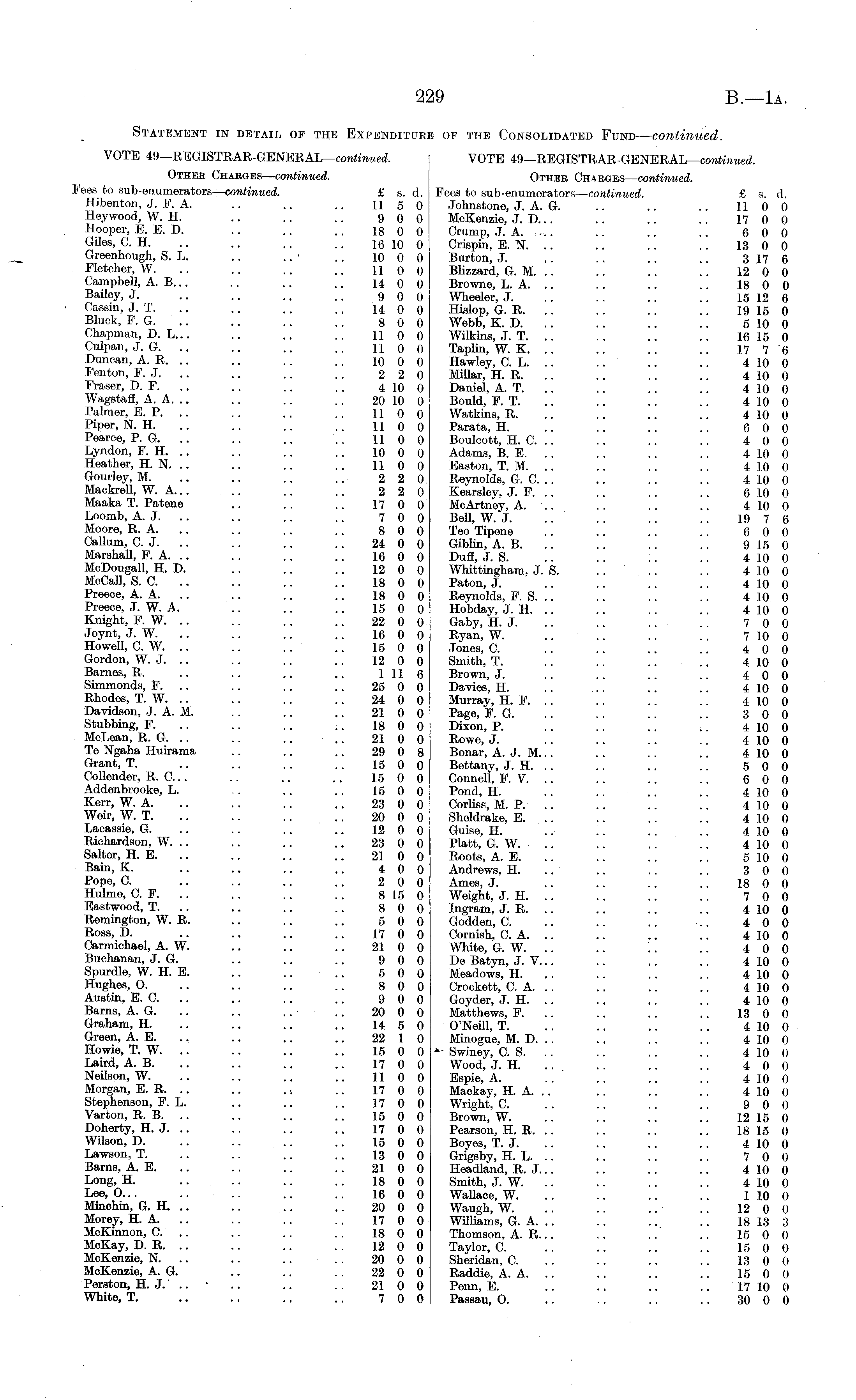 Statement in detail of the Expenditure of the Consolidated Fund— continued. VOTE 49—REGISTRAR-GENERAL— continued. VOTE 49—REGISTRAR-GENERAL— continued. Other Chabges— continued. Other Charges— continued. Fees to sub-enumerators— continued. £ s. d. Fees to sub-enumerators— continued. £ s d Hibenton, J. F. A. .. .. .. 11 5 0 Johnstone, J. A. G. .. .. .. 11 0 0 Heywood, W. H. .. .. .. 90 0 McKenzie, J. D... .. .. .. 17 0 0 Hooper, E. E. D. .. .. .. 18 0 0 Crump, J. A. ... .. .. 60 0 Giles, C. H. .. .. .. .. 16 10 0 Crispin, E. N. .. .. .. .. 13 0 0 Greenhough, S. L. .. .. ■ .. 10 0 0 Burton, J. .. .. .. .. 317 6 Fletcher, W. .. .. .. .. 11 0 0 Blizzard, G. M. .. .. .. .. 12 0 0 Campbell, A. 8... .. .. .. 14 0 0 Browne, L. A. .. .. .. .. 18 0 0 Bailey, J. .. .. .. .. 9 0 0 Wheeler, J. .. .. .. .. 15 12 6 Cassin, J. T. .. .. .. .. 14 0 0 Hislop, G. R. .. .. .. .. 19 15 0 Bluok, F. G. .. .. .. 8 0 0 Webb, K. D. .. . . .. .. 510 0 Chapman, D. L... .. .. .. 11 0 0 Wilkins, J. T. .. .. .. .. 16 15 0 Culpan, J. G. .. .. .. .. 11 0 0 Taplin, W. K. .. .. .. .. 17 7 6 Duncan, A. R. .. .. .. .. 10 0 0 Hawley, C. L. .. .. .. .. 410 0 Fenton, F.J. .. .. .. .. 2 2 0 Millar, H. R. .. .. .. .. 410 0 Fraser, I). F. .. .. .. .. 410 0 Daniel, A. T. .. .. .. 410 0 Wagstaff, A. A. .. . . .. .. 20 10 0 Bould, P. T. .. .. .. . . 410 0 Palmer, E. P. .. .. .. .. 11 0 0 Watkins, R. .. .. .. .. 410 0 Piper, N. H. .. .. .. .. 11 0 0 Parata, H. .. .. .. .. 6 0 0 Pearce, P. G. .. .. .. .. 11 0 0 Boulcott, H. C. .. .. .. .. 4 0 0 Lyndon, F. H. .. .. .. .. 10 0 0 Adams, B. E. .. .. .. .. 410 0 Heather, H. N. .. .. .. .. 11 0 0 Easton, T. M. .. .. .. .. 410 0 Gourley, M. .. .. .. .. 2 2 0 Reynolds, G. C. .. .. .. .. 410 0 Mackrell, W. A... .. .. .. 2 2 0 Kearsley, J. R .. .. .. .. 610 0 Maaka T. Patene .. .. .. 17 0 0 McArtney, A. .. .. .. .. 410 0 Loomb, A. J. .. .. .. .. 7 0 0 Bell, W. J. .-. .. .. .. 19 7 6 Moore, R. A. .. .. .. .. 8 0 0 Teo Tipene .. .. .. .. 6 0 0 Callum, C. J. .. .. .. .. 24 0 0 Giblin, A. B. .. .. . 915 0 Marshall, F. A. .. .. .. .. 16 0 0 Duff, J. S. .. .. .. .. 410 0 McDougall, H. D. .. .. .. 12 0 0 Whittingham, J. S. .. .. .. 410 0 MoCall, S. C. .. .. .. 18 0 0 Paton, J. .. .. .. . . 410 0 Preece, A. A. .. .. .. 18 0 0 Reynolds, P. S. .. .. .. 410 0 Preece, J. W. A. .. .. .. 15 0 0 Hobday, J. H. .. .. . . 410 0 Knight, F. W. .. .. .. .. 22 0 0 Gaby, H. J. .. .. .. .. 7 0 0 Joynt, J. W. .. .. .. .. 16 0 0 Ryan, W. .. .. .. .. 710 0 Howell, C. W. .. .. .. ■ .. 15 0 0 Jones, C. .. .. .. .. 4 0 0 Gordon, W. J. .. .. .. .. 12 0 0 Smith, T. .. .. .. .. 410 0 Barnes, R. .. .. .. .. 111 6 Brown, J. .. .. .. .. 4 0 0 Simmonds, F. .. .. .. .. 25 0 0 Davies, H. .. .. .. .. 410 0 Rhodes, T. W. .. .. .. .. 24 0 0 Murray, H. F. .. .. .. 410 0 Davidson, J. A. M. . . .. .. 21 0 0 Page, F. G. .. .. .. .. 3 0 0 Stubbing, P. .. .. .. 18 0 0 Dixon, P. .. .. .. .. 410 0 McLean, R. G. .. .. .. .. 21 0 0 Rowe, J. .. .. .. .. 410 0 Te Ngaha Huirama .. .. .. 29 0 8 Bonar, A. J. M... .. .. .. 410 0 Grant, T. .. .. .. .. 15 0 0 Bettany, J. H. . . .. .. .. 5 0 0 Collender, R. C... .. .. .. 15 0 0 Connell, F. V. .. . . .. .. 6 0 0 Addenbrooke, L. .. .. .. 15 0 0 Pond, H. .. .. .. .. 410 0 Kerr, W. A. .. . . .. .. 23 0 0 Corliss, M. P. .. .. .. .. 410 0 Weir, W. T. .. .. .. .. 20 0 0 Sheldrake, E. .. .. .. .. 410 0 Lacassie, G. .. .. .. .. 12 0 0 Guise, H. .. .. .. .. 410 0 Richardson, W. .. .. .. .. 23 0 0 Platt, G. W. .. .. .. .. 410 0 Salter, H. E. .. .. .. .. 21 0 0 Roots, A. E. .. .. .. .. 510 0 Bain, K. .. ~ .. .. 4 0 0 Andrews, H. .. .. .. .. 3 0 0 Pope, C. .. .. .. .. 2 0 0 Ames, J. .. .. .. .. 18 0 0 Hulme, C. F. .. .. .. .. 815 0 Weight, J. H. .. .. .. .. 7 0 0 Eastwood, T. .. .. .. .. 8 0 0 Ingram, J. R. .. .. .. .. 410 0 Remington, W. R. .. .. .. 5 0 0 Godden, C. .. .. .. .. 4 0 0 Ross, D. .. .. .. .. 17 0 0 Cornish, C. A. .. .. .. .. 410 0 Carmichael, A. W. .. .. .. 21 0 0 White, G. W. .. .. .. .. 4 0 0 Buchanan, J. G. .. .. .. 9 0 0 De Batyn, J. V... .. .. .. 410 0 Spurdle, W. H. E. .. .. .. 5 0 0 Meadows, H. .. .. .. .. 410 0 Hughes, O. .. .. .. .. 8 0 0 Crockett, C. A. .. .. .. .. 410 0 Austin, E. C. .. .. .. .. 9 0 0 Goyder, J. H. .. .. .. .. 410 0 Barns, A. G. .. .. .. .. 20 0 0 Matthews, F. .. .. .. 13 0 0 Graham, H. .. .. .. .. 14 5 0 O'Neill, T. .. .. .. .. 410 0 Green, A. E. .. .. .. .. 22 1 0 Minogue, M. D. .. .. .. .. 410 0 Howie, T. W. .. .. .. .. 15 0 0 - Swiney, C. S. .. .. .. .. 410 0 Laird, A. B. .. .. .. .. 17 0 0 Wood, J. H. .. .. .. .. 4 0 0 Neilson, W. .. .. .. .. 11 0 0 Espie, A. .. .. .. .. 410 0 Morgan, E. R. .. .. . : .. 17 0 0 Mackay, H. A. .. .. .. .. 410 0 Stephenson, F. L. .. .. .. 17 0 0 Wright, C. .. .. .. . . 9 0 0 Varton, R. B. .. .. .. .. 15 0 0 Brown, W. .. .. .. .. 12 15 0 Doherty, H. J. .. .. .. .. 17 0 0 Pearson, H. R. .. .. .. .. 18 15 0 Wilson, D. .. .. .. .. 15 0 0 Boyes, T. J. .. .. .. .. 410 0 Lawson, T. .. .. .. .. 13 0 0 Grigsby, H. L. .. .. .. .. 7 0 0 Barns, A. E. .. .. .. . . 21 0 0 Headland, R. J. .. .. .. .. 410 0 Long, H. .. .. .. . . 18 0 0 Smith, J. W. .. .. .. 410 0 Lee, 0... .. .. .. . . 16 0 0 Wallace, W. .. .. .. .. 110 0 Minohin, G. H. .. .. .. .. 20 0 0 Waugh, W. .. .. .. .. 12 0 0 Morey, H. A. .. .. .. .. 17 0 0 Williams, G. A. .. .. .. .. 18 13 3 McKinnon, C. .. .. .. .. 18 0 0 Thomson, A. R... .. .. .. 15 0 0 McKay, D. R. .. .. .. .. 12 0 0 Taylor, C. .. .. .. .. 15 0 0 McKenzie, N. .. .. .. . . 20 0 0 Sheridan, C. .. .. .. .. 13 0 0 McKenzie, A. G. .. .. . . 22 0 0 Raddie, A. A. .. .. .. .. 15 0 0 Perston, H. J. .. ■.. .. . . 210 0 Perm, E. .. .. .. 17 10 0 White, T. .. .. .. .. 7 0 0 Passau, O. .. .. .. .. 30 0 0