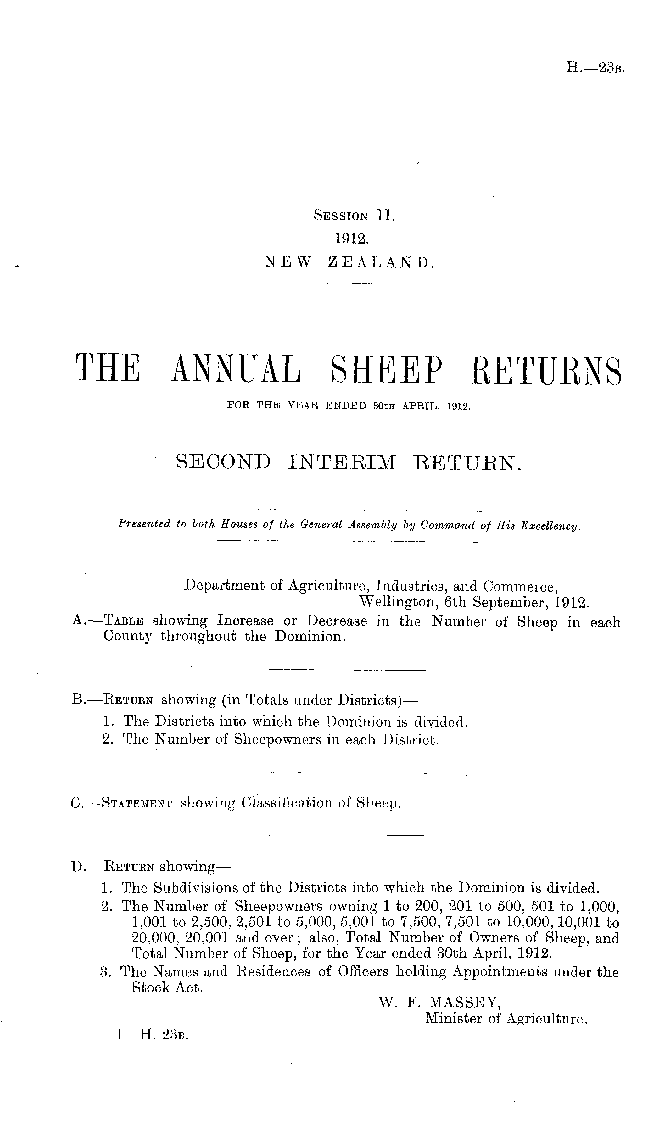 D. -Return showing — 1. The Subdivisions of the Districts into which the Dominion is divided. 2. The Number of Sheepowners owning 1 to 200, 201 to 500, 501 to 1,000, 1,001 to 2,500, 2,501 to 5,000, 5,001 to 7,500, 7,501 to 10,000,10,001 to 20,000, 20,001 and over; also, Total Number of Owners of Sheep, and Total Number of Sheep, for the Year ended 30th April, 1912. 3. The Names and Residences of Officers holding Appointments under the Stock Act. W. F. MASSEY, Minister of Agriculture.