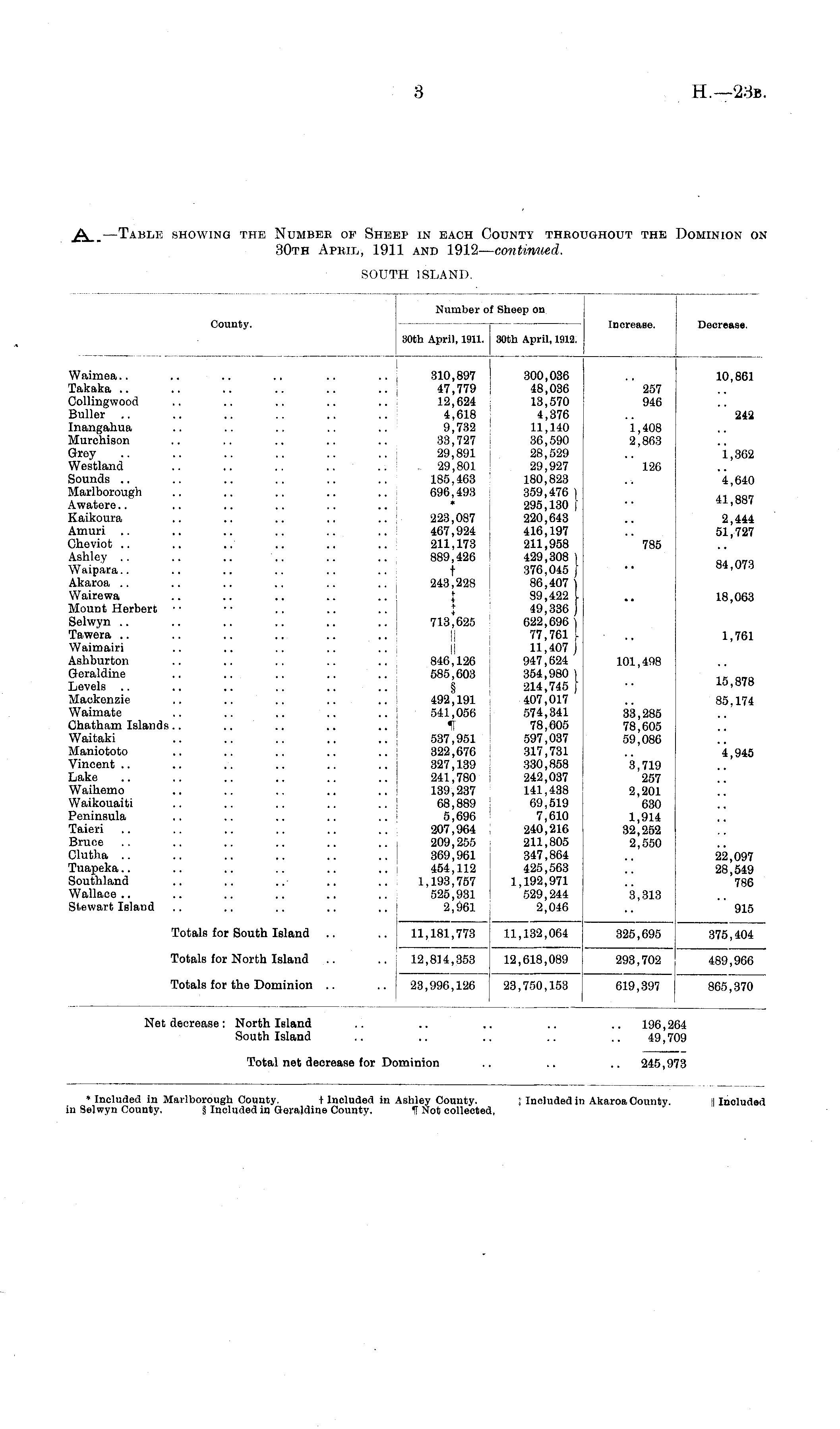 A. —Table showing the Number of Sheep in each County throughout the Dominion on 30th April, 1911 and 1912 — continued. SOUTH ISLAND.