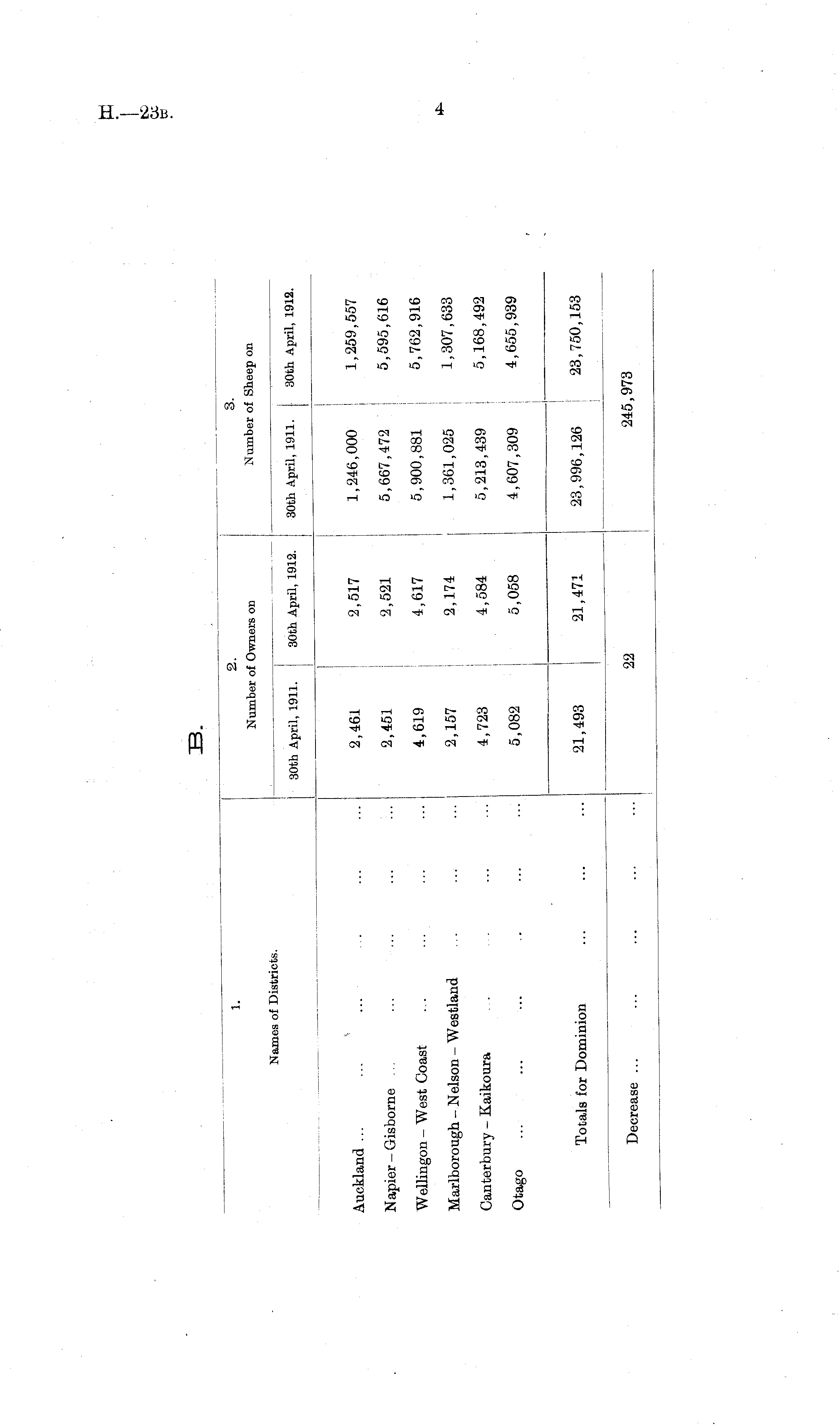 1. 2. 3. Number of Owners on Number of Sheep on Names of Districts. 30th April, 1911. 30th April, 1912. 30th April, 1911. 30th April, 1912. | 2,461 j 2,517 1,246,000 1,259,557 Auckland ... Napier-Gisborne ... 2,521 5,667,472 j 5,595,616 2,451 Wellingon - West Coast 4,619 4,617 5,900,881 1,361,025 5,762,916 1,307,633 Marlborough - Nelson - Westland 2,157 2,174 Canterbury - Kaikoura , . 4,723 4,584 5,213,439 5,168,492 Otago 5,082 5,058 4,607,309 4,655,939 Totals for Dominion 21,493 21,471 23,996,126 23,750,153 Decrease ... 22 245,973