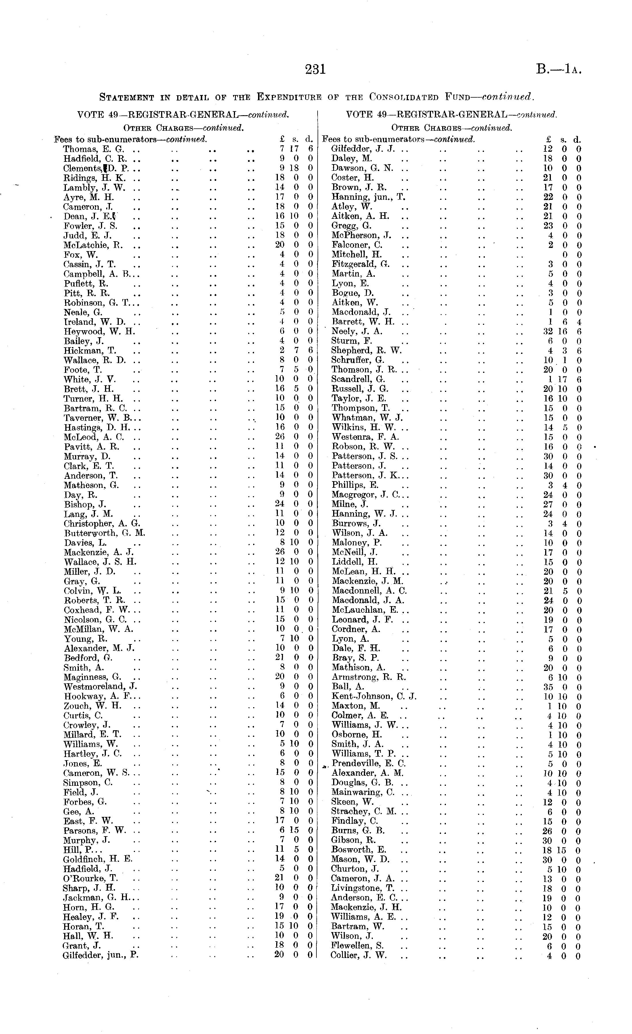 Statement in detail of the Expenditure of the Consolidated Fund — continued. VOTE 49—REGISTRAR-GENERAL— continued. VOTE 49— REGISTRAR-GENERAL— continued. Other Charges— continued. Other Charges— continued. Fees to sub-enumerators— continued. £ s. d. Fees to sub-enumerators— continued. £ s. d. Thomas, E. G. .. .. .. .. 7 17 6 Gilfedder, J. J. .. .. .. .. 12 0 0 Hadfield, C. R. .. .. .. .. 9 0 0 Daley, M. .. .. .. .. 18 0 0 Clements,|D. P. .. .. .. .. 9 18 0 Dawson, G. N. .. .. .. .. 1.0 0 0 Ridings, H. K. .. .. .. .. 18 0 0 Coster, H. .. ~ .. .. 21 0 0 Lambly, J. W. .. ... .. .. 14 0 0 Brown, J. R. .. .. .. .. 17 0 0 Ayre, M. H. .. .. .. .. 17 0 0 Harming, jun., T. .. .. .. 22 0 0 Cameron, ,T. .. .. .. .. 18 0 0 Atley, W. .. .. .. .. 21 0 0 Dean, J. E.| .. .. .. .. 16 10 0 Aitken, A. H. .. .. .. .. 21 0 0 Fowler, J. S. .. .. .. .. 15 0 0 Gregg, G. .. .. .. . . 23 0 0 Judd, E. J. .. .. .. .. 18 0 0 McPherson, J. .. .. .. .. 4 0 0 McLatchie, P.. .. .. .. .. 20 0 0 Falconer, C. .. .. .. ' .. 2 0 0 Fox, W. .. .. .. .. 4 0 0 Mitchell, H. .. .. .. .. 0 0 Cassin, J. T. .. .. .. .. 4 0 0 Fitzgerald, G. .. .. .. .. 3 0 0 Campbell, A. 8... .. .. .. 4 0 0 Martin. A. .. .. .. .. 5 0 0 Puflett, R. .. .. .. .. 4 0 0 Lyon, E. .. .. .. .. 4 0 0 Pitt, R. R. .. .. .. .. 4 0 0 Borne, D. .. .. . . .. 3 0 0 Robinson, G. T... .. .. .. 4 0 0 Aitken, W. .. .. .. .. 5 0 0 Neale, G. .. .. .. .. 5 0 0 Macdonald, J. . . .. .. .. 10 0 Ireland, W. D. .. .. .. .. 4 0 0 Barrett, W. H. .. . .. .. 16 4 Heywood, W. H. .. .. .. 0 0 0 Neely, J. A. .. .. .. .. 32 10 6 Bailey, J. .. .. .. .. 4 0 0 Sturm, F. .. .. .. .. 6 0 0 Hickman, T. .. .. .. .. 2 7 6 Shepherd, R. W. .. .. .. 4 3 6 Wallace, R. t). .. .. .. .. 8 0 0 Schruffer, G. .. .. .. .. 10 I 0 Foote, T. .. .. .. .. 7 5 0 Thomson. J. R. .. .. .. .. 20 0 0 White, J. V. .. .. .. .. 10 0 0 Scandrell, G. .. .. .. .. 1 17 6 Brett, J. H. .. .. .. .. 16 5 0 Russell, J. G. .. .. .. .. 20 10 0 Turner, H. H. .. .. .. .. 10 0 0 Taylor, J. E. .. .. .. .. 16 10 0 Bartram, R. C. .. .. .. . . 15 0 0 Thompson, T. .. .. .. .. 15 0 0 Taverner, W. 8... .. .. .. 10 0 0 Whatman, W. J. .. .. .. 15 0 0 Hastings, D. H. .. .. .. .. 16 0 0 Wilkins, H. W. .. .. .. .. 14 5 0 McLeod, A. C. .. .. .. .. 26 0 0 Westenra, F. A. .. .. .. 15 0 0 Pavitt, A. R. .. .. .. . . 110 0 Robson, R. W. .. .. .. .. 16 0 0 Murray, D. .. .. .. .. 14 0 0 Patterson, J. S. .. .. .. .. 30 0 0 Clark, E. T. .. .. .. .. 11 0 0 Patterson, J. .. .. .. .. 14 0 0 Anderson, T. .. .. .. .. 14 0 0 Patterson, J. X... .. .. .. 30 0 0 Matheson, G. .. .. .. .. 9 0 0 Phillips. E. .. .. .. .. 3 4 0 Bay, R. . . .. .. .. 9 0 0 Maogregor, J. C... .. .. .. 24 0 0 Bishop, J. .. . . .. .. 24 0 0 Milne, J. . . .. .. .. 27 0 0 Lang, J. M. .. .. .. .. 11 0 0 Harming, W. J. .. .. .. .. 24 0 0 Christopher, A. G. .. .. . . 10 0 0 Burrows, J. .. .. .. .. 3 4 0 Butterworth, G. M. .. .. .. 12 0 0 Wilson, J. A. .. .. .. .. 14 0 0 Davies, L. .. .. .. .. 8 10 0 Maloney. P. .. .. .. .. 10 0 0 Mackenzie, A. J. .. .. .. 26 0 0 McNeill, J. .. .. .. .. 17 0 0 Wallace, J. S. H. 12 10 0 Liddell, H 15 0 0 Miller, J. D. .. .. .. .. 110 0 McLean. H. H. .. .. .. . . 20 0 0 Gray, G. .. .. .. .. 110 0 Mackenzie, J. M. ~ .. .. 20 0 0 Oolvin, W. L. .. .. .. .. 910 0 Macdonnell, A. C. .. .. .. 21 5 0 Roberts, T. R. .. .. .. .. 15 0 0 Macdonald, J. A. .. .. . . 24 0 0 Coxhead, F. W. .. .. .. .. 11 0 0 McLauchlan, E. .. .. .. .. 20 0 0 Nicolson, G. C. . . .. .. . . 15 0 0 Leonard, J. F. .. .. .. .. 19 0 0 McMillan, W. A. .. .. .. 1.0 0. 0 Cordner, A. .. .. .. .. 17 0 0 Young, R. .. .. . . .. 710 0 Lyon, A. .. .. .. .. 5 0 0 Alexander, M. J. .. .. .. 10 0 0 Dale, F. H. .. .. .. .. 6 0 0 Bedford, G. .. .. .. .. 21 0 0 Bray, S. P. .. .. .. 9 0 0 Smith, A. .. .. .. . . 8 0 0 Mathison, A. .. .. .. 20 0 0 Maginness, G. .. .. .. . . 20 0 0 Armstrong, R. R. .. .. .. 610 0 Westmoreland, J. .. . . .. 9 0 0 Ball. A. . . .. .. .. 35 0 0 Hookway, A. F.. . .. .. .. 6 0 0 Kent-Johnson, C. J. .. .. .. 10 10 0 Zouch, W. H. .. .. .. .. 14 0 0 Maxton, M. .. .. .. .. 1 10 0 Curtis, C. .. .. .. .. 10 0 0 Colmer, A. E. .. .. .. .. 4 10 0 Crowley, J. .. .. .. .. 7 0 0 Williams, J. W. .. .. .. .. 410 0 Millard, E. T. .. .. .. .. 10 0 0 Osborne, H. .. .. .. .. 1 10 0 Williams, W. . . .. .. .. 5 10 0 Smith, J. A. .. .. 4 10 0 Hartley, J. C. . . .. .. .. 6 0 0 Williams, T. P. .. .. .. .. 510 0 .Tones, E. .. .. .. .. 8 0 0 a _ Prendeville, E. C. .. .. 5 0 0 Cameron, W. S. .. .. .." .. 15 0 0 Alexander, A. M. .. .. .. 10 10 0 Simpson, C. .. .. .. .. 8 0 0 Douglas, G. B. .. .. .. .. 410 0 Field, J. .. .. v .. •• 810 0 Mainwaring, C. .. .. .. .. 4100 Forbes, G. . . .. .. . . 710 0 Skeen, W. .. .. .. .. 12 0 0 Gee, A. .. .. .. .. 8 10 0 Straohey, C. M. .. .. .. .. 6 0 0 East, F. W. .. .. .. .. 17 0 0 Findlay, C. .. .. .. .. 15 0 0 Parsons, F. W. .. .. .. .. 615 0 Burns, G. B. .. .. .. 26 0 0 Murphy, J. .. .. .. .. 7 0 0 Gibson, R. .. .. .. .. 30 0 0 "Hill, P... .. •• •• .. 11 5 0 Bosworth. E. .. .. .. .. 18 15 0 Goldfinch, H. E. . . . . .. 14 0 0 Mason, W. D. .. .. .. .. 30 0 0 Hadfield, ,T. . . .. .. .. 5 0 0 Churton, J. .. .. .. .. 510 0 O'Rourke, T. . . . . .. .. 21 0 0 Cameron, J. A. .. .. .. .. 13 0 0 Sharp, J. H. . . . . .. .. 10 0 0 Livingstone, T. .. .. .. .. 18 0 0 .Tackman, G. H... .. .. .. 9 0 0 Anderson, E. C. .. .. .. .. 19 0 0 Horn, H. G. .. .. .. . . 17 0 0 Mackenzie, J. H. .. .. .. 10 0 0 Healey, J. F. .. .. .. .. 19 0 0 Williams, A. E. .. .. .. .. 12 0 0 Horan, T. . . .. . . .. 15 10 0 Bartram, W. .. .. . . 15 0 0 Hall. W. H. .. .. . . .. 10 0 0 Wilson, J. .. .. .. .. 20 0 0 Grant, J. .. .. . . .. 18 0 0 Flewellen, S. .. .. .. 6 0 0 Gilfedder, jun., P. .. . . .. 20 0 0 Collier, J. W. .. .. .. .. 4 0 0