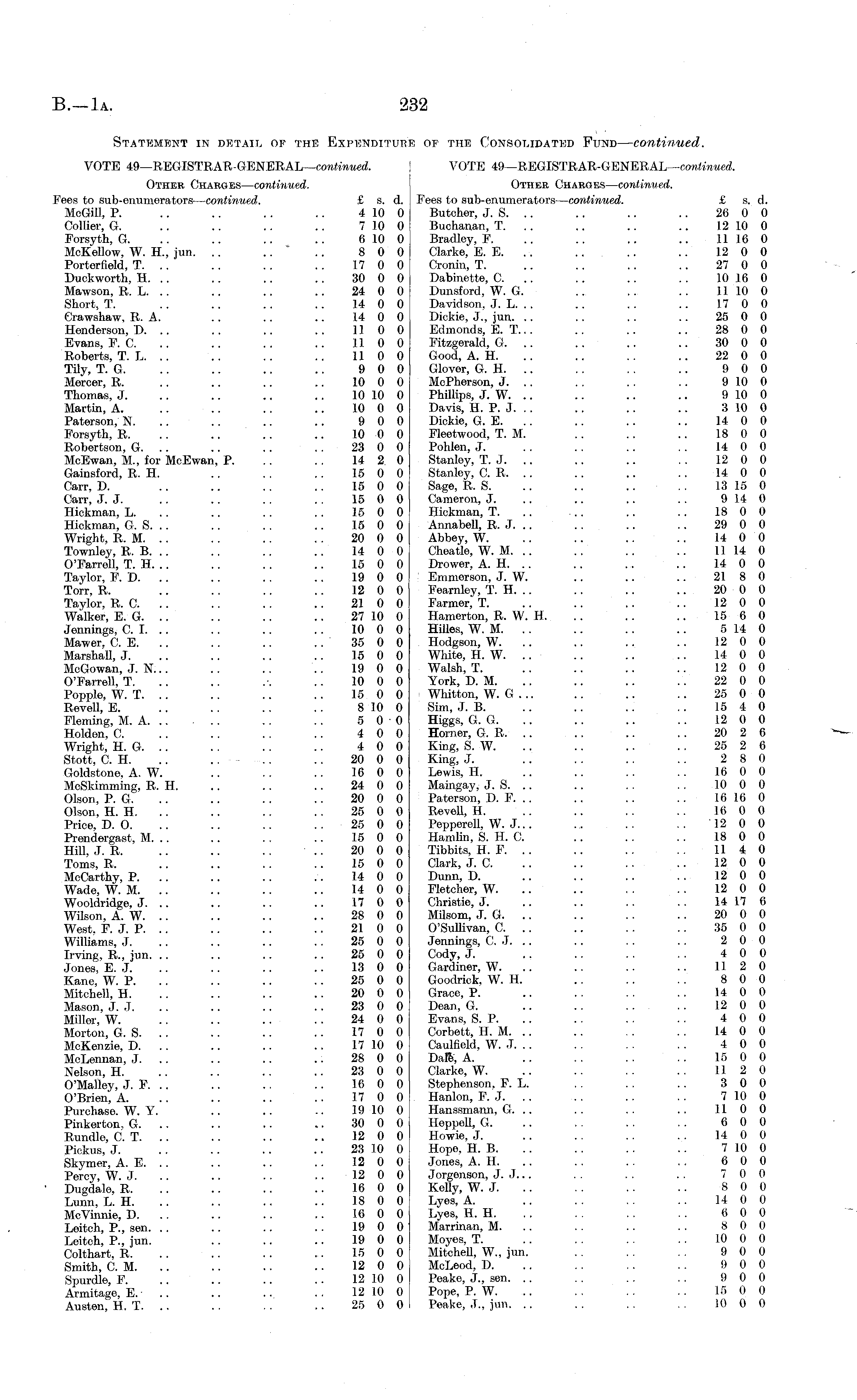 Statement in detait, of the Expenditure of the Consolidated Fund — continued. VOTE 49—REGISTRAR-GENERAL— continued. VOTE 49—REGISTRAR-GENERAL— continued. Other Charges— continued. Other Charges— continued. Fees to sub-enumerators— continued. £ s. d. Fees to sub-enumerators— continued. £ s. d. McGill, P. .. .. .. .. 410 0 Butcher, J. S. .. .. .. .. 26 0 0 Collier, G. .. .. .. .. 7 10 0 Buchanan, T. .. .. .. .. 12 10 0 Forsyth, G. .. .. .. .. 6 10 0 Bradley, F. .. .. .. .. 11 16 0 McKellow, W. H., jun. .. .. .. 8 0 0 Clarke, E. E. . . .. .. .. 12 0 0 Porterfield, T. . . .. .. .. 17 0 0 Cronin, T. .. .. .. .. 27 0 0 Duckworth, H. .. .. .. .. 30 0 0 Dabinette, C. .. .. .. .. 10 16 0 Mawson, R. L. .. .. .. .. 24 0 0 Dunsford, W. G. .. .. . . 11 10 0 Short, T. .. .. .. .. H 0 0 Davidson, J. L. . . .. . . .. 17 0 0 Crawshaw, R. A. .. .. .. 14 0 0 Dickie, J., jun. . . .. .. .. 25 0 0 Henderson, D. .. .. .. .. 11 0 0 Edmonds, E. T... .. .. .. 28 0 0 Evans, F. C. .. .. .. .. 11 0 0 Fitzgerald, G. .. .. .. .. 30 0 0 Roberts, T. L. .. .. .. .. 11 0 0 Good, A. H. .. .. .. .. 22 0 0 Tily, T. G. .. .. .. .. 9 0 0 Glover, G. H. .. .. . . .. 9 0 0 Mercer, R. .. .. .. .. 10 0 0 McPherson, J. .. . . . . .. 910 0 Thomas, J. .. .. .. .. 10 10 0 Phillips, J. W. .. .. .. .. 910 0 Martin, A. .. .. .. .. 10 0 0 Davis, H. P. J. .. .. .. .. 310 0 Paterson, N. .. .. .. .. 9 0 0 Dickie, G. E. .. .. .. .. 14 0 0 Forsyth, R. .. .. .. .. 10 0 0 Fleetwood, T. M. .. .. .. 18 0 0 Robertson, G. .. .. .. . . 23 0 0 Pohlen, J. .. .. .. .. 14 0 0 McEwan, M., for McEwan, P. .. .. 14 2 0 Stanley, T. J. .. .. .. .. 12 0 0 Gainsford, R. H. .. . . .. 15 0 0 Stanley, C. R. .. .. .. .. 14 0 0 Carr, D. .. .. . . .. 15 0 0 Sage, R. S. .. .. .. . . 13 15 0 Carr, J. J. .. .. .. .. 15 0 0 Cameron, J. .. .. .. .. 9 14 0 Hickman, L. .. .. . . .. 15 0 0 Hickman, T. .. .. .. .. 18 0 0 Hickman, G. S. .. .. .. .. 15 0 0 Annabell, R. J. .. .. .. .. 29 0 0 Wright, R. M. .. .. .. .. 20 0 0 Abbey, W. .. .. .. .. 14 0 0 Townley, R. B. .. .. .. .. 14 0 0 Cheatle, W. M. .. .. .. .. 11 14 0 O'Farrell, T. H. .. .. .. .. 15 0 0 Drower, A. H. .. .. ... .. 14 0 0 Taylor, F. D. .. .. . . .. 19 0 0 Emmerson, J. W. .. .. .. 21 8 0 Torr, R. .. .. .. .. 12 0 0 Fearnley, T. H. .. .. .. .. 20 0 0 Taylor, R. C. .. .. .. .. 21 0 0 Farmer, T. .. .. .. .. 12 0 0 Walker, E. G. .. .. .. .. 27 10 0 Hamerton, R. W. H. .. .. .. 15 6 0 Jennings, C 1... . . .. .. 10 0 0 Hilles, W. M. .. .. .. .. 514 0 Mawer. C. E. .. . . .. .. 35 0 0 Hodgson, W. .. .. .. .. 12 0 0 Marshall, J. .. .. .. .. 15 0 0 White, H. W. .. .. .. .. 14 0 0 McGowan, J. N... .. .. .. 19 0 0 Walsh, T. .. .. .. .. 12 0 0 O'Farrell, T. .. .. .-. .. 10 0 0 York, D. M. .. .. .. .. 22 0 0 Popple, W. T. .. .. .. .. 15 0 0 Whitton, W. G . .. .. .. .. 25 0 0 Revell, E. .. . . .. .. 810 0 Sim, J. B. .. .. .. .. 15 4 0 Fleming, M. A .. . . 5 0 0 Higgs, G. G. .. .. .. . . 12 0 0 Holden, C. .. .. . . .. 4 0 0 Homer, G. R .. . . 20 2 6 Wright, H. G. .. .. . . .. 4 0 0 King, S. W. .. .. .. . . 25 2 6 Stott, C. H. .. .. . . .. 20 0 0 King, J. .. .. . . .. 2 8 0 Goldstone, A. W. .. .. .. 16 0 0 Lewis, H. .. .. .. .. 16 0 0 McSkimming, R. H. .. .. .. 24 0 0 Maingay, J. S. .. .. . . . . 10 0 0 Olson, P. G. .. .. . . .. 20 0 0 Paterson, D. F. .. .. .. .. 16 16 0 Olson, H. H. .. .. .. .. 25 0 0 Revell, H. .. .. .. .. 16 0 0 Price, D. 0. .. .. .. .. 25 0 0 Pepperell, W. J. .. ... .. .. 12 0 0 Prendergast, M. .. .. . . .. 15 0 0 Hamlin, S. H. C. .. . . . . 18 0 0 Hill, J. R. .. .. .. .. 20 0 0 Tibbits, H. F. .. .. .. .. 11 4 0 Toms, R. .. .. .. .. 15 0 0 Clark, J. C. .. .. . . .. 12 0 0 McCarthy, P. .. .. .. .. 14 0 0 Dunn, D. .. .. .. .. 12 0 0 Wade, W. M. .. .. .. .. 14 0 0 Fletcher, W. .. .. . . . . 12 0 0 Wooldridge, J. .. .. .. .. 17 0 0 Christie, J. .. .. . . .. 14 17 6 Wilson, A. W. .. .. .. .. 28 0 0 Milsom, J. G. .. .. . . .. 20 0 0 West. F. J. P. .. .. .. .. 21 0 0 O'SuUivan, C. .. .. . . .. 35 0 0 Williams, J. .. .. .. .. 25 0 0 Jennings, C. J. .. .. . . . . 2 0 0 Irving, R., jun. .. . . .. .. 25 0 0 Cody, J. .. .. .. .. 4 0 0 Jones, E. J. .. .. .. .. 13 0 0 Gardiner, W. .. .. .. .. 11 2 0 Kane, W. P. . . .. .. .. 25 0 0 Goodrick, W. H. .. .. . . 8 0 0 Mitchell, H. .. .. .. .. 20 0 0 Grace, P. .. .. . . . . 14 0 0 Mason, J. J. .. .. .. .. 23 0 0 Dean, G. .. .. 12 0 0 Miller, W. .. .. .. .. 24 0 0 Evans, S. P. .. . . . . . . 4 0 0 Morton, G. S. .. .. .. .. 17 0 0 Corbett, H. M. .. .. .. . . 14 0 0 McKenzie, D. .. .. .. .. 17 10 0 Caulfield, W. J. .. . . . . . . 4 0 0 McLennan, J. .. .. .. .. 28 0 0 Dale, A. .. . . . . . . 15 0 0 Nelson, H. .. .. .. .. 23 0 0 Clarke, W. .. .. .. .. 11 2 0 O'Malley, J. F. .. .. .. .. 16 0 0 Stephenson, F. L. . . .. .. 3 0 0 O'Brien, A. .. .. .. .. 17 0 0 Hanlon, F. J. .. . . .. . . 710 0 Purchase. W. Y. .. .. -. 19 10 0 Hanssmann, G. .. .. .. .. 11 0 0 Pinkerton, G. .. .. .. .. 30 0 0 Heppell, G. .. .. .. . . 6 0 0 Rundle, C. T. . . .. .. .. 12 0 0 Howie, J. .. . . .. . . 14 0 0 Pickus, J. . . . . .. .. 23 10 0 Hope, H. B. .. . . . . .. 710 0 Skymer, A. E. .. .. .. .. 12 0 0 Jones, A. H. .. . . . . .. 6 0 0 Percy, W. J. .. .. .. .. 12 0 0 Jorgenson, J. J. .. . . . . .. 7 0 0 Dugdale, R. .. .. .. .. 16 0 0 Kelly, W. J. .. . . .. .. 8 0 0 Lunn, L. H. .. .. .. .. 18 0 0 Lyes, A. .. .. .. .. 14 0 0 McVinnie. D. .. .. .. .. 16 0 0 Lyes, H. H. .. . . .. . . 6 0 0 Leitch, P., sen. .. .. .. .. 19 0 0 Marrinan, M. .. . . .. . . 8 0 0 Leitch, P., jun. .. .. .. 19 0 0 Moyes, T. .. . . .. . . 10 0 0 Colthart, R. .. .. .. .. 15 0 0 Mitchell, W., jun. . . . . .. 9 0 0 Smith, CM... .. .. .. 12 0 0 McLeod, D. .. . . .. .. It 0 0 Spurdle, F. .. .. .. .. 12 10 0 Peake, J., sen. .. .. .. .. 90 0 Armitage, E. .. .. .. .. 12 10 0 Pope, P. W. .. .. .. .. 15 0 0 Austen, H. T. .. .. .. .. 25 0 0 Peake, J., jun. .. .. .. .. 10 0 0