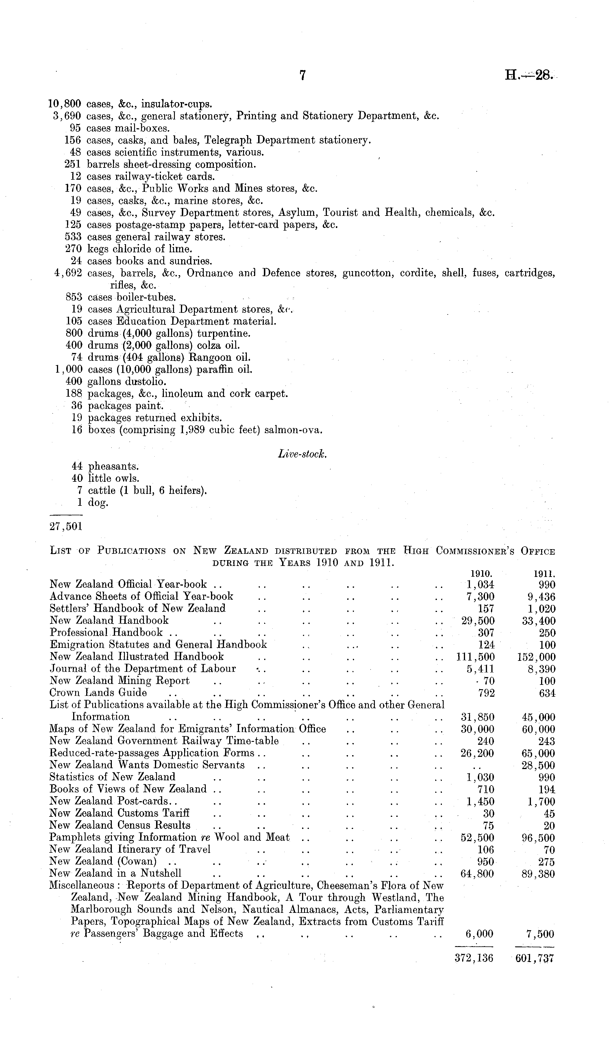 10,800 cases, &c, insulator-cups. 3,690 cases, &c, general stationery, Printing and Stationery Department, &c. 95 cases mail-boxes. 156 cases, casks, and bales, Telegraph Department stationery. 48 cases scientific instruments, various. 251 barrels sheet-dressing composition. 12 cases rail way-ticket cards. 170 cases, &c, Public Works and Mines stores, &c. 19 cases, casks, &c, marine stores, &c. 49 cases, &c, Survey Department stores, Asylum, Tourist and Health, chemicals, &c. 125 cases postage-stamp papers, letter-card papers, &c. 533 cases general railway stores. 270 kegs chloride of lime. 24 cases books and sundries. 4,692 cases, barrels, &c, Ordnance and Defence stores, guncotton, cordite, shell, fuses, cartridges, rifles, &c. 853 cases boiler-tubes. 19 cases Agricultural Department stores, &c. 105 cases Education Department material. 800 drums (4,000 gallons) turpentine. 400 drums (2,000 gallons) colza oil. 74 drums (404 gallons) Rangoon oil. 1,000 cases (10,000 gallons) paraffin oil. 400 gallons dustolio. 188 packages, &c, linoleum and cork carpet. 36 packages paint. 19 packages returned exhibits. 16 boxes (comprising 1,989 cubic feet) salmon-ova. Live-stock. 44 pheasants. 40 little owls. 7 cattle (1 bull, 6 heifers). 1 dog. 27,501 List of Publications on New Zealand distributed from the High Commissioner's Office during the years 1910 and 1911. 1910. 1911. New Zealand Official Year-book .. .. .. .. .. .. 1,034 990 Advance Sheets of Official Year-book .. .. .. .. .. 7,300 9,436 Settlers' Handbook of New Zealand .. .. .. .. .. 157 1,020 New Zealand Handbook .. .. .. .. ... .. 29,500 33,400 Professional Handbook .. .. .. .. .. . . .. 307 250 Emigration Statutes and General Handbook .. ... .. .. 124 100 New Zealand Illustrated Handbook .. .. .. .. .. 111,500 152,000 Journal of the Department of Labour •.. .. .. .. .. 5,411 8,390 New Zealand Mining Report .. ~ .. .. . . .. -70 100 Crown Lands Guide .. . . . . .. .. . . . . 792 634 List of Publications available at the High Commissioner's Office and other General Information .. .. .. '.. .. .. .. 31,850 45,000 Maps of New Zealand for Emigrants' Information Office .. . . . . 30,000 60,000 New Zealand Government Railway Time-table .. .. .. .. 240 243 Reduced-rate-passages Application Forms . . .. .. .. .. 26,200 65,000 New Zealand Wants Domestic Servants .. .. .. .. .. .. 28,500 Statistics of New Zealand .. .. .. .. .. .. 1,030 990 Books of Views of New Zealand . . .. .. . . .. .. 710 194 Now Zealand Post-cards.. .. .. .. .. .. .. 1,450 1,700 New Zealand Customs Tariff .. .. .. .. .. .. 30 45 New Zealand Census Results .. .. .. .. .. . . 75 20 Pamphlets giving Information re Wool and Meat .. .. .. .. 52,500 96,500 New Zealand Itinerary of Travel .. .. . . . . . . 106 70 New Zealand (Cowan) .. .. .. .. .. .. .. 950 275 New Zealand in a Nutshell .. .. .. .. .. ..64,800 89,380 Miscellaneous : Reports of Department of Agriculture, Cheeseman's Flora of New Zealand, New Zealand Mining Handbook, A Tour through Westland, The Marlborough Sounds and Nelson, Nautical Almanacs, Acts, Parliamentary Papers, Topographical Maps of New Zealand, Extracts from Customs Tariff re Passengers' Baggage and Effects ~ ~ .. . . .. 6,000 7,500 372,136 601,737