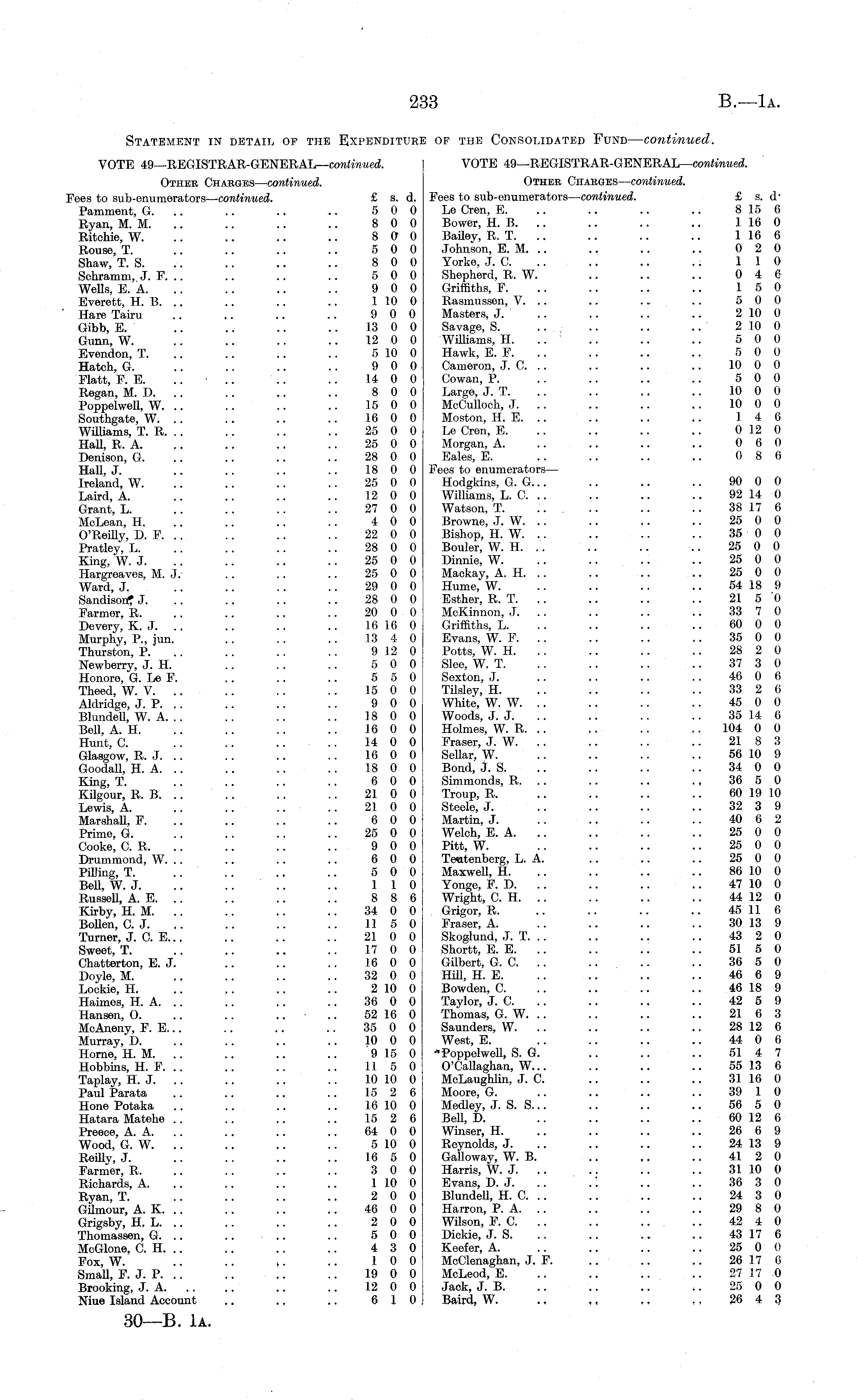 Statement in detail of the Expenditure of the Consolidated Fund — continued. VOTE 49—REGISTRAR-GENERAL— continued. VOTE 49—REGISTRAR-GENERAL— continued. Othek Charges— continued. Othek Charges— continued. Fees to sub-enumerators— continued. £ s. d. Fees to sub-enumerators — continued. £ s. d' Pamment, G. .. .. .. .. 5 0 0 Le Cren, E. .. .. .. .. 8 15 6 Ryan, M. M. .. .. .. .. 8 0 0 Bower, H. B. .. .. .. .. 116 0 Ritchie, W. .. .. .. .. 8 0 0 Bailey, R. T. .. .. .. .. 116 6 Rouse, T. .. .. .. .. 5 0 0 Johnson, E. M. .. .. .. .. 0 2 0 Shaw, T. S. .. .. .. .. 8 0 0 Yorke, J. C. .. .. .. .. 110 Schramm, J. F. .. .. .. .. 5 0 0 Shepherd, R. W. .. .. .. 0 4 6 Wells, E. A. .. .. .. .. 9 0 0 Griffiths, F. .. .. .. .. 15 0 Everett, H. B. .. .. .. .. 110 0 Rasmussen, V. .. .. ... .. 5 0 0 Hare Tairu .. .. .. .. 9 0 0 Masters, J. .. .. .. .. 210 0 Gibb, E. .. .. .. .. 13 0 0 Savage, S. .. .. .. .. 210 0 Gunn, W. .. .. .. .. 12 0 0 Williams, H. .. .. .. .. 5 0 0 Evendon, T. .. .. .. .. 510 0 Hawk, E. F. .. .. .. .. 5 0 0 Hatch, G. .. .. .. .. 9 0 0 Cameron, J. C. .. .. .. .. 10 0 0 Flatt, F. E. .. .. .. .. 14 0 0 Cowan, P. .. .. .. .. 5 0 0 Regan, M. D. .. .. .. .. 8 0 0 Large, J. T. .. .. .. .. 10 0 0 Poppelwell, W. .. .. .. .. 15 0 0 McCulloch, J. .. .. .. .. 10 0 0 Southgate, W. .. .. .. .. 16 0 0 Moston, H. E. .. .. .. .. 14 6 Williams, T. R. .. .. .. .. 25 0 0 Le Cren, E. .. .. .. .. 0 12 0 Hall, R. A. .. .. .. .. 25 0 0 Morgan, A. .. .. .. .. 0 6 0 Denison, G. .. .. .. .. 28 0 0 Eales, E. .. .. .. .. 0 8 6 Hall, J. .. .. .. .. 18 0 0 Fees to enumerators — Ireland, W. .. .. .. .. 25 0 0 Hodgkins, G. G... .. .. .. 90 0 0 Laird, A. .. .. .. .. 12 0 0 Williams, L. C. .. .. .. .. 92 14 0 Grant, L. .. .. .. .. 27 0 0 Watson, T. ... .. .. .. 38 17 6 McLean, H. .. .. .. .. 4 0 0 Browne, J. W. .. .. .. .. 25 0 0 O'Reilly, D. F. .. .. .. .. 22 0 0 Bishop, H. W. .. .. .. .. 35 0 0 Pratley, L. .. .. .. .. 28 0 0 Bouler, W. H. .. .. .. .. 25 0 0 King, W. J. .. .. .. .. 25 0 0 Dinnie, W. .. .. .. .. 25 0 0 Hargreaves, M. J. .. .. .. 25 0 0 Mackay, A. H. .. .. .. .. 25 0 0 Ward, J. .. .. .. .. 29 0 0 Hume, W. .. .. .. .. 54 18 9 Sandison? J. .. .. .. .. 28 0 0 Esther, R. T. .. .. .. .. 21 5 0 Farmer, R. .. .. .. .. 20 0 0 McKinnon, J. .. .. .. .. 33 7 0 Devery, K. J. .. .. .. .. 16 16 0 Griffiths, L. .. .. .. .. 60 0 0 Murphy, P., jun. .. .. .. 13 4 0 Evans, W. F. .. .. .. .. 35 0 0 Thurston, P. .. .. .. 912 0 Potts, W. H. .. .. .. .. 28 2 0 Newberry, J. H. .. .. .. 5 0 0 Slee, W. T. .. .. .. .. 37 3 0 Honore, G. Lβ F. .. .. .. 5 5 0 Sexton, J. .. .. .. .. 46 0 6 Theed, W. V. .. .. .. .. 15 0 0 Tilsley, H. .. .. .. .. 33 2 6 Aldridge, J. P. .. .. .. .. 9 0 0 White, W. W. .. .. .. .. 45 0 0 Blundell, W. A. .. .. .. .. 18 0 0 Woods, J. J. .. .. .. .. 35 14 0 Bell, A. H. .. .. .. .. 16 0 0 Holmes, W. R. .. .. .. .. 104 0 0 Hunt, C. .. .. .... 14 0 0 Fraser, J. W. .. .. .. .. 21 8 3 Glasgow, R. J. .. .. .. .. 16 0 0 Sellar, W. .. .. .. .. 56 10 9 Goodall, H. A. .. .. .. .. 18 0 0 Bond, J. S. .. .. .. .. 34 0 0 King, T. .. .. .. .. 6 0 0 Simmonds, R. .. .. .. ~ 36 5 0 Kilgour, R. B. .. .. .. .. 21 0 0 Troup, R. .. .. .. .. 60 19 10 Lewis, A. .. .. .. .. 21 0 0 Steele, J. .. .. .. .. 32 3 9 Marshall. F. .. .. .. .. 6 0 0 Martin, J. .. .. .. .. 40 6 2 Prime, G. .. .. .. .. 25 0 0 Welch, E. A. .. .. .. .. 25 0 0 Cooke, C. R. .. .. .. 9 0 0 Pitt, W. .. .. .. .. 25 0 0 Drummond, W. .. .. .. .. 6 0 0 Teutenberg, L. A. .. .. .. 25 0 0 Piliing, T. .. .. .. .. 5 0 0 Maxwell, H. .. .. .. .. 86 10 0 Bell, W. J. .. .. .. .. 110 Yonge, F. D. .. .. .. 47 10 0 Russell, A. E. .. .. .. .. 8 8 6 Wright, C. H. .. .. .. .. 44 12 0 Kirby, H. M. .. .. .. .. 34 0 0 Grigor, R. .. .. .. .. 45 11 6 Bollen, C. J. ~ .. .. .. 11 5 0 Fraser, A. .. .. .. .. 30 13 9 Turner, J. C. E... .. .. .. 210 0 Skoglund, J. T. .. .. .. .. 43 2 0 Sweet, T. .. .. .. .. 17 0 0 Shortt, E. E. .. .. .. .. 51 5 0 Chatterton, E. J. .. .. .. 16 0 0 Gilbert, G. C. .. .. .. .. 36 5 0 Doyle, M. .. .. .. .. 32 0 0 Hill, H. E. .. .. .. .. 46 6 9 Lockie, H. .. .. .. .. 210 0 Bowden, C. .. .. .. .. 46 18 9 Haimes, H. A. .. .. .. .. 36 0 0 Taylor, J. C. .. .. .. 42 5 9 Hansen, O. .. .. .. .. 52 16 0 Thomas, G. W. .. .. .. .. 21 6 3 McAneny, F. E... .. .. .. 35 0 0 Saunders, W. .. .. .. .. 28 12 6 Murray, D. .. .. .. .. 10 0 0 West, E. .. .. .. .. 44 0 6 Home, H. M. .. .. .. .. 915 0 'Poppelwell, S. G. .. .. .. 51 4 7 Hobbins, H. F. .. .. .. .. 11 5 0 O'Callaghan, W... .. .. .. 55 13 6 Taplay, H. J. .. .. .. .. 10 10 0 McLaughlin, J. C. .. .. .. 31 16 0 Paul Parata .. .. .. .. 15 2 6 Moore, G. .. .. .. .. 39 1 0 Hone Potaka .. .. .. .. 16 10 0 Medley, J. S. 5... .. .. .. 56 5 0 Hatara Matehe .. .. .. .. 15 2 6 Bell, D. .. .. .. .. 60 12 6 Preece, A. A. .. .. .. 64 0 0 Winser, H. .. .. .. .. 26 6 9 Wood, G. W. .. .. .. .. 5 10 0 Reynolds, J. .. .. .. .. 24 13 9 Reilly, J. .. .. .. .. 16 5 0 Galloway, W. B. .. ~ .. 41 2 0 Farmer, R. .. .. .. .. 3 0 0 Harris, W. J. .. .. .. .. 31 10 0 Richards, A. .. .. .. 110 0 Evans, D. J. .. .'. .. .. 36 3 0 Ryan, T. .. .. .. .. 2 0 0 Blundell, H. C. .. .. .. .. 24 3 0 Gilmour, A. K. .. .. .. .. 46 0 0 Harron, P. A. .. .. .. .. 29 8 0 Grigsby, H. L. .. .. .. .. 2 0 0 Wilson, F. C. .. .. 42 4 0 Thomassen, G. .. .. .. .. 5 0 0 Dickie, J. S. .. .. .. .. 43 17 6 McGlone, C. H. .. .. .. .. 4 3 0 Keefer, A. .. .. .. .. 25 0 0 Fox, W. .. .. ~ .. 10 0 McClenaghan, J. F. .. .. .. 26 17 (> Small, F. J. P. .. .. .. .. 19 0 0 McLeod, E. .. .. .. .. 27 17 0 Brooking, J. A .. .. 12 0 0 Jack, J. B. .. .. .. .. 25 0 0 Niue Island Account .. .. .. 6 10 Baird, W. .. ~ .. ~ 26 4 3