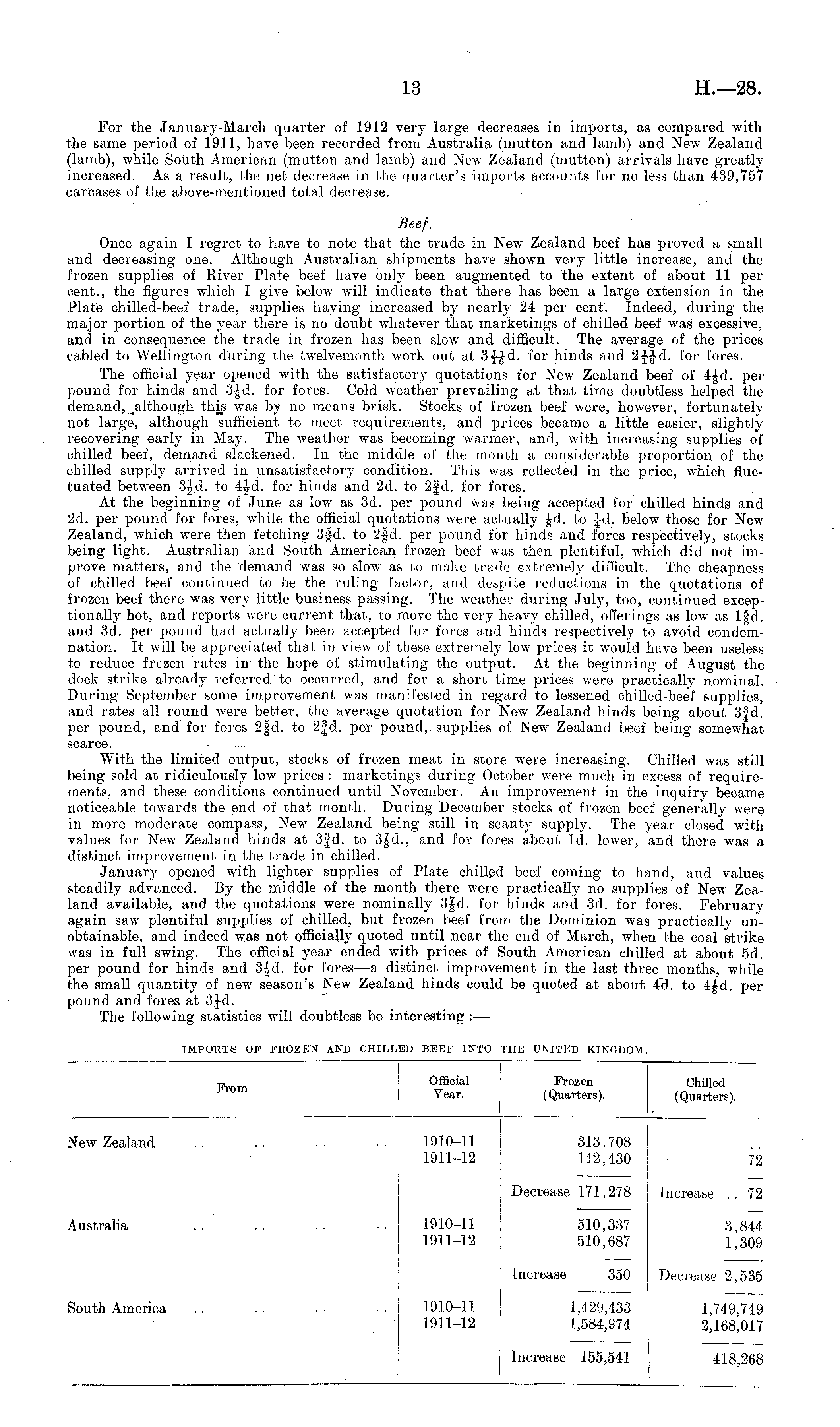 For the January-March quarter of 1912 very large decreases in imports, as compared with the same period of 1911, have been recorded from Australia (mutton and lamb) and New Zealand (lamb), while South American (mutton and lamb) and New Zealand (mutton) arrivals have greatly increased. As a result, the net decrease in the quarter's imports accounts for no less than 439,757 carcases of the above-mentioned total decrease. Beef. Once again I regret to have to note that the trade in New Zealand beef has proved a small and decreasing one. Although Australian shipments have shown very little increase, and the frozen supplies of River Plate beef have only been augmented to the extent of about 11 per cent., the figures which I give below will indicate that there has been a large extension in the Plate chilled-beef trade, supplies having increased by nearly 24 per cent. Indeed, during the major portion of the year there is no doubt whatever that marketings of chilled beef was excessive, and in consequence the trade in frozen has been slow and difficult. The average of the prices cabled to Wellington during the twelvemonth work out at for hinds and 2fjd. for fores. The official year opened with the satisfactory quotations for New Zealand beef of 4|d. per pound for hinds and 3Jd. for fores. Cold weather prevailing at that time doubtless helped the demand, this was by no means brisk. Stocks of frozen beef were, however, fortunately not large, although sufficient to meet requirements, and prices became a little easier, slightly recovering early in May. The weather was becoming warmer, and, with increasing supplies of chilled beef, demand slackened. In the middle of the month a considerable proportion of the chilled supply arrived in unsatisfactory condition. This was reflected in the price, which fluctuated between 3|d. to 4Jd. for hinds and 2d. to 2fd. for fores. At the beginning of June as low as 3d. per pound was being accepted for chilled hinds and 2d. per pound for fores, while the official quotations were actually Jd. to Jd. below those for New Zealand, which were then fetching 3|d. to 2|d. per pound for hinds and fores respectively, stocks being light. Australian and South American frozen beef was then plentiful, which did not improve matters, and the demand was so slow as to make trade extremely difficult. The cheapness of chilled beef continued to be the ruling factor, and despite reductions in the quotations of frozen beef there was very little business passing. The weather during July, too, continued exceptionally hot, and reports were current that, to move the very heavy chilled, offerings as low as l|d. and 3d. per pound had actually been accepted for fores and hinds respectively to avoid condemnation. It will be appreciated that in view of these extremely low prices it would have been useless to reduce frezen rates in the hope of stimulating the output. At the beginning of August the dock strike already referred to occurred, and for a short time prices were practically nominal. During September some improvement was manifested in regard to lessened chilled-beef supplies, and rates all round were better, the average quotation for New Zealand hinds being about 3|d. per pound, and for fores 2|d. to 2fd. per pound, supplies of New Zealand beef being somewhat scarce. With the limited output, stocks of frozen meat in store were increasing. Chilled was still being sold at ridiculously low prices : marketings during October were much in excess of requirements, and these conditions continued until November. An improvement in the inquiry became noticeable towards the end of that month. During December stocks of frozen beef generally were in more moderate compass, New Zealand being still in scanty supply. The year closed with values for New Zealand hinds at 3fd. to 3|d., and for fores about id. lower, and there was a distinct improvement in the trade in chilled. January opened with lighter supplies of Plate chilled beef coming to hand, and values steadily advanced. By the middle of the month there were practically no supplies of New Zealand available, and the quotations were nominally 3|d. for hinds and 3d. for fores. February again saw plentiful supplies of chilled, but frozen beef from the Dominion was practically unobtainable, and indeed was not officially quoted until near the end of March, when the coal strike was in full swing. The official year ended with prices of South American chilled at about sd. per pound for hinds and 3|d. for fores —a distinct improvement in the last three months, while the small quantity of new season's New Zealand hinds could be quoted at about 4d. to per pound and fores at 3|d. The following statistics will doubtless be interesting :—