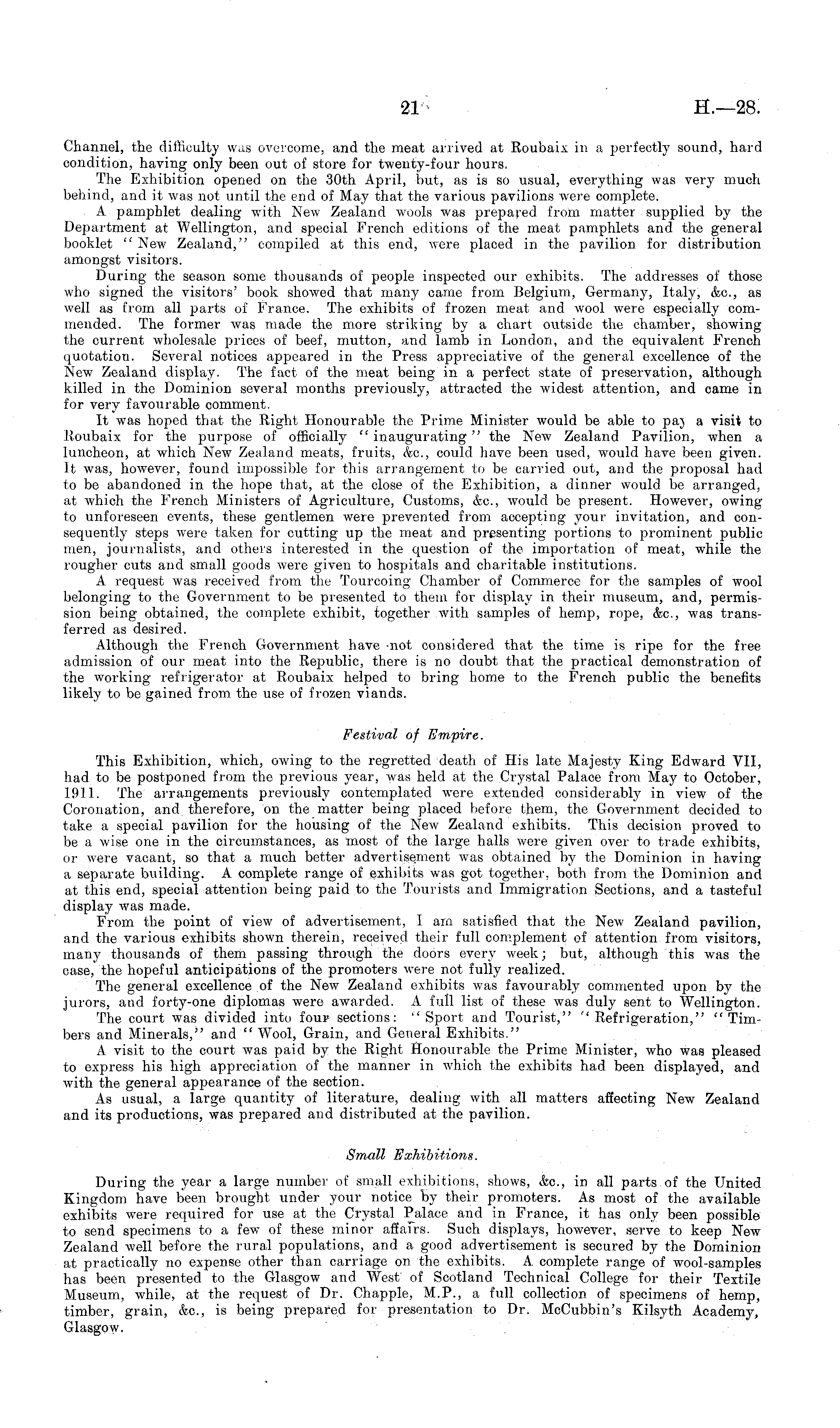 Channel, the difficulty was overcome, and the meat arrived at Roubaix in a perfectly sound, hard condition, having only been out of store for twenty-four hours. The Exhibition opened on the 30th April, but, as is so usual, everything was very much behind, and it was not until the end of May that the various pavilions were complete. A pamphlet dealing with New Zealand wools was prepared from matter supplied by the Department at Wellington, and special French editions of the meat pamphlets and the general booklet " New Zealand," compiled at this end, were placed in the pavilion for distribution amongst visitors. During the season some thousands of people inspected our exhibits. The addresses of those who signed the visitors' book showed that many came from Belgium, Germany, Italy, &c, as well as from all parts of France. The exhibits of frozen meat and wool were especially commended. The former was made the more striking by a chart outside the chamber, showing the current wholesale prices of beef, mutton, and lamb in London, and the equivalent French quotation. Several notices appeared in the Press appreciative of the general excellence of the New Zealand display. The fact of the meat being in a perfect state of preservation, although killed in the Dominion several months previously, attracted the widest attention, and came in for very favourable comment. It was hoped that the Right Honourable the Prime Minister would be able to paj a visit to Roubaix for the purpose of officially " inaugurating" the New Zealand Pavilion, when a luncheon, at which New Zealand meats, fruits, &c, could have been used, would have been given. It was, however, found impossible for this arrangement to be carried out, and the proposal had to be abandoned in the hope that, at the close of the Exhibition, a dinner would be arranged, at which the French Ministers of Agriculture, Customs, &c, would be present. However, owing to unforeseen events, these gentlemen were prevented from accepting your invitation, and consequently steps were taken for cutting up the meat and presenting portions to prominent public men, journalists, and others interested in the question of the importation of meat, while the rougher cuts and small goods were given to hospitals and charitable institutions. A request was received from the Tourcoing Chamber of Commerce for the samples of wool belonging to the Government to be presented to them for display in their museum, and, permission being obtained, the complete exhibit, together with samples of hemp, rope, &c, was transferred as desired. Although the French Government have -not considered that the time is ripe for the free admission of our meat into the Republic, there is no doubt that the practical demonstration of the working refrigerator at Roubaix helped to bring home to the French public the benefits likely to be gained from the use of frozen viands. Festival of Empire. This Exhibition, which, owing to the regretted death of His late Majesty King Edward VII, had to be postponed from the previous year, was held at the Crystal Palace from May to October, 1911. The arrangements previously contemplated were extended considerably in view of the Coronation, and therefore, on the matter being placed before them, the Government decided to take a special pavilion for the housing of the New Zealand exhibits. This decision proved to be a wise one in the circumstances, as most of the large halls were given over to trade exhibits, or were vacant, so that a much better advertisement was obtained by the Dominion in having a separate building. A complete range of exhibits was got together, both from the Dominion and at this end, special attention being paid to the Tourists and Immigration Sections, and a tasteful display was made. From the point of view of advertisement, I am satisfied that the New Zealand pavilion, and the various exhibits shown therein, received their full complement of attention from visitors, many thousands of them passing through the doors every week; but, although this was the case, the hopeful anticipations of the promoters were not fully realized. The general excellence of the New Zealand exhibits was favourably commented upon by the jurors, and forty-one diplomas were awarded. A full list of these was duly sent to Wellington. The court was divided into four sections: "Sport and Tourist," "Refrigeration," "Timbers and Minerals," and " Wool, Grain, and General Exhibits." A visit to the court was paid by the Right Honourable the Prime Minister, who was pleased to express his high appreciation of the manner in which the exhibits had been displayed, and with the general appearance of the section. As usual, a large quantity of literature, dealing with all matters affecting New Zealand and its productions, was prepared and distributed at the pavilion. Small Exhibitions. During the year a large number of small exhibitions, shows, &c, in all parts of the United Kingdom have been brought under your notice by their promoters. As most of the available exhibits were required for use at the Crystal Palace and in France, it has only been possible to send specimens to a few of these minor affairs. Such displays, however, serve to keep New Zealand well before the rural populations, and a good advertisement is secured by the Dominion at practically no expense other than carriage on the exhibits. A. complete range of wool-samples has been presented to the Glasgow and West of Scotland Technical College for their Textile Museum, while, at the request of Dr. Chappie, M.P., a full collection of specimens of hemp, timber, grain, &c, is being prepared for presentation to Dr. McCubbin's Kilsyth Academy, Glasgow.