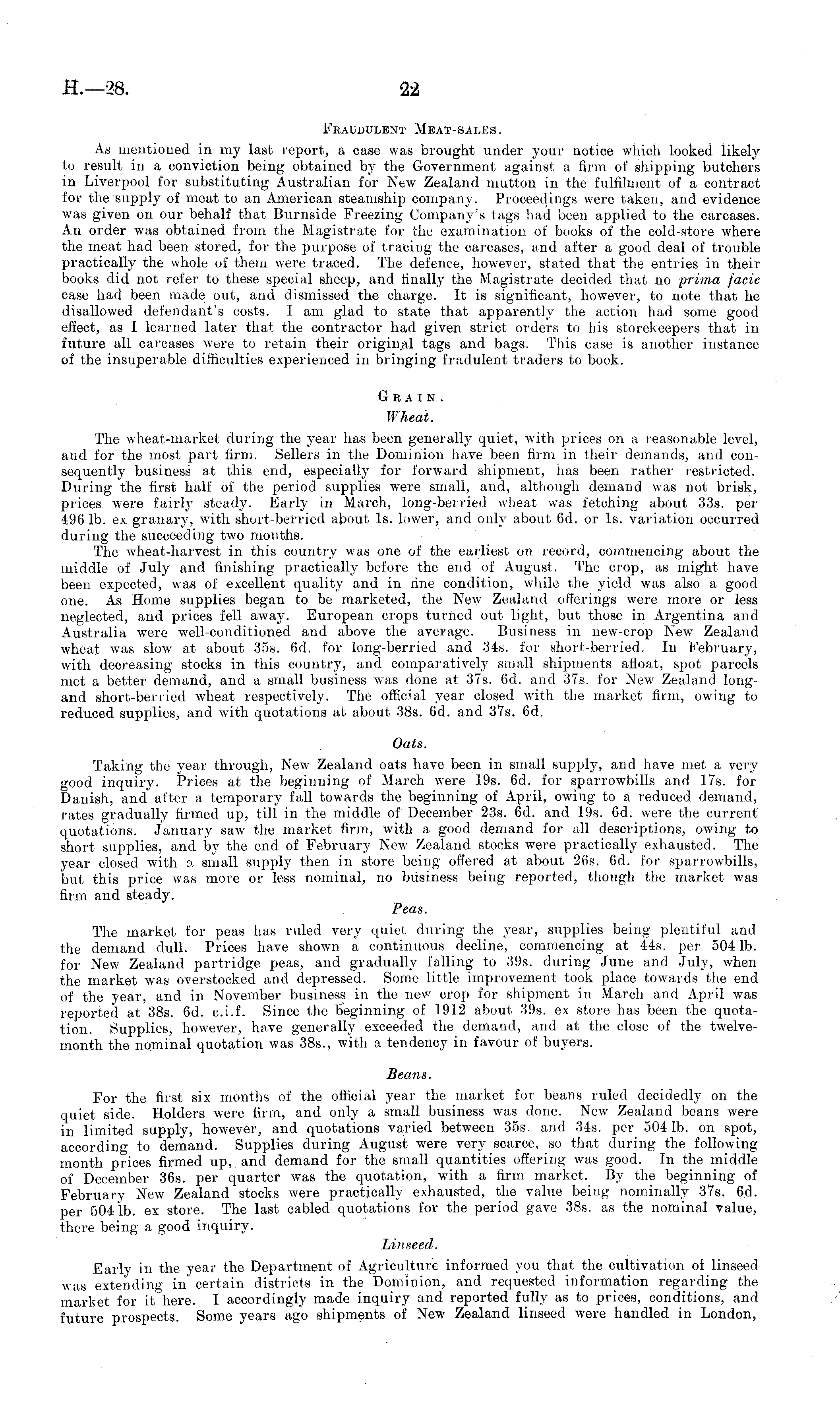 Fraudulent Meat-sales. As mentioned in my last report, a case was brought under your notice which looked likely to result in a conviction being obtained by the Government against a firm of shipping butchers in Liverpool for substituting Australian for New Zealand mutton in the fulfilment of a contract for the supply of meat to an American steamship company. Proceedings were taken, and evidence was given on our behalf that Burnside Freezing Company's tags had been applied to the carcases. An order was obtained from the Magistrate for the examination of books of the cold-store where the meat had been stored, for the purpose of tracing the carcases, and after a good deal of trouble practically the whole of them were traced. The defence, however, stated that the entries in their books did not refer to these special sheep, and finally the Magistrate decided that no prima facie case had been made out, and dismissed the charge. It is significant, however, to note that he disallowed defendant's costs. I am glad to state that apparently the action had some good effect, as I learned later that the contractor had given strict orders to his storekeepers that in future all carcases were to retain their original tags and bags. This case is another instance of the insuperable difficulties experienced in bringing fradulent traders to book. Grain. Wheat. The wheat-market during the year has been generally quiet, with prices on a reasonable level, and for the most part firm. Sellers in the Dominion have been firm in their demands, and consequently business at this end, especially for forward shipment, has been rather restricted. During the first half of the period supplies were small, and, although demand was not brisk, prices were fairly steady. Early in March, long-berried wheat was fetching about 335. per 496 lb. ex granary, with short-berried about Is. lower, and only about 6d. or Is. variation occurred during the succeeding two months. The wheat-harvest in this country was one of the earliest on record, commencing about the middle of July and finishing practically before the end of August. The crop, as might have been expected, was of excellent quality' and in line condition, while the yield was also a good one. As Home supplies began to be marketed, the New Zealand offerings were more or less neglected, and prices fell away. European crops turned out light, but those in Argentina and Australia were well-conditioned and above the average. Business in new-crop New Zealand wheat was slow at about 355. 6d. for long-berried and 345. for short-berried. In February, with decreasing stocks in this country, and comparatively small shipments afloat, spot parcels met a better demand, and a small business was done at 375. 6d. and 375. for New Zealand longand short-berried wheat respectively. The official year closed with the market firm, owing to reduced supplies, and with quotations at about 38s. 6d. and 375. 6d. Oats. Taking the year through, New Zealand oats have been in small supply, and have met a very good inquiry. Prices at the beginning of March were 19s. 6d. for sparrowbills and 17s. for Danish, and after a temporary fall towards the beginning of April, owing to a reduced demand, rates gradually firmed up, till in the middle of December 235. 6d. and 19s. 6d. were the current quotations. January saw the market firm, with a good demand for all descriptions, owing to short supplies, and by the end of February New Zealand stocks were practically exhausted. The year closed with a small supply then in store being offered at about 265. 6d. for sparrowbills, but this price was more or less nominal, no business being reported, though the market was firm and steady. Peas. The market for peas has ruled very quiet during the year, supplies being plentiful and the demand dull. Prices have shown a continuous decline, commencing at 445. per 504 lb. for New Zealand partridge peas, and gradually falling to 395. during June and July, when the market was overstocked and depressed. Some little improvement took place towards the end of the year, and in November business in the new crop for shipment in March and April was reported at 38s. 6d. c.i.f. Since the beginning of 1912 about 395. ex store has been the quotation. Supplies, however, have generally exceeded the demand, and at the close of the twelvemonth the nominal quotation was 385., with a tendency in favour of buyers. Beans. For the first six months of the official year the market for beans ruled decidedly on the quiet side. Holders were firm, and only a small business was done. New Zealand beans were in limited supply, however, and quotations varied between 355. and 345. per 504 lb. on spot, according to demand. Supplies during August were very scarce, so that during the followingmonth prices firmed up, and demand for the small quantities offering was good. In the middle of December 365. per quarter was the quotation, with a firm market. By the beginning of February New Zealand stocks were practically exhausted, the value being nominally 375. 6d. per 5041b. ex store. The last cabled quotations for the period gave 38s. as the nominal value, there being a good inquiry. Linseed. Early in the year the Department of Agriculture informed you that the cultivation of linseed was extending in certain districts in the Dominion, and requested information regarding the market for it here. I accordingly made inquiry and reported fully as to prices, conditions, and future prospects. Some years ago shipments of New Zealand linseed were handled in London,