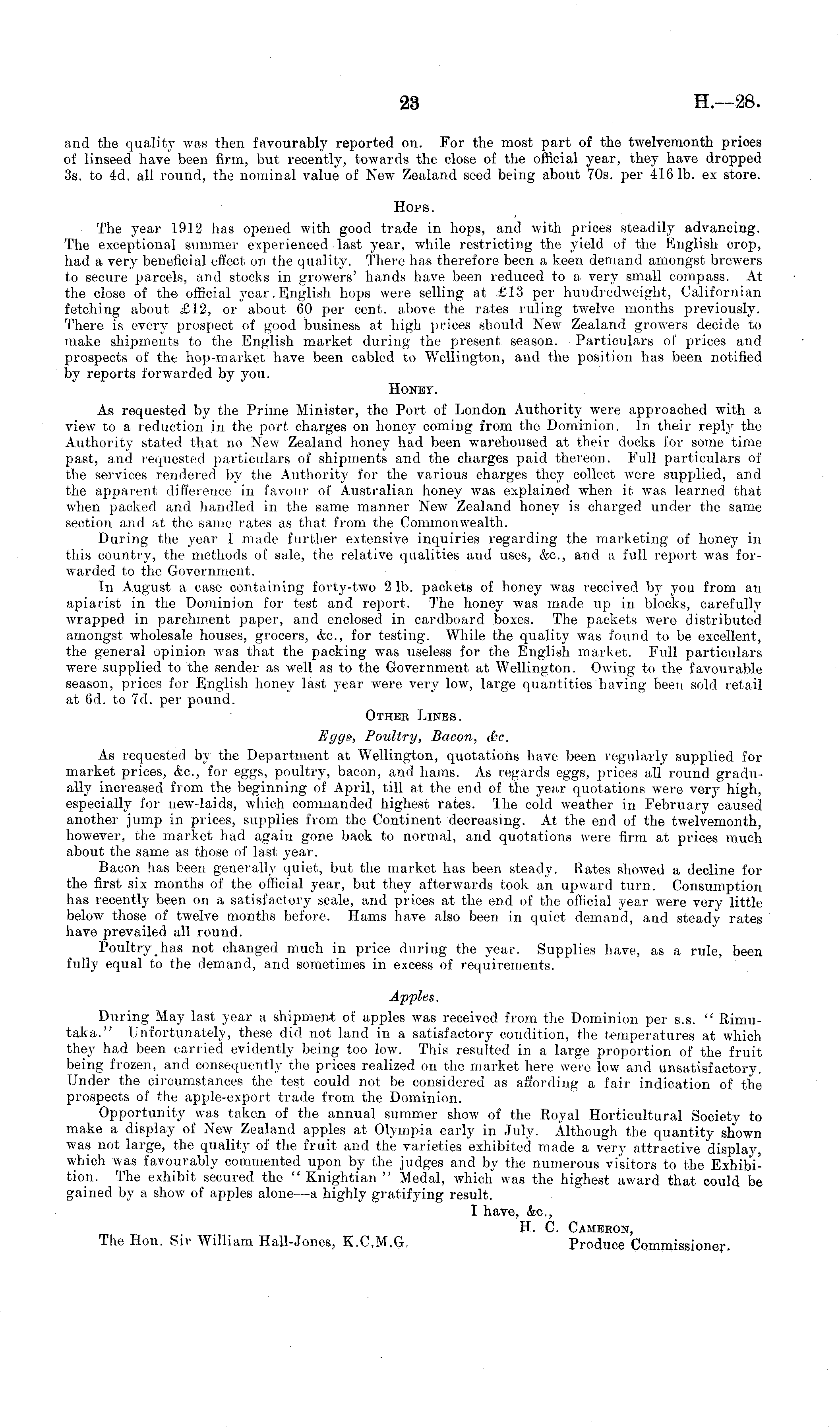 and the quality was then favourably reported on. For the most part of the twelvemonth prices of linseed have been firm, but recently, towards the close of the official year, they have dropped 3s. to 4d. all round, the nominal value of New Zealand seed being about 70s. per 416 lb. ex store. Hops. The year 1912 has opened with good trade in hops, and with prices steadily advancing. The exceptional summer experienced last year, while restricting the yield of the English crop, had a very beneficial effect on the quality. There has therefore been a keen demand amongst brewers to secure parcels, and stocks in growers' hands have been reduced to a very small compass. At the close of the official year. English hops were selling at £13 per hundredweight, Californian fetching about £12, or about 60 per cent, above the rates ruling twelve months previously. There is every prospect of good business at high prices should New Zealand growers decide to make shipments to the English market during the present season. Particulars of prices and prospects of the hop-market have been cabled to Wellington, and the position has been notified by reports forwarded by you. HONEY. As requested by the Prime Minister, the Port of London Authority were approached with a view to a reduction in the port charges on honey coming from the Dominion. In their reply the Authority stated that no New Zealand honey had been warehoused at their docks for some time past, and requested particulars of shipments and the charges paid thereon. Full particulars of the services rendered by the Authority for the various charges thej' collect were supplied, and the apparent difference in favour of Australian honey was explained when it was learned that when packed and handled in the same manner New Zealand honey is charged under the same section and at the same rates as that from the Commonwealth. During the I made further extensive inquiries regarding the marketing of honey in this country, the methods of sale, the relative qualities and uses, &c, and a full report was forwarded to the Government. In August a case containing forty-two 2 lb. packets of honey was received by you from an apiarist in the Dominion for test and report. The honey was made up in blocks, carefully wrapped in parchment paper, and enclosed in cardboard boxes. The packets were distributed amongst wholesale houses, grocers, &c, for testing. While the quality was found to be excellent, the general opinion was that the packing was useless for the English market. Full particulars were supplied to the sender as well as to the Government at Wellington. Owing to the favourable season, prices for English honey last year were veiy low, large quantities having been sold retail at 6d. to 7d. per pound. Other Lines. Eggs, Poultry, Bacon, &c. As requested by the Department at Wellington, quotations have been regularly supplied for market prices, &c, for eggs, poultry, bacon, and hams. As regards eggs, prices all round gradually increased from the beginning of April, till at the end of the year quotations were very high, especially for new-laids, which commanded highest rates. The cold weather in February caused another jump in prices, supplies from the Continent decreasing. At the end of the twelvemonth, however, the market had again gone back to normal, and quotations were firm at prices much about the same as those of last year. Bacon has been generally quiet, but the market has been steady. Rates showed a decline for the first six months of the official year, but they afterwards took an upward turn. Consumption has recently been on a satisfactory scale, and prices at the end of the official year were very little below those of twelve months before. Hams have also been in quiet demand, and steady rates have prevailed all round. Poultryhas not changed much in price during the year. Supplies have, as a rule, been fully equal to the demand, and sometimes in excess of requirements. Apples. During May last year a shipment of apples was received from the Dominion per- s.s. " Rimutaka." Unfortunately, these did not land in a satisfactory condition, the temperatures at which they had been carried evidently being too low. This resulted in a large proportion of the fruit being frozen, and consequently the prices realized on the market here were low and unsatisfactory. Under the circumstances the test could not be considered as affording a fair indication of the prospects of the apple-export trade from the Dominion. Opportunity was taken of the annual summer show of the Royal Horticultural Society to make a display of New Zealand apples at Olympia early in July. Although the quantity shown was not large, the quality of the fruit and the varieties exhibited made a very attractive display, which was favourably commented upon by the judges and by the numerous visitors to the Exhibition. The exhibit secured the " Knightian " Medal, which was the highest award that could be gained by a show of apples alone —a highly gratifying result. I have, &c, H, C. Cameron, The Hon. Sir William Hall-Jones, K.C.M.G, Produce Commissioner.