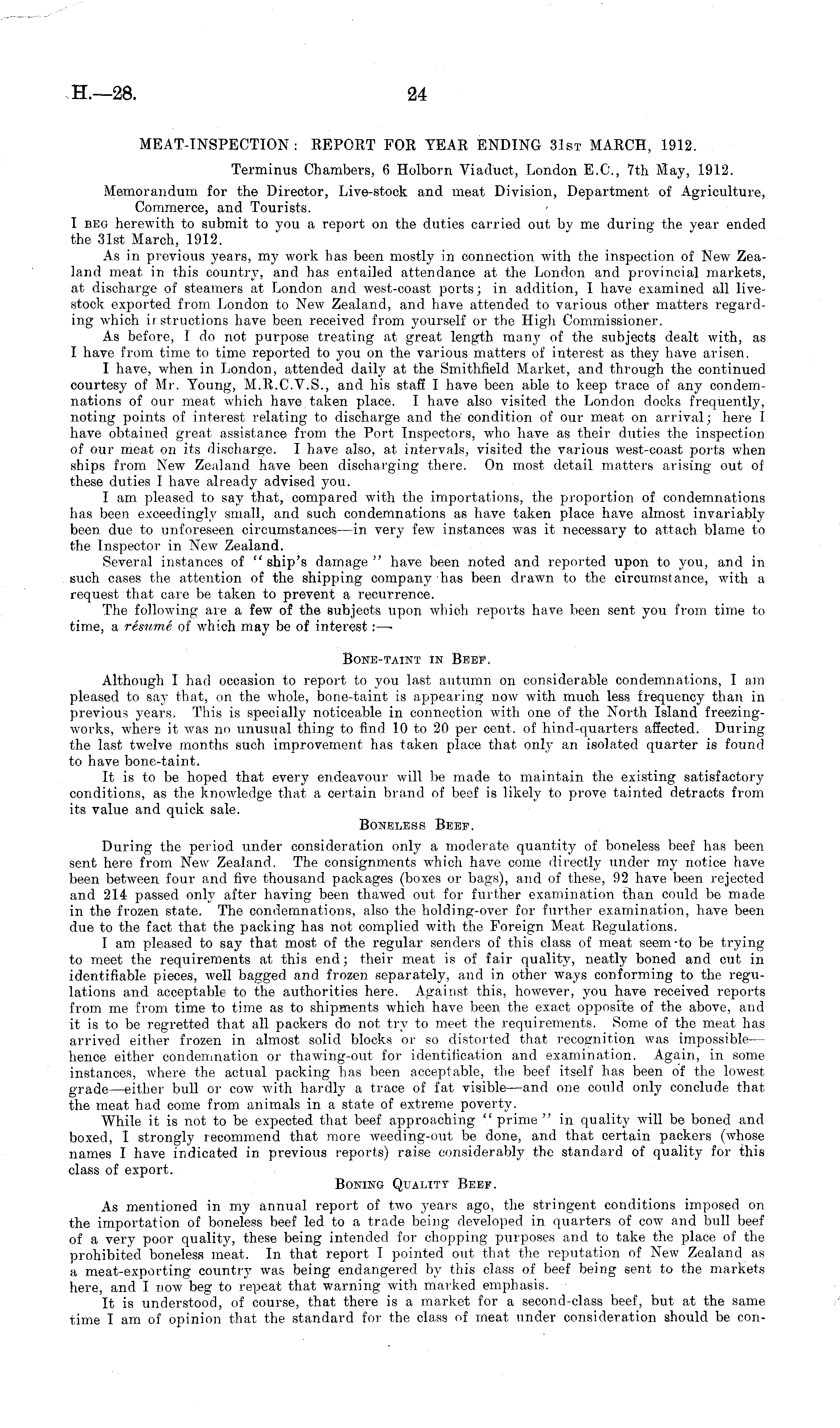 MEAT-INSPECTION : REPORT FOR YEAR ENDING 31st MARCH, 1912. Terminus Chambers, 6 Holborn Viaduct, London E.G., 7th May, 1912. Memorandum for the Director, Live-stock and meat Division, Department of Agriculture, Commerce, and Tourists. I beg herewith to submit to you a report on the duties carried out by me during the year ended the 31st March, 1912. As in previous years, my work has been mostly in connection with the inspection of New Zealand meat in this country, and has entailed attendance at the London and provincial markets, at discharge of steamers at London and west-coast ports; in addition, I have examined all livestock exported from London to New Zealand, and have attended to various other matters regarding which instructions have been received from yourself or the High Commissioner. As before, I do not purpose treating at great length many of the subjects dealt with, as I have from time to time reported to you on the various matters of interest as they have arisen. I have, when in London, attended daily at the Smithfield Market, and through the continued courtesy of Mr. Young, M.R.C.V.S., and his staff I have been able to keep trace of any condemnations of our meat which have taken place. I have also visited the London docks frequently, noting points of interest relating to discharge and the condition of our meat on arrival; here I have obtained great assistance from the Port Inspectors, who have as their duties the inspection of our meat on its discharge. I have also, at intervals, visited the various west-coast ports when ships from New Zealand have been discharging there. On most detail matters arising out of these duties I have already advised you. I am pleased to say that, compared with the importations, the proportion of condemnations has been exceedingly small, and such condemnations as have taken place have almost invariably been due to unforeseen circumstances —in very few instances was it necessary to attach blame to the Inspector in New Zealand. Several instances of " ship's damage " have been noted and reported upon to you, and in such cases the attention of the shipping company has been drawn to the circumstance, with a request that care be taken to prevent a recurrence. The following are a few of the subjects upon which reports have been sent you from time to time, a resume of which may be of interest: —■ BONE-TAINT IN BEEF. Although I had occasion to report to you last autumn on considerable condemnations, I am pleased to say that, on the whole, bone-taint is appearing now with much less frequency than in previous years. This is specially noticeable in connection with one of the North Island freezingworks, where it was no unusual thing to find 10 to 20 per cent, of hind-quarters affected. During the last twelve months such improvement has taken place that only an isolated quarter is found to have bone-taint. It is to be hoped that every endeavour will be made to maintain the existing satisfactory conditions, as the knowledge that a certain brand of beef is likely to prove tainted detracts from its value and quick sale. Boneless Beef. During the period under consideration only a moderate quantity of boneless beef has been sent here from New Zealand. The consignments which have come directly under my notice have been between four and five thousand packages (boxes or bags), and of these, 92 have been rejected and 214 passed only after having been thawed out for further examination than could be made in the frozen state. The condemnations, also the holding-over for further examination, have been due to the fact that the packing has not complied with the Foreign Meat Regulations. lam pleased to say that most of the regular senders of this class of meat seem-to be trying to meet the requirements at this end; their meat is of fair quality, neatly boned and cut in identifiable pieces, well bagged and frozen separately, and in other ways conforming to the regulations and acceptable to the authorities here. Against this, however, you have received reports from me from time to time as to shipments which have been the exact opposite of the above, and it is to be regretted that all packers do not try to meet the requirements. Some of the meat has arrived either frozen in almost solid blocks or so distorted that recognition was impossibk— hence either condemnation or thawing-out for identification and examination. Again, in some instances, where the actual packing has been acceptable, the beef itself has been of the lowest grade —either bull or cow with hardly a trace of fat visible —and one could only conclude that the meat had come from animals in a state of extreme poverty. While it is not to be expected that beef approaching " prime " in quality will be boned and boxed, I strongly recommend that more weeding-out be done, and that certain packers (whose names I have indicated in previous reports) raise considerably the standard of quality for this class of export. Boning Quality Beef. As mentioned in my annual report of two years ago, the stringent conditions imposed on the importation of boneless beef led to a trade being developed in quarters of cow and bull beef of a very poor quality, these being intended for chopping purposes and to take the place of the prohibited boneless meat. In that report I pointed out that the reputation of New Zealand as a meat-exporting country was being endangered by this class of beef being sent to the markets here, and I now beg to repeat that warning with marked emphasis. It is understood, of course, that there is a market for a second-class beef, but at the same time I am of opinion that the standard for- the class of meat under consideration should be con-