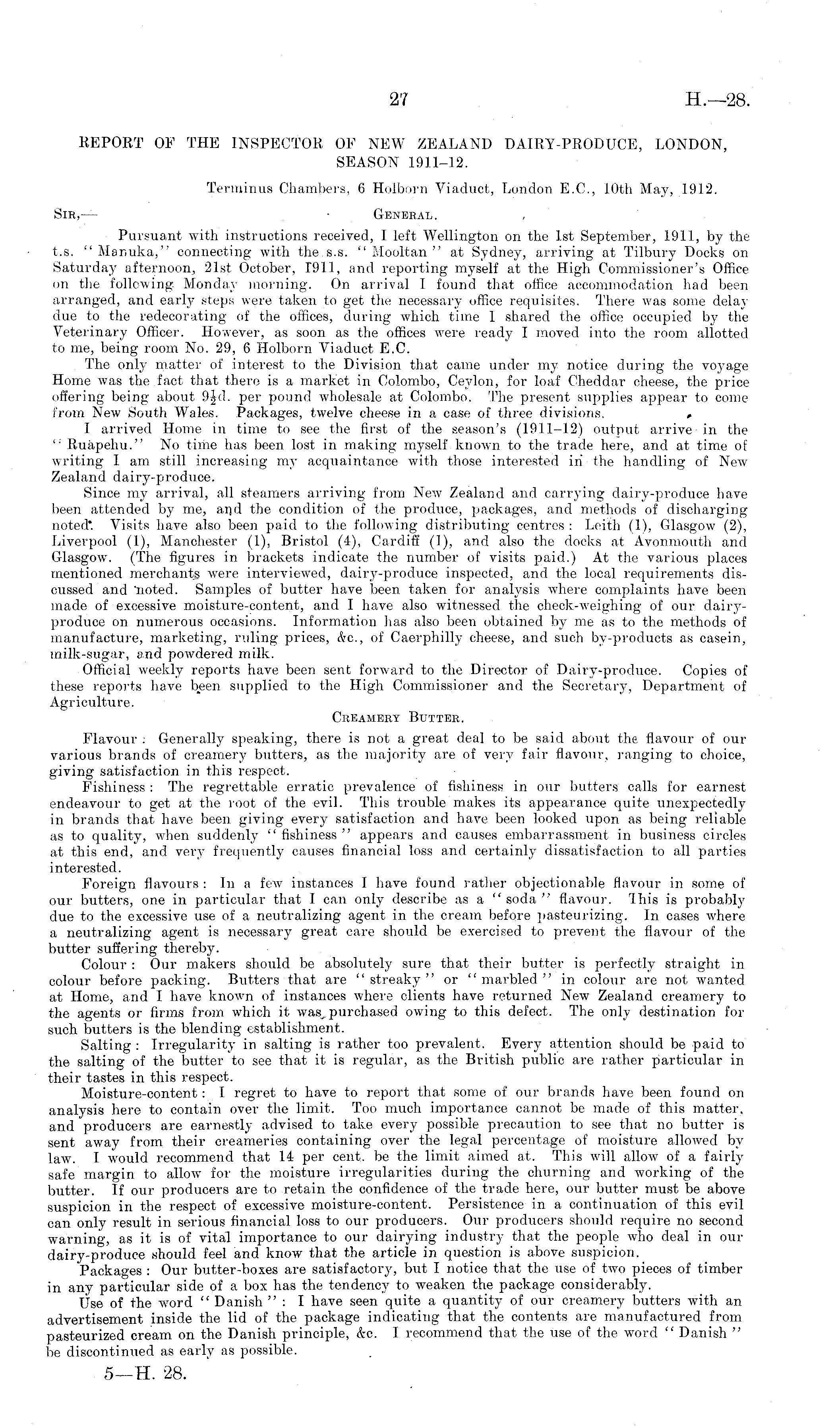 REPORT OF THE INSPECTOR OF NEW ZEALAND DAIRY-PRODUCE, LONDON, SEASON 1911-12. Terminus Chambers, 6 Holborn Viaduct, London E.G., 10th May, 1912. Sir, — General. Pursuant with instructions received, I left Wellington on the Ist September, 1911, by the t.s. "Manuka," connecting with the s.s. " Mooltan " at Sydney, arriving at Tilbury Docks on Saturday afternoon, 21st October, 1911, and reporting myself at the High Commissioner's Office on the following Monday morning. On arrival I found that office accommodation had been arranged, and early steps were taken to get the necessary office requisites. There was some delay due to the redecorating of the offices, during which time 1 shared the office occupied by the Veterinary Officer. However, as soon as the offices were ready I moved into the room allotted to me, being room No. 29, 6 Holborn Viaduct E.C. The only matter of interest to the Division that came under my notice during the voyage Home was the; fact that there is a market in Colombo, Ceylon, for loaf Cheddar cheese, the price offering being about 9Jd. per pound wholesale at Colombo. The present supplies appear to come from New South Wales. Packages, twelve cheese in a case of three divisions. , I arrived Home in time to see the first of the season's (1911-12) output arrive in the " Ruapehu." No time has been lost in making myself known to the trade here, and at time of writing I am still increasing my acquaintance with those interested in the handling of New Zealand dairy-produce. Since my arrival, all steamers arriving from New Zealand and carrying dairy-produce have been attended by me, and the condition of the produce, packages, and methods of discharging noted*. Visits have also been paid to the following distributing centres : Leith (I), Glasgow (2), Liverpool (1), Manchester (1), Bristol (4), Cardiff (1), and also the docks at Avonmouth and Glasgow. (The figures in brackets indicate the number of visits paid.) At the various places mentioned merchants were interviewed, dairy-produce inspected, and the local requirements discussed and 'noted. Samples of butter have been taken for analysis where complaints have been made of excessive moisture-content, and I have also witnessed the check-weighing of our dairj'produce on numerous occasions. Information lias also been obtained by me as to the methods of manufacture, marketing, ruling prices, &c, of Caerphilly cheese, and such by-products as casein, milk-sugar, and powdered milk. Official weekly reports have been sent forward to the Director of Dairy-produce. Copies of these reports have been supplied to the High Commissioner and the Secretary, Department of Agriculture. Creamery Butter. Flavour : Generally speaking, there is not a great deal to be said about the flavour of our various brands of creamery butters, as the majority are of very fair flavour, ranging to choice, giving satisfaction in this respect. Fishiness : The regrettable erratic prevalence of fishiness in our butters calls for earnest endeavour to get at the root of the evil. This trouble makes its appearance quite unexpectedly in brands that have been giving every satisfaction and have been looked upon as being reliable as to quality, when suddenly " fishiness " appears and causes embarrassment in business circles at this end, and very frequently causes financial loss and certainly dissatisfaction to all parlies interested. Foreign flavours : In a few instances I have found rather objectionable flavour in some of our butters, one in particular that I can only describe as a " soda " flavour. This is probably due to the excessive use of a neutralizing agent in the cream before pasteurizing. In cases where a neutralizing agent is necessary great care should be exercised to prevent the flavour of the butter suffering thereby. Colour : Our makers should be absolutely sure that their butter is perfectly straight in colour before packing. Butters that are "streaky" or "marbled" in colour are not wanted at Home, and I have known of instances where clients have returned New Zealand creamery to the agents or firms from which it was purchased owing to this defect. The only destination for such butters is the blending establishment. Salting : Irregularity in salting is rather too prevalent. Every attention should be paid to the salting of the butter to see that it is regular, as the British public are rather particular in their tastes in this respect. Moisture-content : I regret to have to report that some of our brands have been found on analysis here to contain over the limit. Too much importance cannot be made of this matter, and producers are earnestly advised to take every possible precaution to see that no butter is sent away from their creameries containing over the legal percentage of moisture allowed by law. I would recommend that 14 per cent, be the limit aimed at. This will allow of a fairly safe margin to allow for the moisture irregularities during the churning and working of the butter. If our producers are to retain the confidence of the trade here, our butter must be above suspicion, in the respect of excessive moisture-content. Persistence in a continuation of this evil can only result in serious financial loss to our producers. Our producers should require no second warning, as it is of vital importance to our dairying industr}' that the people who deal in our dairy-produce should feel and know that the article in question is above suspicion. Packages : Our butter-boxes are satisfactory, but I notice that the use of two pieces of timber in any particular side of a box has the tendency to weaken the package considerably. Use of the word " Danish " : I have seen quite a quantity of our creamery butters with an advertisement inside the lid of the package indicating that the contents are manufactured from pasteurized cream on the Danish principle, &c. I recommend that the use of the word " Danish " be discontinued as early as possible.