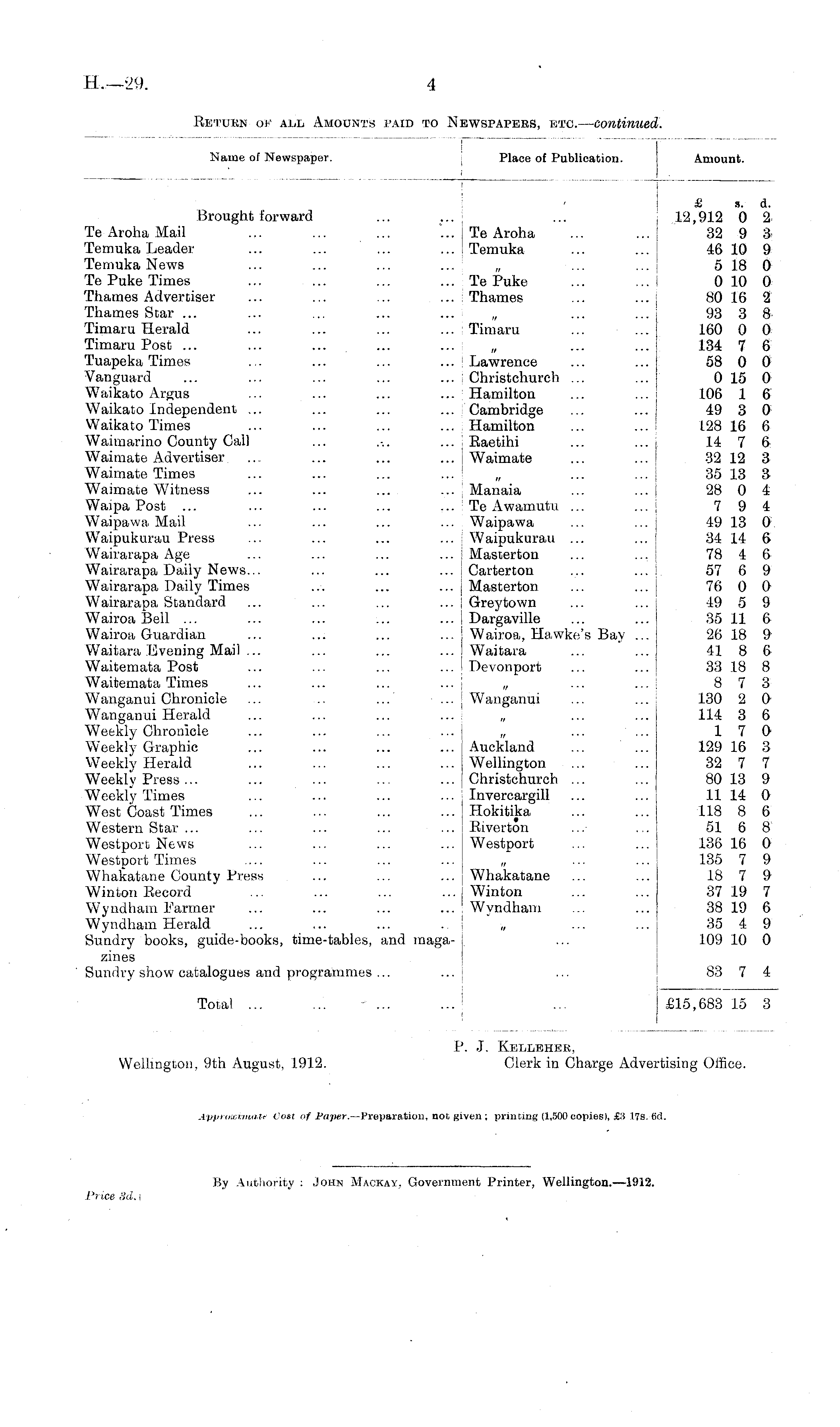 P. J. Kellehek, Wellington, 9th August, 1912. Clerk in Charge Advertising Office. Approximate Cost of Paper. —Preparation, not given ; printing {1,500 copies), £:i 17s. 66.