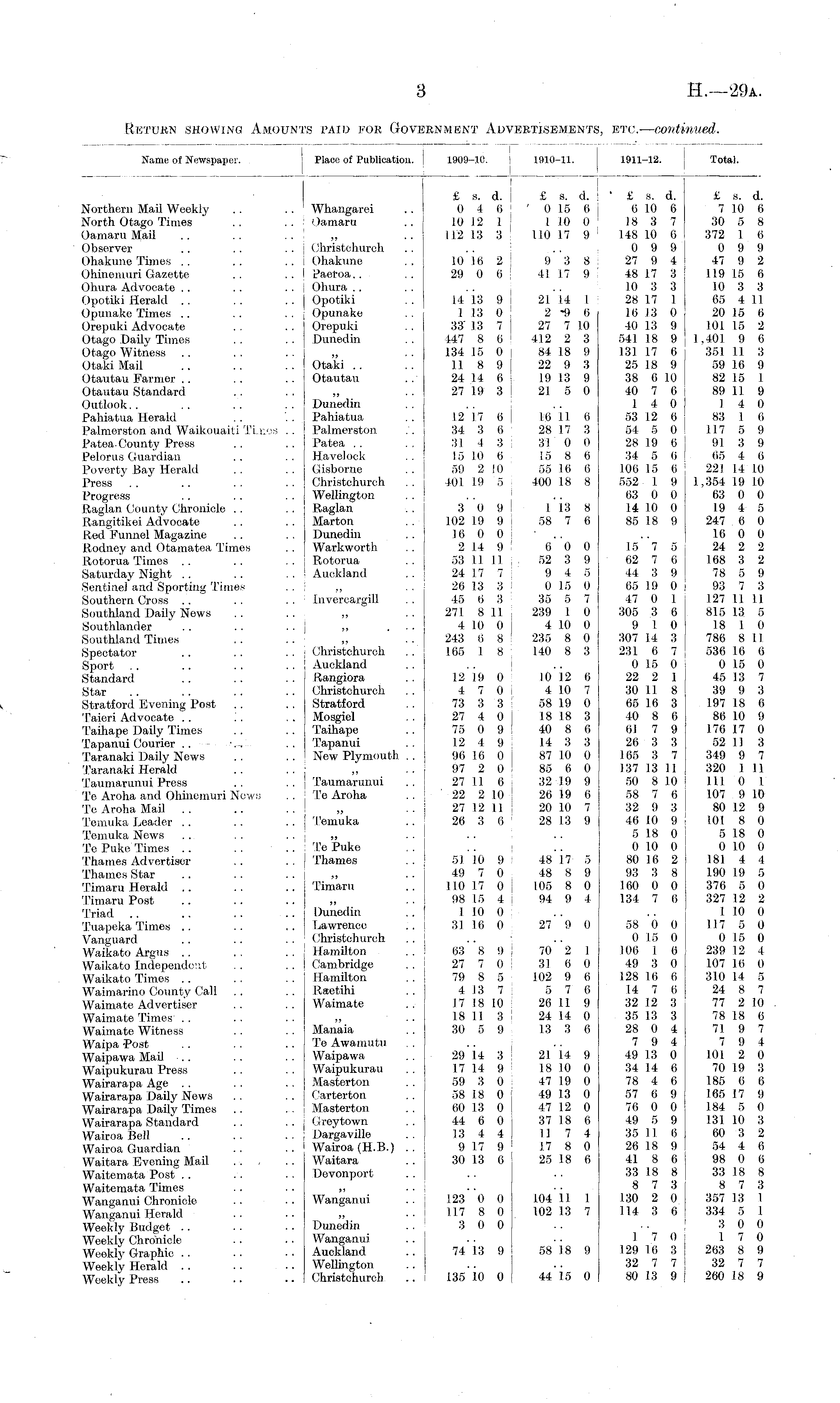 Name of Newspaper. Place of Publication. 1909-10. 1910-11. 1911-12. Total. Northern Mail Weekly North Otago Times Oamaru Mail Observer Ohakune Times Ohinenuiri Gazette Ohura Advocate .. Opotiki Herald Opunako Times Orepuki Advocate Otago Daily Times Otago Witness Otaki Mail Otautau Farmer Otautan Standard Outlook .. Pahiatua Herald Palmerston and Waikouaiti Ti i oa . . Patea County Press Pelorns Guardian Poverty Bay Herald Press Progress Raglan County Chronicle Hangitikei Advocate Red Funnel Magazine Rodney and Otamatea Times Rotorua Times Saturday Night Sentinel and Sporting Times Southern Cross Southland Daily News Southlander Southland Times Spectator Sport Standard Star Stratford Evening Post Taieri Advocate .. '.. Taihape Daily Times Tapanui Courier Taranaki Daily News Taranaki Herald Taumarunui Press Te Aroha and Ohinemuri News Te Aroha Mail Temuka Leader Tomuka News Te Puke Times Thames Advertiser Thames Star Timaru Herald Timaru Post Triad Tuapeka Times Vanguard Waikato Argus .. Waikato Independent Waikato Times Waimarino County Call Wainiate Advertiser Waimate Times Waimate Witness Waipa Post Waipawa Mail Waipukurau Press Wairarapa Age .. Wairarapa Daily News Wairarapa Daily Times Wairarapa Standard Wairoa Sell Wairoa Guardian Waitara Evening Mail Waitemata Post Waitemata Times Wanganui (Chronicle Wanganui Herald Weekly Budget Weekly Chronicle Weekly Graphic Weekly Herald Weekly Press Whangarei Oamaru Christchurch < Hiakune j Paeroa Ohura Opotiki , Opunake Orepuki Dunedin Otaki Otautau . . ' Dunedin . . Pahiatua ! Palmerston Patea . . Havelock Gisborne Christchurch Wellington Raglan Marton Dunedin Warkworth Rotorua ' Auckland In vercargill j Christchurch ! Auckland 1 Rangiora Christchurch Stratford Mosgiel Taihape Tapanui New Plymouth . . £ s. d. I 0 4 6 10 12 1 112 13 :s 10 16 2 29 0 6 i4'i:s 9 1 13 0 33' 13 7 447 8 6 134 15 0 11 8 9 24 14 6 27 19 3 I 12 17 6 34 3 0 31 4 3 15 10 6 59 2 !() 401 19 .-) 3 0 9 102 19 9 16 0 0 2 14 9 53 11 11 J ., 24 17 7 26 13 3 45 6 3 271 8 11 4 10 0 243 i> 8 165 ! 8 12 19 0 4 7 0 73 3 3 27 4 0 75 0 9 12 4 9 96 16 0 97 2 0 27 II 6 22 2 10 27 12 II 26 3 6 51 10 9 49 7 0 110 17 0 98 15 4 1 10 0 31 16 0 03 8 9 27 7 0 79 8 5 4 13 7 17 18 10 18 11 3 30 5 9 29'i4 3 17 14 9 59 3 0 58 18 0 60 13 0 44 6 0 13 4 4 9 17 9 30 13 (i 123 0 0 117 8 0 3 0 0 74 13 9 135 10 0 I £ s. d. \ - £ s. d. ' 0 15 6 6 10 (i I 10 0 18 3 7 U0 17 9 148 10 6 0 9 9 9 3 8 27 9 4 41 17 9 48 17 3 10 3 3 21 14 I 28 17 I 2-9 6 Hi 13 0 27 7 10 40 13 9 412 2 3 541 18 9 84 18 9 131 17 6 22 9 3 25 18 9 19 13 9 38 6 10 21 5 0 40 7 6 14 0 10 11 6 53 12 6 28 17 3 54 5 0 31 0 0 28 19 (i 15 8 (i 34 f) (i 55 16 6 106 15 (i 400 18 8 552 1 9 63 0 0 1 13 8 14 10 0 58 7 6 85 18 9 6 0 0 15 7 5 52 3 9 62 7 6 9 4 5 44 3 9 0 15 0 65 19 0 35 5 7 47 0 I 239 1 0 305 3 6 4 10 0 9 10 235 8 0 307 14 3 140 8 3 231 6 7 0 15 0 10 12 6 22 2 1 4 10 7 30 11 8 58 19 0 65 16 3 18 18 3 40 8 6 40 8 6 61 7 9 14 3 3 26 3 3 87 10 0 165 3 7 85 6 0 137 13 11 32 19 9 50 8 10 2(5 19 0 i 58 7 6 20 10 7 32 9 3 28 13 9 46 10 9 5 18 0 0 10 0 48 17 5 I 80 16 2 48 8 9 93 3 8 105 8 0 160 0 0 94 9 4 134 7 6 27 9 0 58 0 0 0 15 0 70 2 1 106 1 6 31 6 0 49 3 0 102 9 6 128 16 6 5 7 6 14 7 6 26 11 9 32 12 3 24 14 0 35 13 3 13 3 6 28 0 4 7 9 4 21 14 9 -19 13 0 18 10 0 34 14 6 47 19 0 78 4 6 49 13 0 57 6 9 47 12 0 76 0 0 37 18 6 49 5 9 117 4 35 I 1 6 17 8 0 26 18 9 25 18 6 41 8 6 33 18 8 8 7 3 104 II I 130 2 0 102 13 7 114 3 6 .'. 17 0 58 18 9 129 16 3 32 7 7 44 15 0 80 13 9 £ s. d. 7 10 6 30 5 8 372 1 6 0 9 9 47 9 2 119 15 6 10 3 3 65 4 11 20 15 6 101 15 2 1,401 9 6 351 11 3 59 16 9 82 15 I. 89 11 9 1 4 0 83 1 6 117 5 9 91 3 9 65 4 0 221 14 10 1.354 19 10 63 0 0 19 4 5 247 6 0 16 0 0 24 2 2 168 3 2 78 5 9 93 7 3 127 11 11 815 13 5 18 1 0 786 8 II 536 16 6 0 15 0 45 13 7 39 9 3 197 18 6 86 10 9 176 17 0 52 11 3 349 9 7 320 1 11 111 0 I 107 9 10 80 12 9 101 8 0 5 18 0 0 10 0 181 4 4 190 19 5 376 5 0 327 12 2 1 10 0 117 5 0 0 15 0 239 12 4 107 16 0 310 14 5 24 8 7 77 2 10 78 18 6 719 7 7 9 4 101 2 0 70 19 3 185 6 6 165 17 9 184 5 0 131 10 3 60 3 2 54 4 6 98 0 6 33 18 8 8 7 3 357 13 1 334 5 1 3 0 0 1 7 0 263 8 9 32 7 7 260 18 9 Taumarunui Te Aroha I » J Temuka Te Puke ! Thames Timaru Dunedin Lawrence < !hristehureh Hamilton I ('ambridge Hamilton Raetihi Waimate J Manaia Te Awamutu Waipawa Waipukurau Masterton I Carterton Masterton ; Grey town ) Dargaville I Wairoa (H.B.) . . Waitara Devonport Wanganui Dunedin Wanganui Auckland Wellington Christchurch