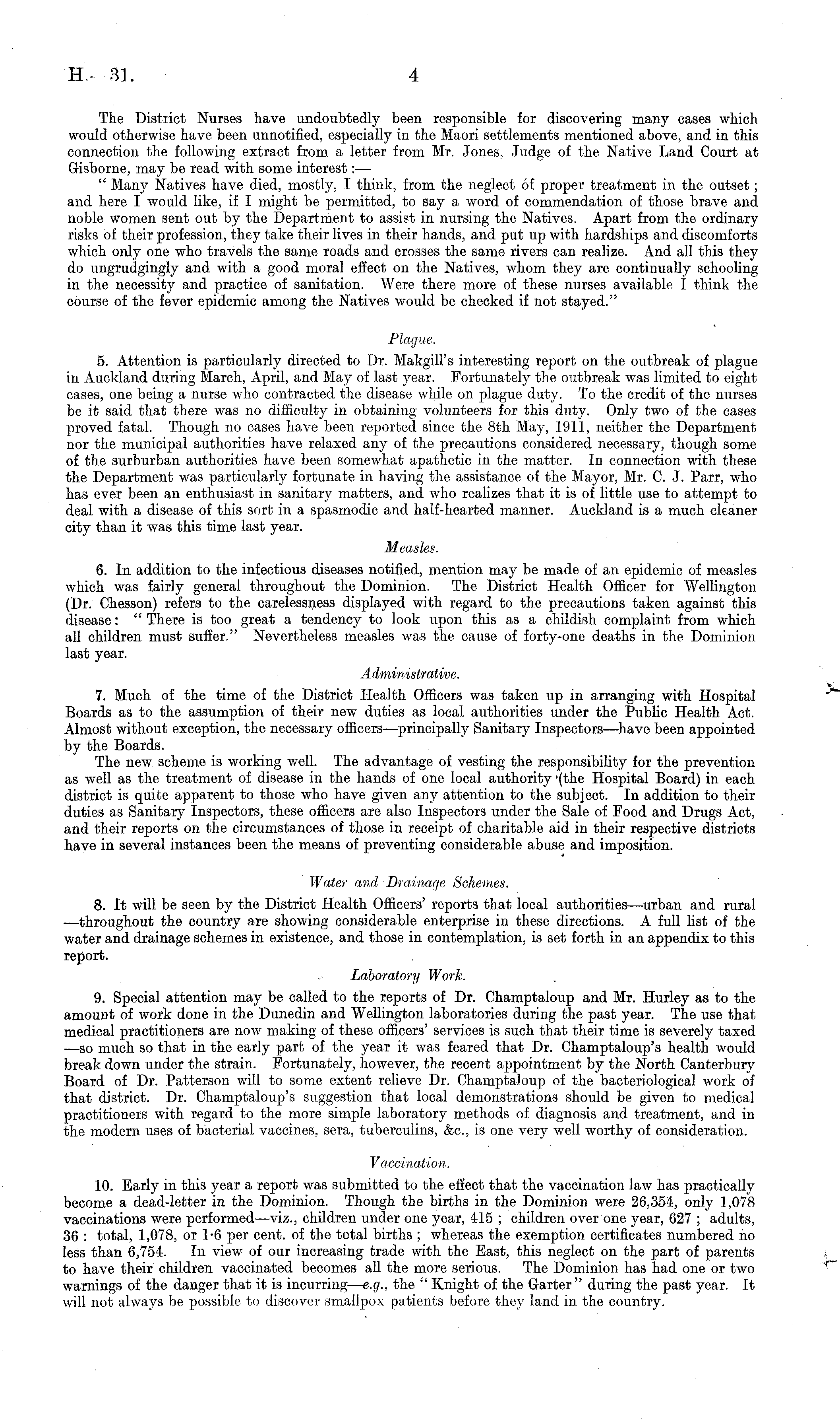 The District Nurses have undoubtedly been responsible for discovering many cases which would otherwise have been unnotified, especially in the Maori settlements mentioned above, and in this connection the following extract from a letter from Mr. Jones, Judge of the Native Land Court at Gisborne, may be read with some interest: — " Many Natives have died, mostly, I think, from the neglect of proper treatment in the outset; and here I would like, if I might be permitted, to say a word of commendation of those brave and noble women sent out by the Department to assist in nursing the Natives. Apart from the ordinary risks of their profession, they take their lives in their hands, and put up with hardships and discomforts which only one who travels the same roads and crosses the same rivers can realize. And all this they do ungrudgingly and with a good moral effect on the Natives, whom they are continually schooling in the necessity and practice of sanitation. Were there more of these nurses available I think the course of the fever epidemic among the Natives would be checked if not stayed." Plague. 5. Attention is particularly directed to Dr. Makgill's interesting report on the outbreak of plague in Auckland during March, April, and May of last year. Fortunately the outbreak was limited to eight cases, one being a nurse who contracted the disease while on plague duty. To the credit of the nurses be it said that there was no difficulty in obtaining volunteers for this duty. Only two of the cases proved fatal. Though no cases have been reported since the Bth May, 1911, neither the Department nor the municipal authorities have relaxed any of the precautions considered necessary, though some of the surburban authorities have been somewhat apathetic in the matter. In connection with these the Department was particularly fortunate in having the assistance of the Mayor, Mr. C. J. Parr, who has ever been an enthusiast in sanitary matters, and who realizes that it is of little use to attempt to deal with a disease of this sort in a spasmodic and half-hearted manner. Auckland is a much cleaner city than it was this time last year. Measles. 6. In addition to the infectious diseases notified, mention may be made of an epidemic of measles which was fairly general throughout the Dominion. The District Health Officer for Wellington (Dr. Chesson) refers to the carelessness displayed with regard to the precautions taken against this disease: " There is too great a tendency to look upon this as a childish complaint from which all children must suffer." Nevertheless measles was the cause of forty-one deaths in the Dominion last year. Administrative. 7. Much of the time of the District Health Officers was taken up in arranging with Hospital Boards as to the assumption of their new duties as local authorities under the Public Health Act. Almost without exception, the necessary officers—principally Sanitary Inspectors—have been appointed by the Boards. The new scheme is working well. The advantage of vesting the responsibility for the prevention as well as the treatment of disease in the hands of one local authority '(the Hospital Board) in each district is quite apparent to those who have given any attention to the subject. In addition to their duties as Sanitary Inspectors, these officers are also Inspectors under the Sale of Food and Drugs Act, and their reports on the circumstances of those in receipt of charitable aid in their respective districts have in several instances been the means of preventing considerable abuse and imposition. Water and Drainage Schemes. 8. It will be seen by the District Health Officers' reports that local authorities—urban and rural —throughout the country are showing considerable enterprise in these directions. A full list of the water and drainage schemes in existence, and those in contemplation, is set forth in an appendix to this report. Laboratory Work. 9. Special attention may be called to the reports of Dr. Champtaloup and Mr. Hurley as to the amount of work done in the Dunedin and Wellington laboratories during the past year. The use that medical practitioners are now making of these officers' services is such that their time is severely taxed —so much so that in the early part of the year it was feared that Dr. Champtaloup's health would break down under the strain. Fortunately, however, the recent appointment by the North Canterbury Board of Dr. Patterson will to some extent relieve Dr. Champtaloup of the bacteriological work of that district. Dr. Champtaloup's suggestion that local demonstrations should be given to medical practitioners with regard to the more simple laboratory methods of diagnosis and treatment, and in the modern uses of bacterial vaccines, sera, tuberculins, &c, is one very well worthy of consideration. Vaccination. 10. Early in this year a report was submitted to the effect that the vaccination law has practically become a dead-letter in the Dominion. Though the births in the Dominion were 26,354, only 1,078 vaccinations were performed —viz., children under one year, 415 ; children over one year, 627 ; adults, 36 : total, 1,078, or 1-6 per cent, of the total births ; whereas the exemption certificates numbered no less than 6,754. In view of our increasing trade with the East, this neglect on the part of parents to have their children vaccinated becomes all the more serious. The Dominion has had one or two warnings of the danger that it is incurring— e.g., the "Knight of the Garter" during the past year. It will not always be possible to discover smallpox patients before they land in the country.