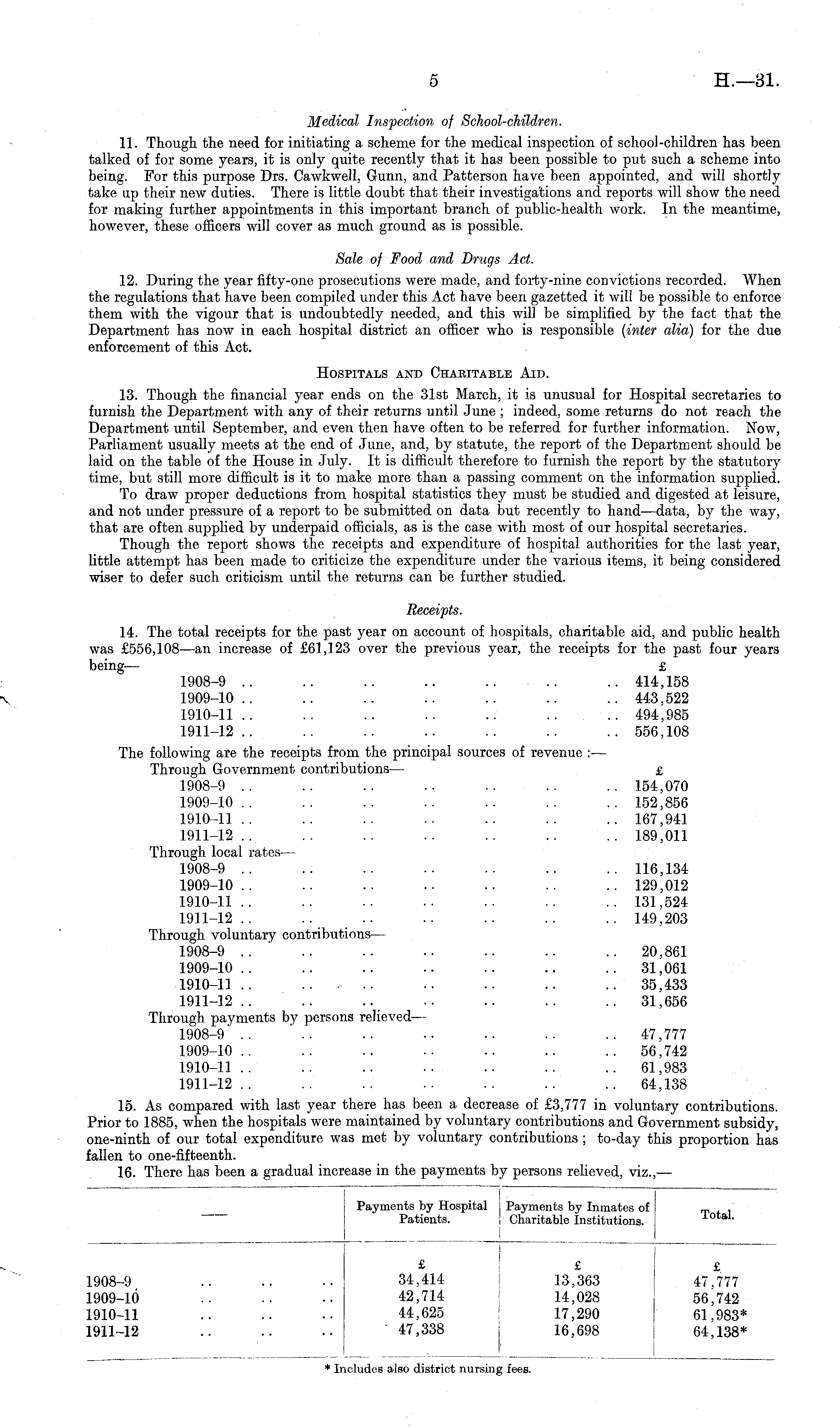 Medical Inspection of School-children. 11. Though the need for initiating a scheme for the medical inspection of school-children has been talked of for some years, it is only quite recently that it has been possible to put such a scheme into being. For this purpose Drs. Cawkwell, Gunn, and Patterson have been appointed, and will shortly take up their new duties. There is little doubt that their investigations and reports will show the need for making further appointments in this important branch of public-health work. In the meantime, however, these officers will cover as much ground as is possible. Sale of Food and Drugs Act. 12. During the year fifty-one prosecutions were made, and forty-nine convictions recorded. When the regulations that have been compiled under this Act have been gazetted it will be possible to enforce them with the vigour that is undoubtedly needed, and this will be simplified by the fact that the Department has now in each hospital district an officer who is responsible (inter alia) for the due enforcement of this Act. Hospitals and Charitable Aid. 13. Though the financial year ends on the 31st March, it is unusual for Hospital secretaries to furnish the Department with any of their returns until June ; indeed, some returns do not reach the Department until September, and even then have often to be referred for further information. Now, Parliament usually meets at the end of June, and, by statute, the report of the Department should be laid on the table of the House in July. It is difficult therefore to furnish the report by the statutory time, but still more difficult is it to make more than a passing comment on the information supplied. To draw proper deductions from hospital statistics they must be studied and digested at leisure, and not under pressure of a report to be submitted on data but recently to hand—data, by the way, that are often supplied by underpaid officials, as is the case with most of our hospital secretaries. Though the report shows the receipts and expenditure of hospital authorities for the last year, little attempt has been made to criticize the expenditure under the various items, it being considered wiser to defer such criticism until the returns can be further studied. Receipts. 14. The total receipts for the past year on account of hospitals, charitable aid, and public health was £556,108 —an increase of £61,123 over the previous year, the receipts for the past four years being— £ 1908-9 .. .. .. .. .. .. .. 414,158 1909-10 .. .. .. .. .. .. .. 443,522 1910-11 .. .. .. .. .. ..... 494,985 1911-12 .. .. .. .. .. .. .. 556,108 The following are the receipts from the principal sources of revenue : — Through Government contributions— £ 1908-9 .. .. .. .. .. .. .. 154,070 1909-10 .. .. .. .. .. .. .. 152.856 1910-11 .. .. .. .. .. .. .. 167,941 1911-12 .. .. .. .. .. .. .. 189,011 Through local rates — 1908-9 .. .. .. .. .. ... .. 116,134 1909-10 .. .. .. .. .. .. .. 129,012 1910-11 .. .. .. .. .. .. .. 131,524 1911-12 .. .. .. .. .. .. .. 149,203 Through voluntary contributions — 1908-9 .. .. .. •• .. .. .. 20,861 1909-10 .. .. .. .. .. .. .. 31,061 1910-11 .. ..... .. .. .. .. 35,433 1911-12 .. .. .. •• .. .. .. 31,656 Through payments by persons relieved— 1908-9 .. ' .. .. .. .. .. .. 47,777 1909-10 .. .. .. .. .. .. .. 56,742 1910-11 .. .. .. .. .. .. .. 61,983 1911-12 .. .. .. .. .. .. ..64,138 15. As compared with last year there has been a decrease of £3,777 in voluntary contributions. Prior to 1885, when the hospitals were maintained by voluntary contributions and Government subsidy, one-ninth of our total expenditure was met by voluntary contributions ; to-day this proportion has fallen to one-fifteenth. 16. There has been a gradual increase in the payments by persons relieved, viz.,—