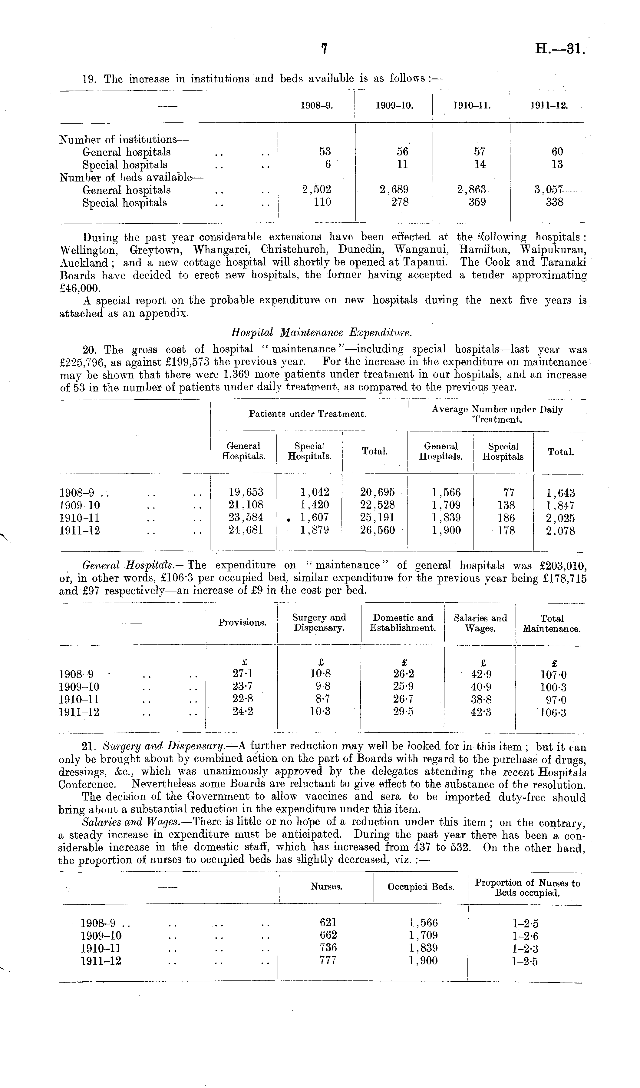 General Hospitals. —The expenditure on "maintenance" of general hospitals was £203,010, or, in other words, £106.3 per occupied bed, similar expenditure for the previous year being £178,715 and £97 respectively —an increase of £9 in the cost per bed.
