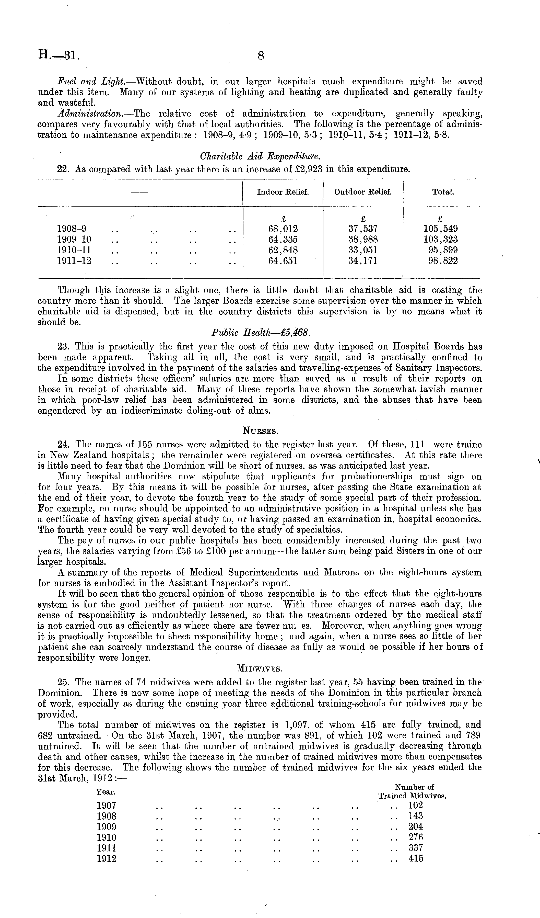 Though this increase is a slight one, there is little doubt that charitable aid is costing the country more than it should. The larger Boards exercise some supervision over the manner in which charitable aid is dispensed, but in the country districts this supervision is by no means what it should be. Public Health—£s,46B. 23. This is practically the first year the cost of this new duty imposed on Hospital Boards has been made apparent. Taking all in all, the cost is very small, and is practically confined to the expenditure involved in the payment of the salaries and travelling-expenses of Sanitary Inspectors. In some districts these officers' salaries are more than saved as a result of their reports on those in receipt of charitable aid. Many of these reports have shown the somewhat lavish manner in which poor-law relief has been administered in some districts, and the abuses that have been engendered by an indiscriminate doling-out of alms. Nurses. 24. The names of 155 nurses were admitted to the register last year. Of these, 111 were traine in New Zealand hospitals ; the remainder were registered on oversea certificates. At this rate there is little need to fear that the Dominion will be short of nurses, as was anticipated last year. Many hospital authorities now stipulate that applicants for probationerships must sign on for four years. By this means it will be possible for nurses, after passing the State examination at the end of their year, to devote the fourth year to the study of some special part of their profession. For example, no nurse should be appointed to an administrative position in a hospital unless she has a certificate of having given special study to, or having passed an examination in, hospital economics. The fourth year could be very well devoted to the study of specialties. The pay of nurses in our public hospitals has been considerably increased during the past two years, the salaries varying from £56 to £100 per annum—the latter sum being paid Sisters in one of our larger hospitals. A summary of the reports of Medical Superintendents and Matrons on the eight-hours system for nurses is embodied in the Assistant Inspector's report. It will be seen that the general opinion of those responsible is to the effect that the eight-hours system is for the good neither of patient nor nurae. With three changes of nurses each day, the sense of responsibility is undoubtedly lessened, so that the treatment ordered by the medical staff is not carried out as efficiently as where there are fewer nui es. Moreover, when anything goes wrong it is practically impossible to sheet responsibility home ; and again, when a nurse sees so little of her patient she can scarcely understand the course of disease as fully as would be possible if her hours of responsibility were longer. Midwives. 25. The names of 74 midwives were added to the register last year, 55 having been trained in the Dominion. There is now some hope of meeting the needs of the Dominion in this particular branch of work, especially as during the ensuing year three additional training-schools for midwives may be provided. The total number of midwives on the register is 1,097, of whom 415 are fully trained, and 682 untrained. On the 31st March, 1907, the number was 891, of which 102 were trained and 789 untrained. It will be seen that the number of untrained midwives is gradually decreasing through death and other causes, whilst the increase in the number of trained midwives more than compensates for this decrease. The following shows the number of trained midwives for the six years ended the 31st March, 1912 : — y. Number of x oar ' Trained Midwives. 1907 .. .. .. .. .. .. ..102 1908 .. .. .. .. .. .. ..143 1909 .. .. .. .. .. .. ..204 1910 .. .. .. .. .. .. ..276 1911 337 1912 .. .. .. .. .. .. ..415